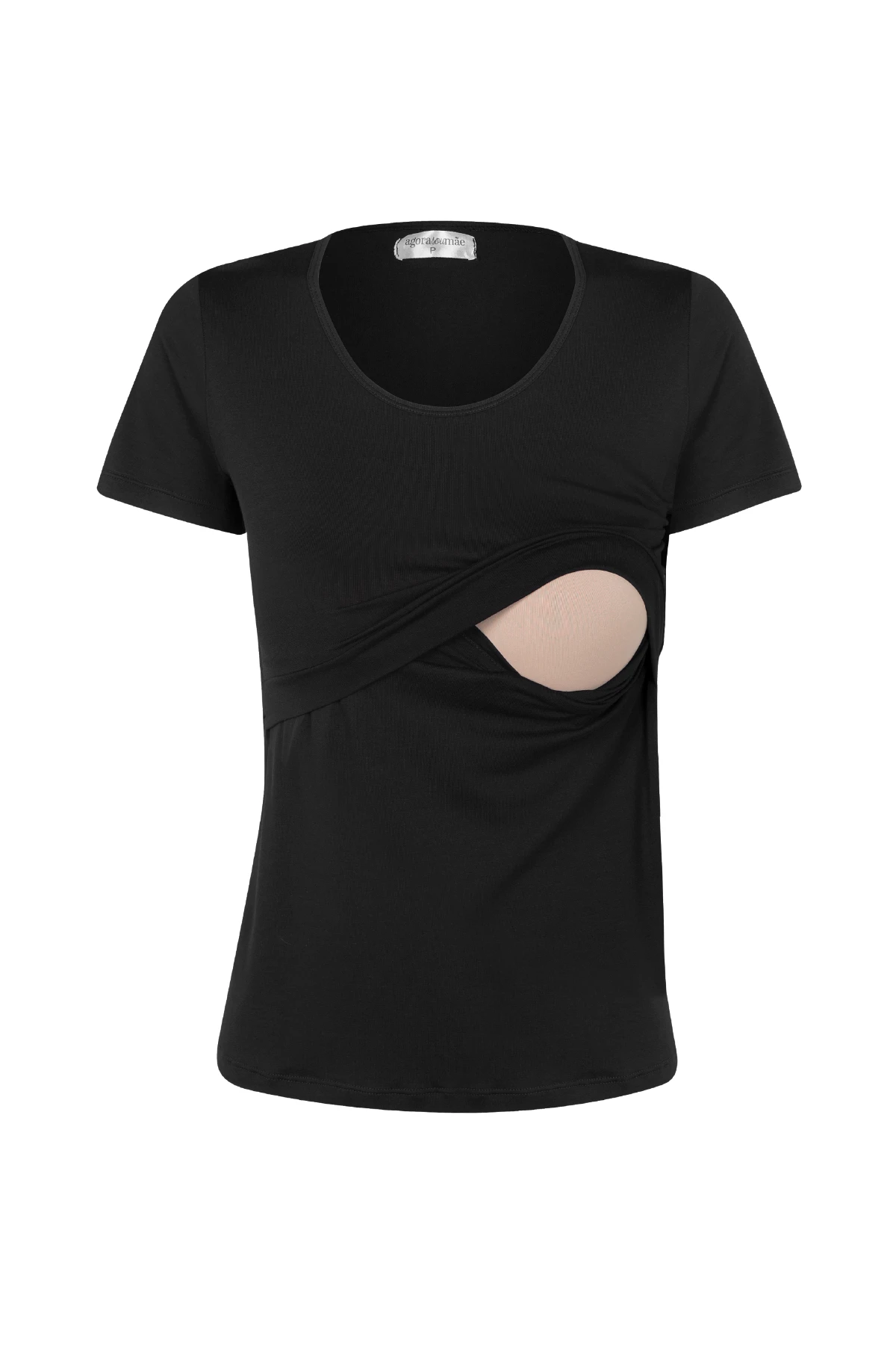 T-shirt com modelagem justinha, com tecido em viscolycra flexível, macia e confortável. Possui uma sobreposição com decote interno para a amamentação. Use em todas as fases da maternidade, inclusive na gestação.