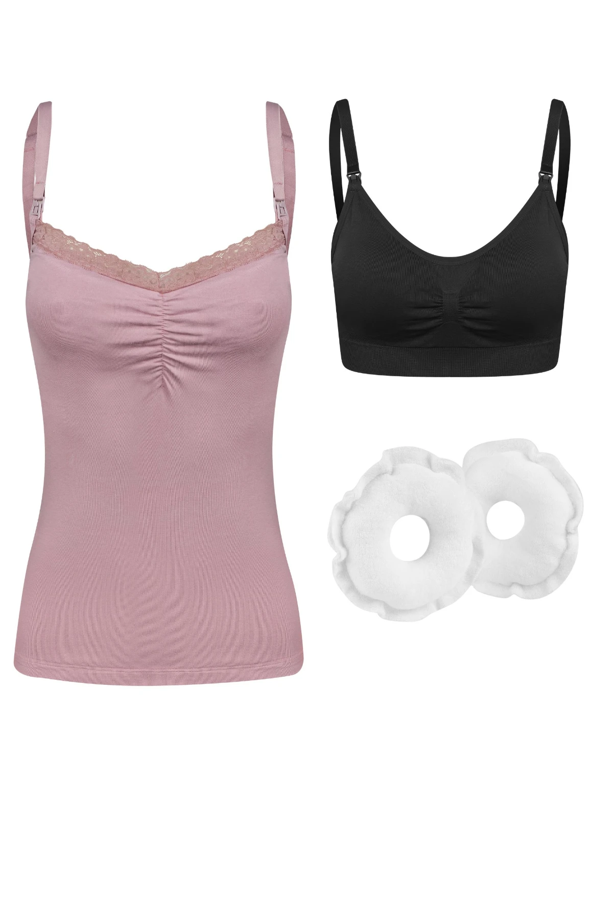 Kit com 3 peças essenciais para a amamentação: regata dupla com alça destacável, sutiã com bojo removível e rosquinhas protetoras de seios.