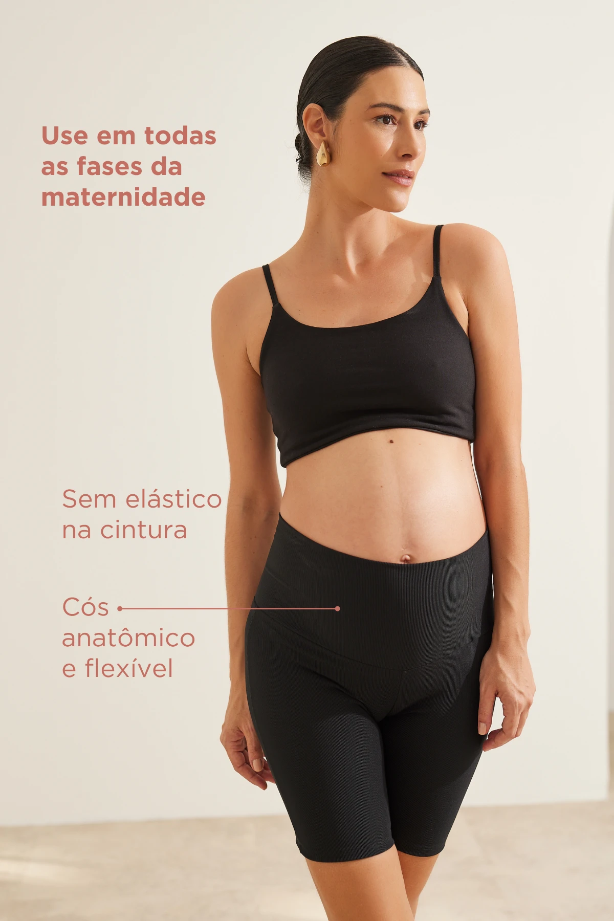 Bermuda confeccionada em malha canelada, desenvolvida para se adaptar ao crescimento da barriga sem apertar. Use em todas as fases da maternidade.