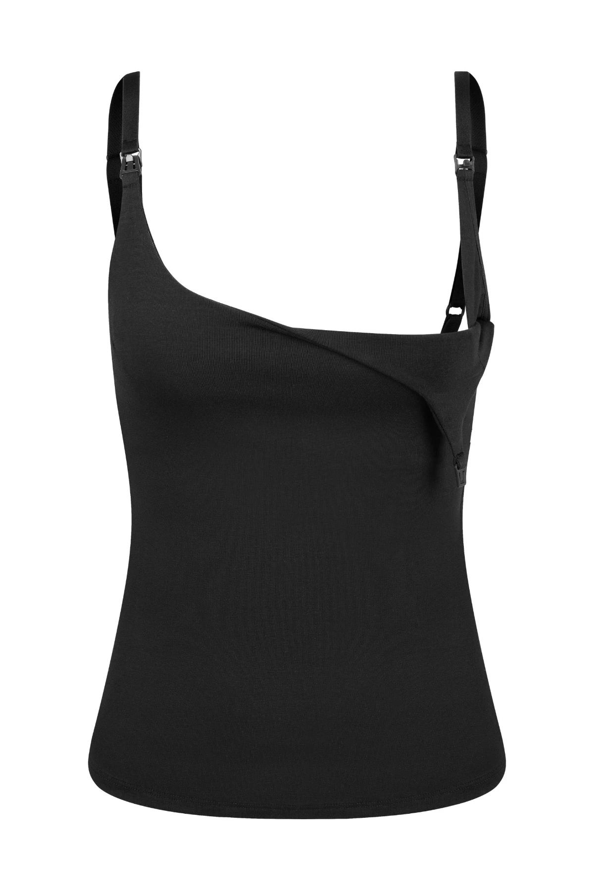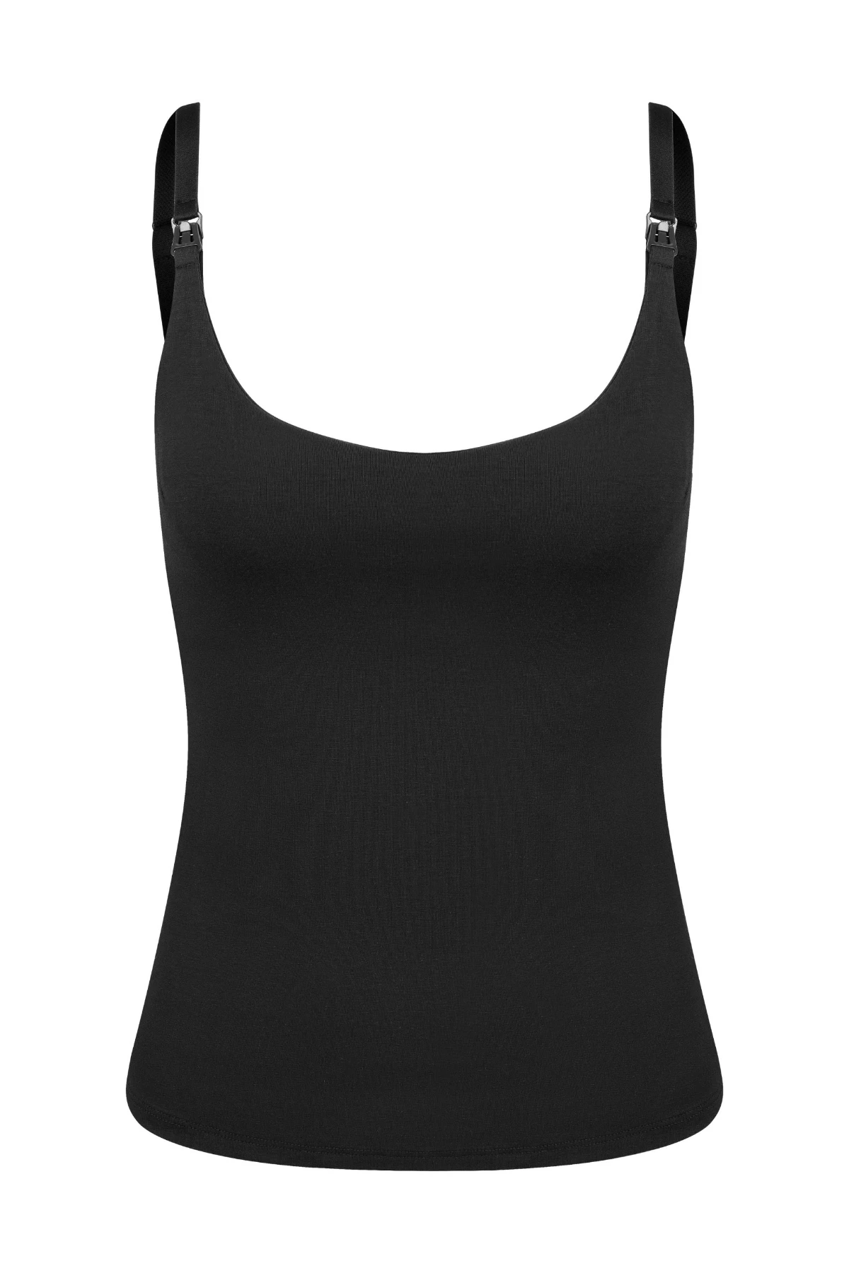 Feita em algodão premium, adapta-se ao corpo e possui alças com fecho click, busto duplo e elástico interno para amamentar com facilidade e conforto.