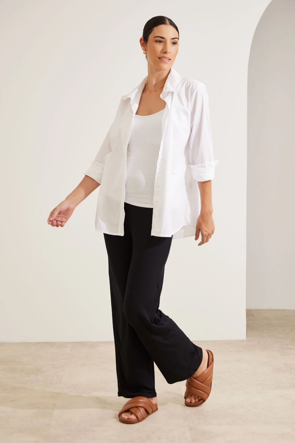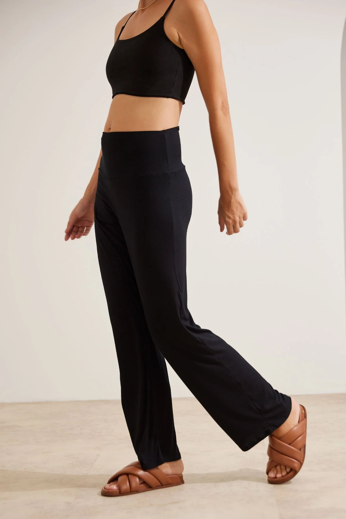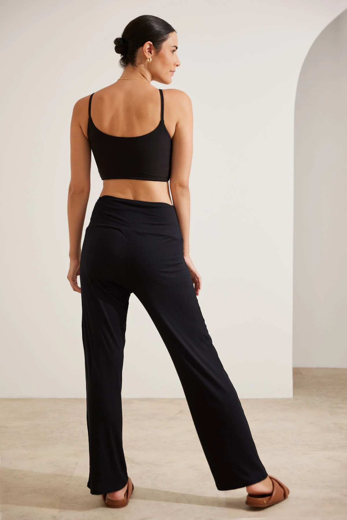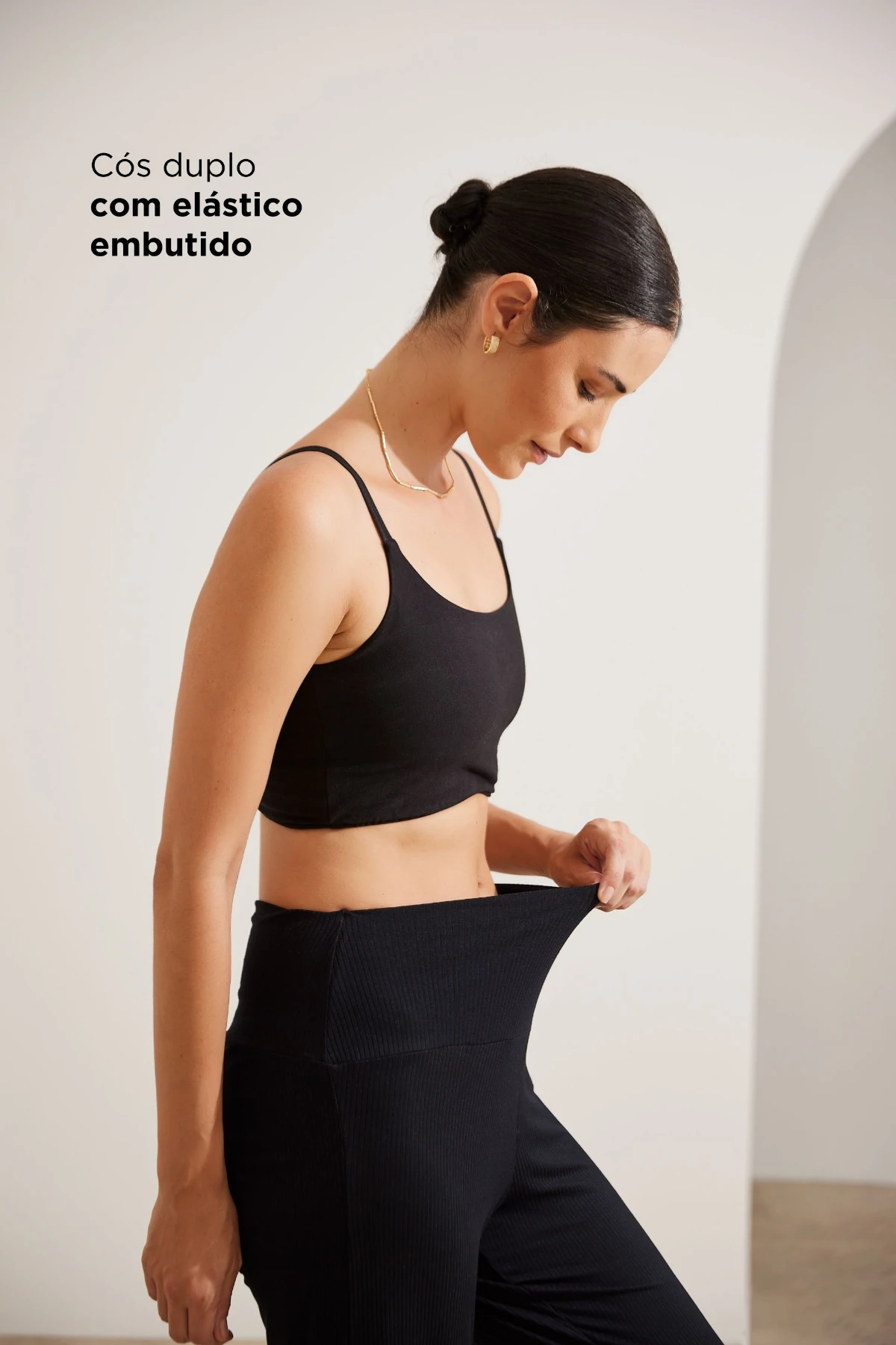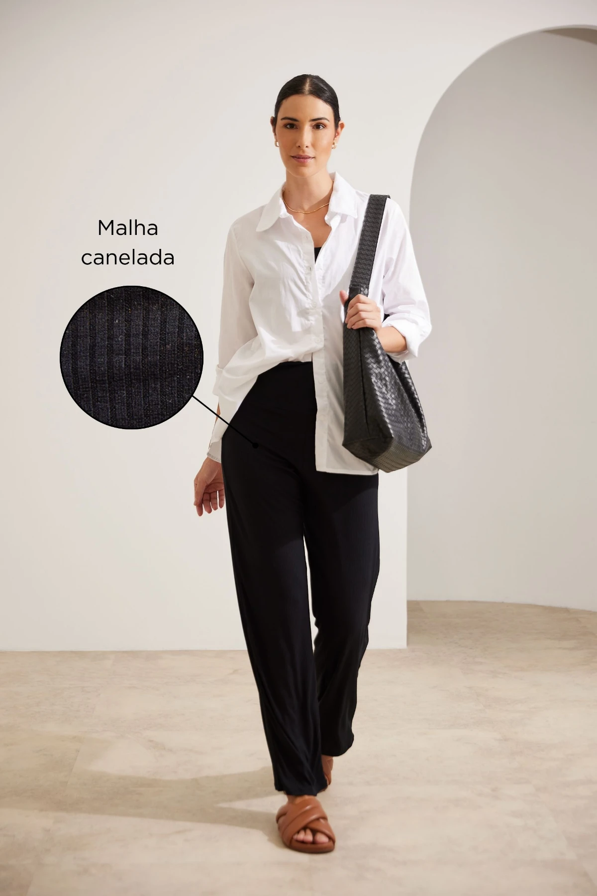 Calça de malha canelada macia para gestação e pós-parto. Tem modelagem reta e cós duplo com elástico fino, garantindo um ajuste anatômico e confortável e acompanhando o crescimento da barriga sem apertar.