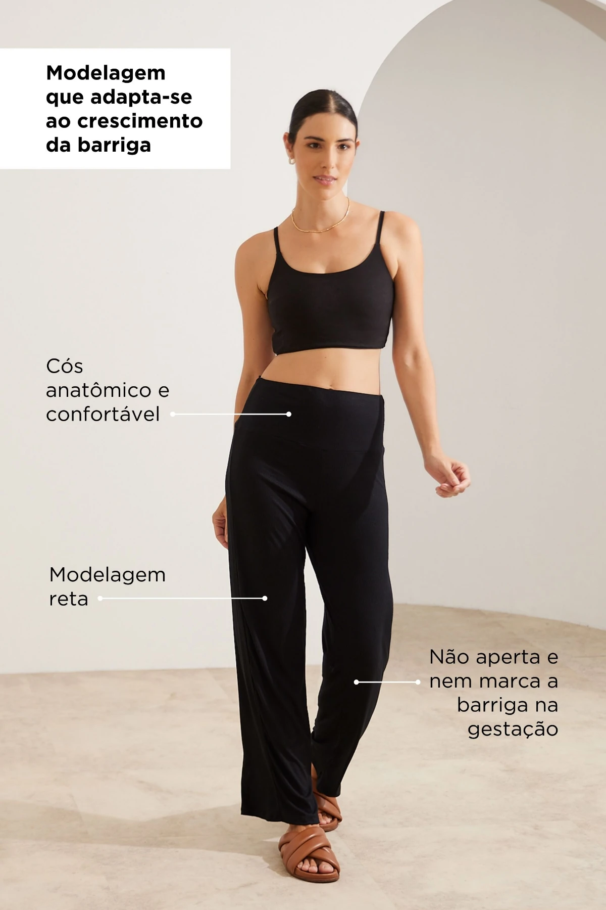 Calça produzida com malha canelada macia ao toque, ideal para usar durante a gestação e também no pós-parto, pois a malha não danifica durante o uso. Modelagem reta, cós duplo com elástico fino embutido anatômico e confortável, que acompanha o crescimento da barriga sem apertar ou marcar.