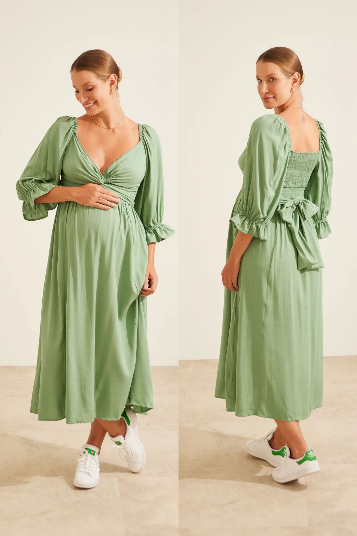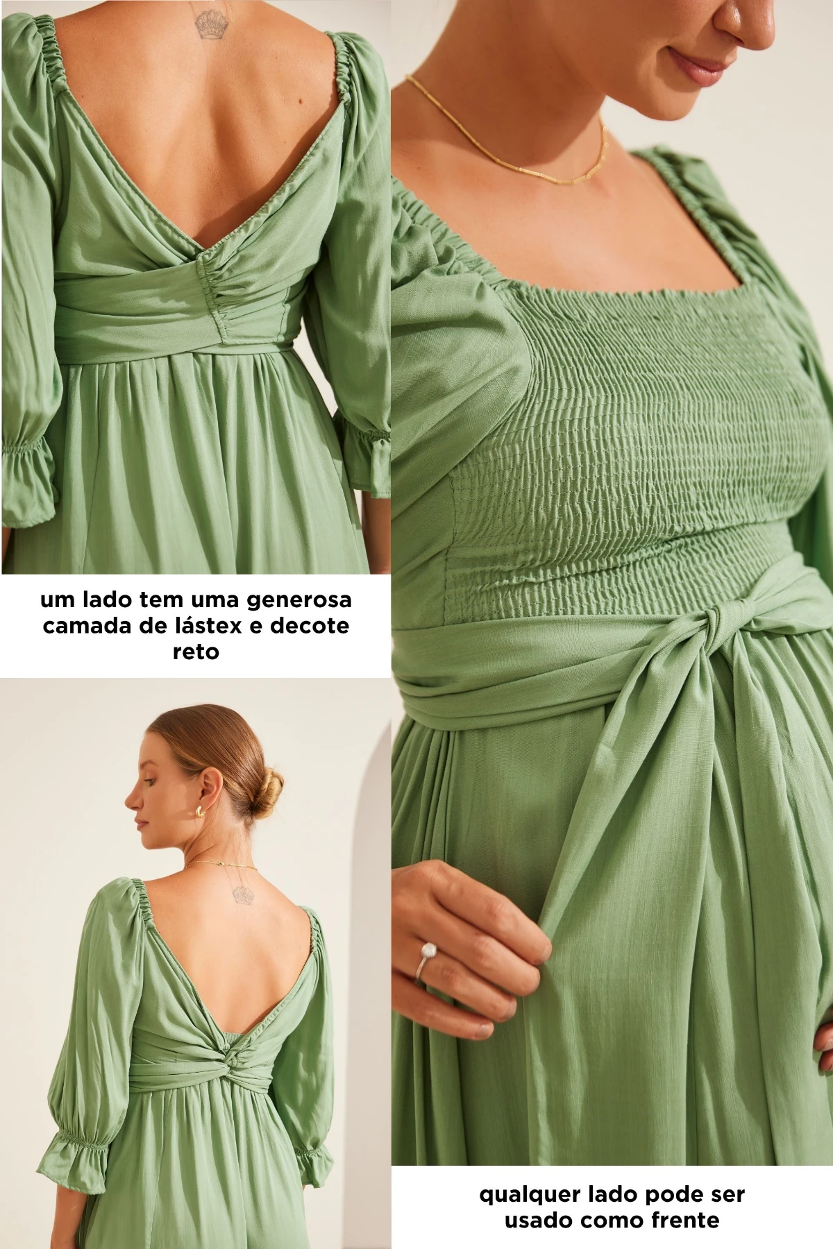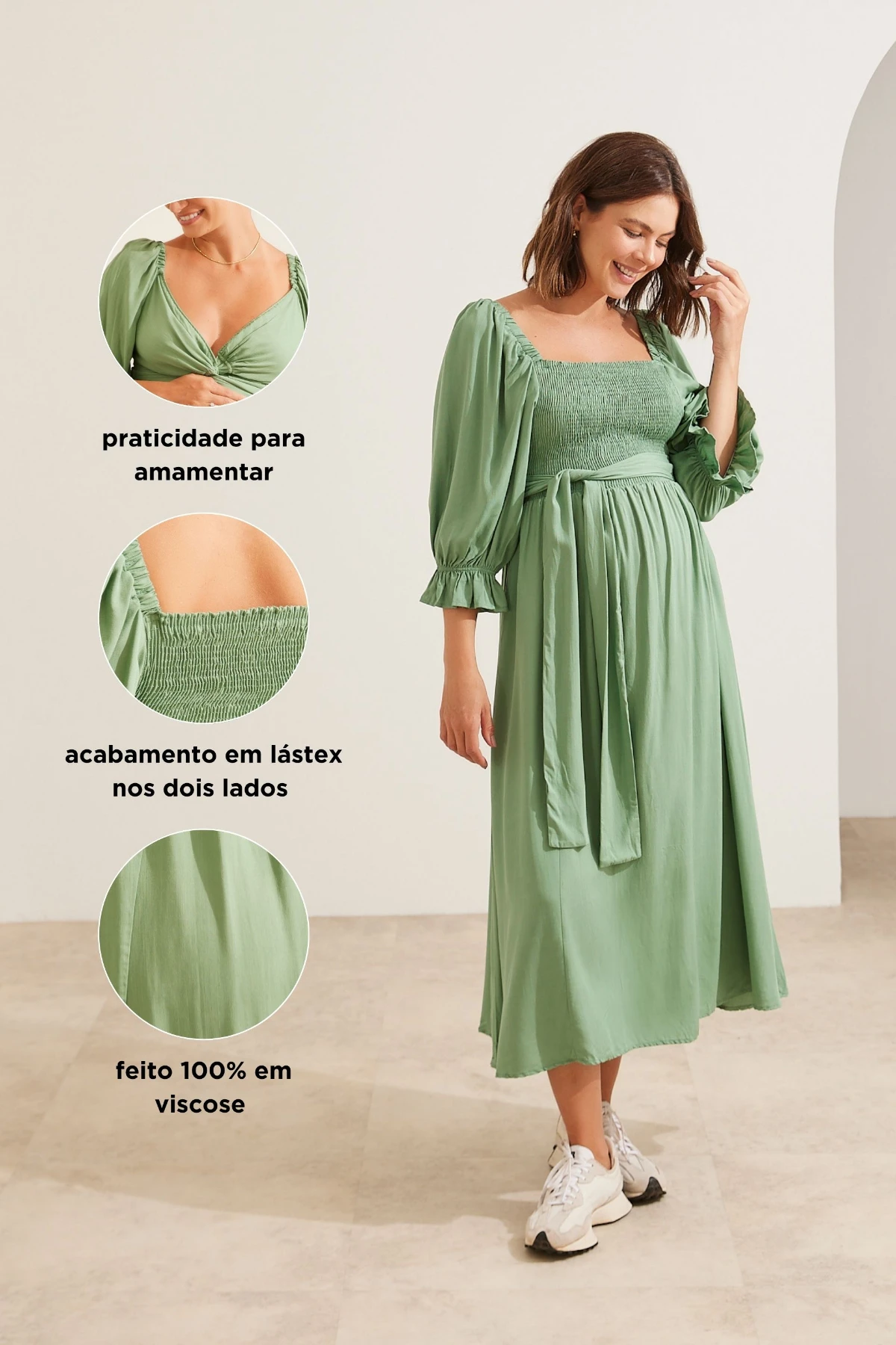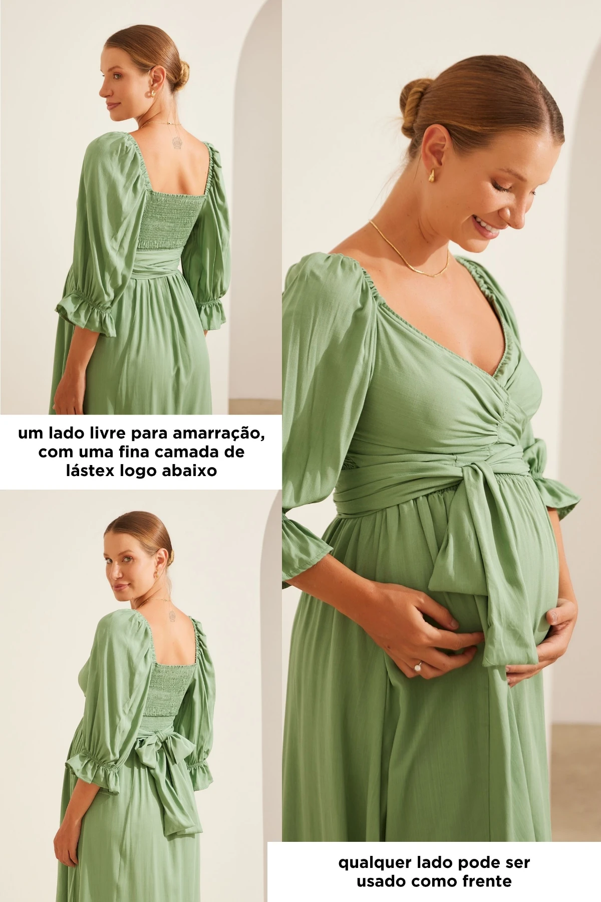 Vestido midi com forro, produzido viscose 100%. Mangas bufantes e 3/4 com elásticos. Qualquer um dos lados pode ser usado como frente: um lado com lástex e outro com amarração. Essa também pode ser usada de diversas maneiras, possibilitando a criação de looks variados. É uma peça versátil para usar em todos os momentos da maternidade.