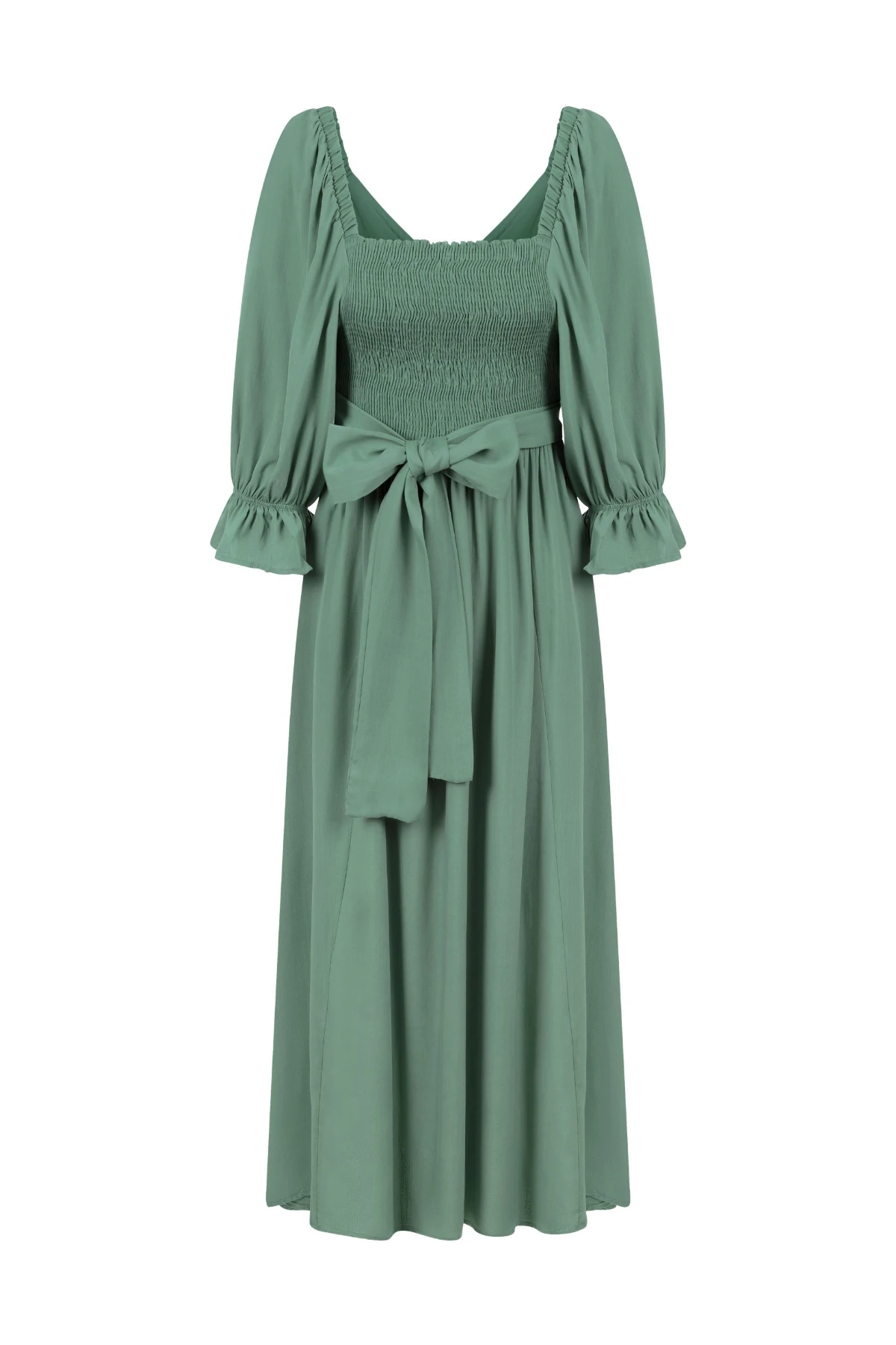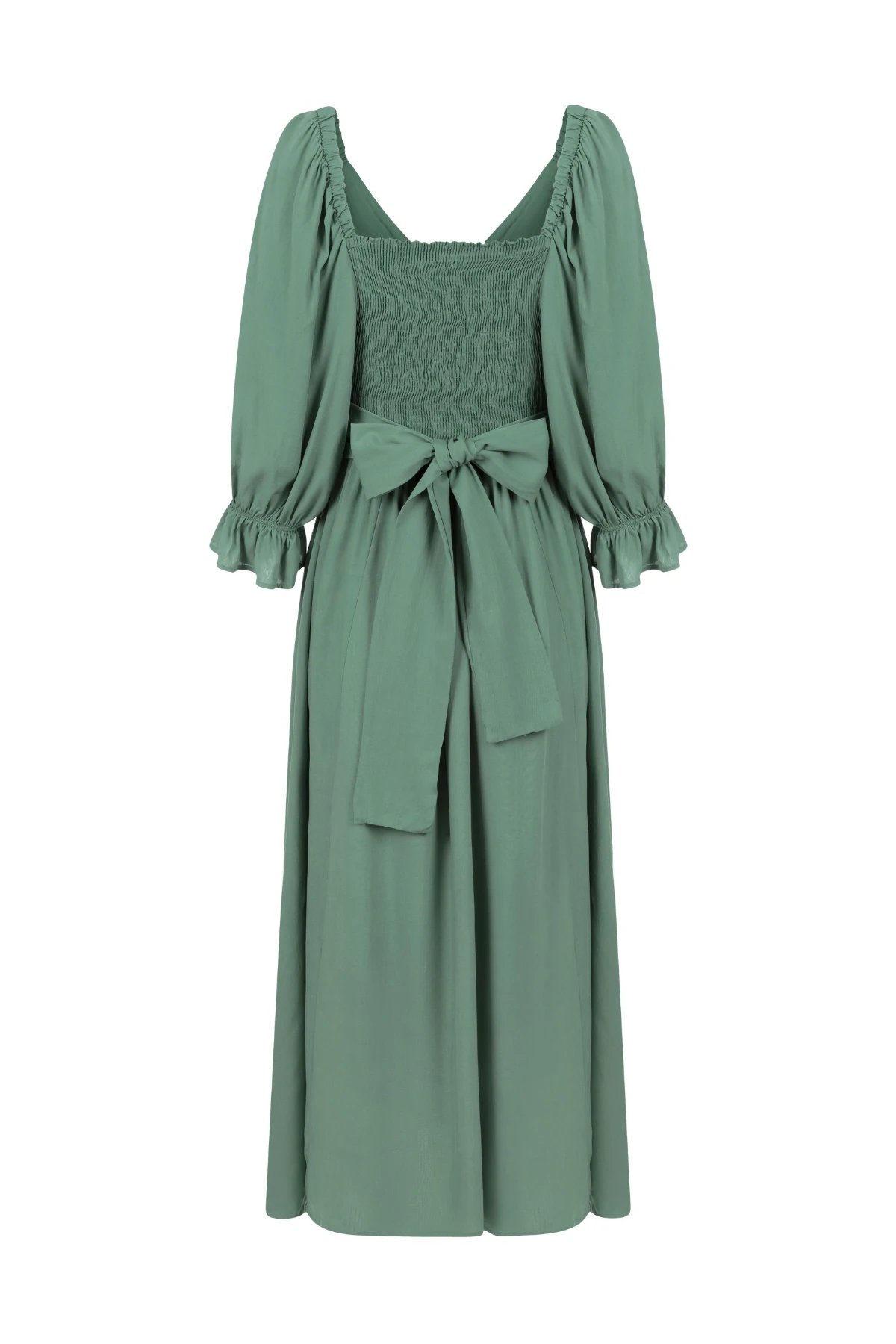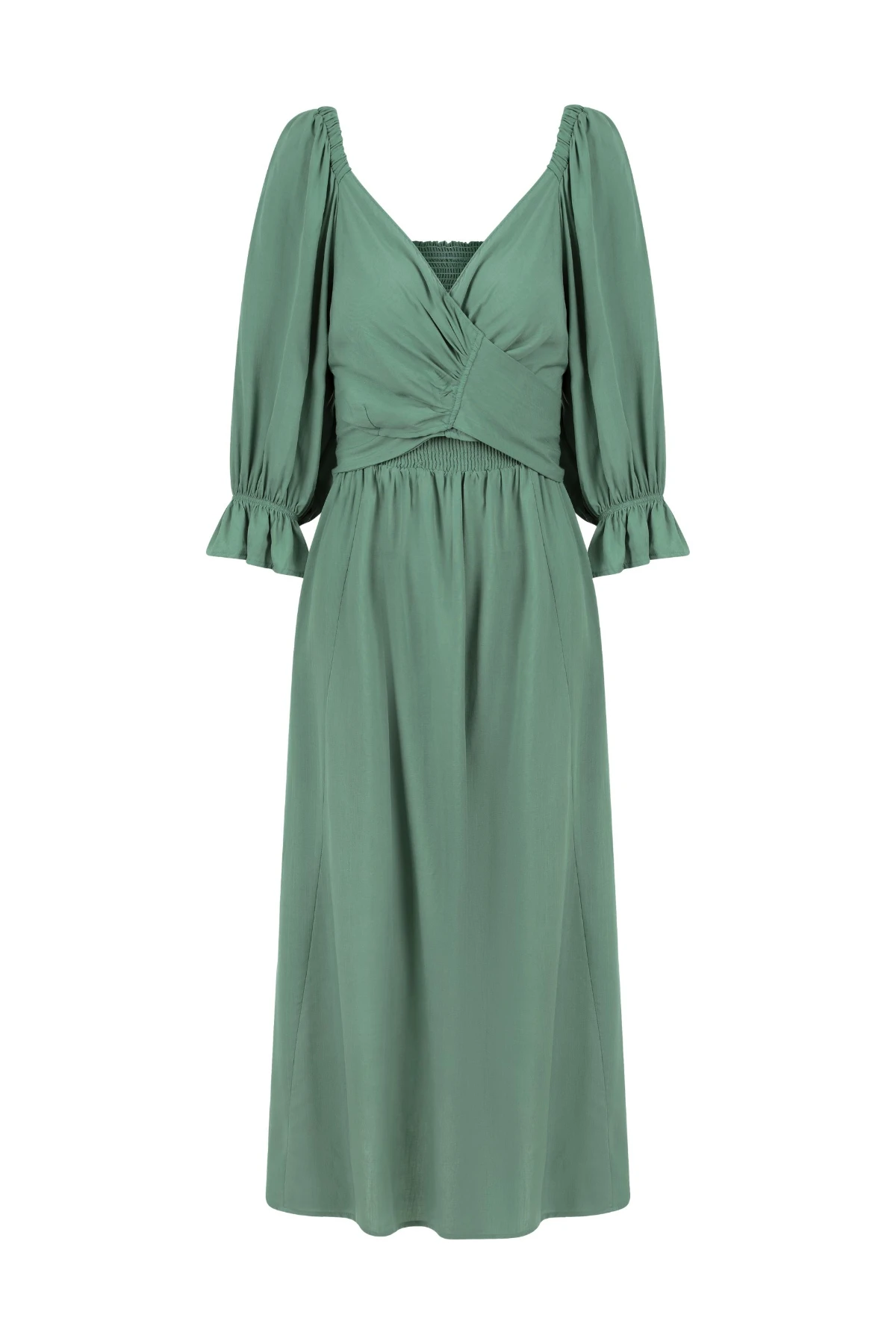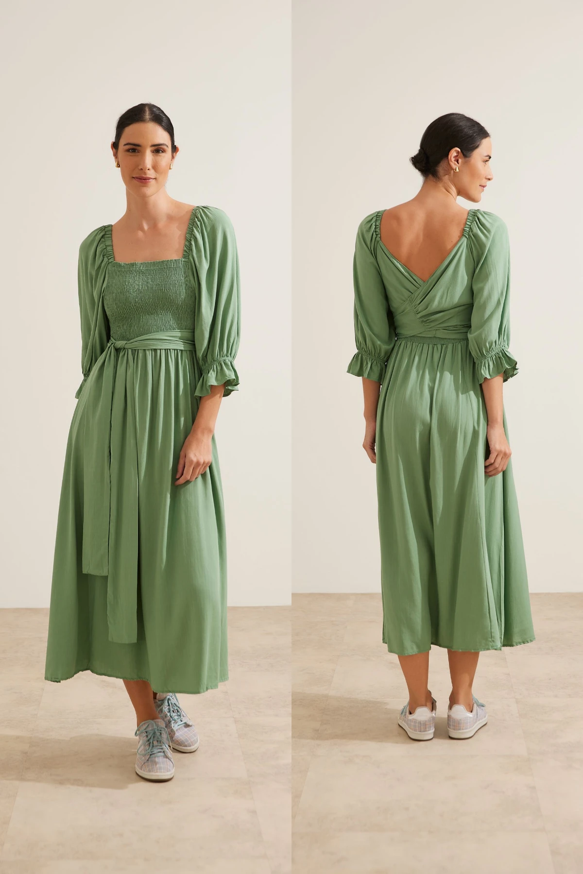 Vestido midi com forro, produzido viscose 100%. Mangas bufantes e 3/4 com elásticos. Qualquer um dos lados pode ser usado como frente: um lado com lástex e outro com amarração. Essa também pode ser usada de diversas maneiras, possibilitando a criação de looks variados. É uma peça versátil para usar em todos os momentos da maternidade.