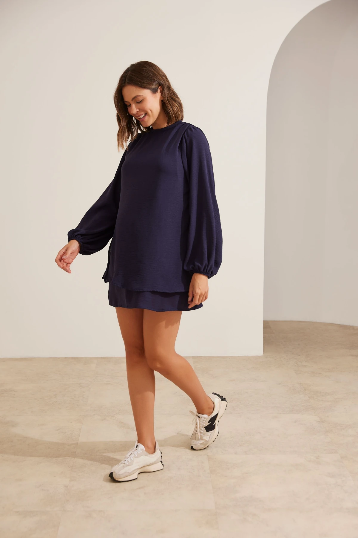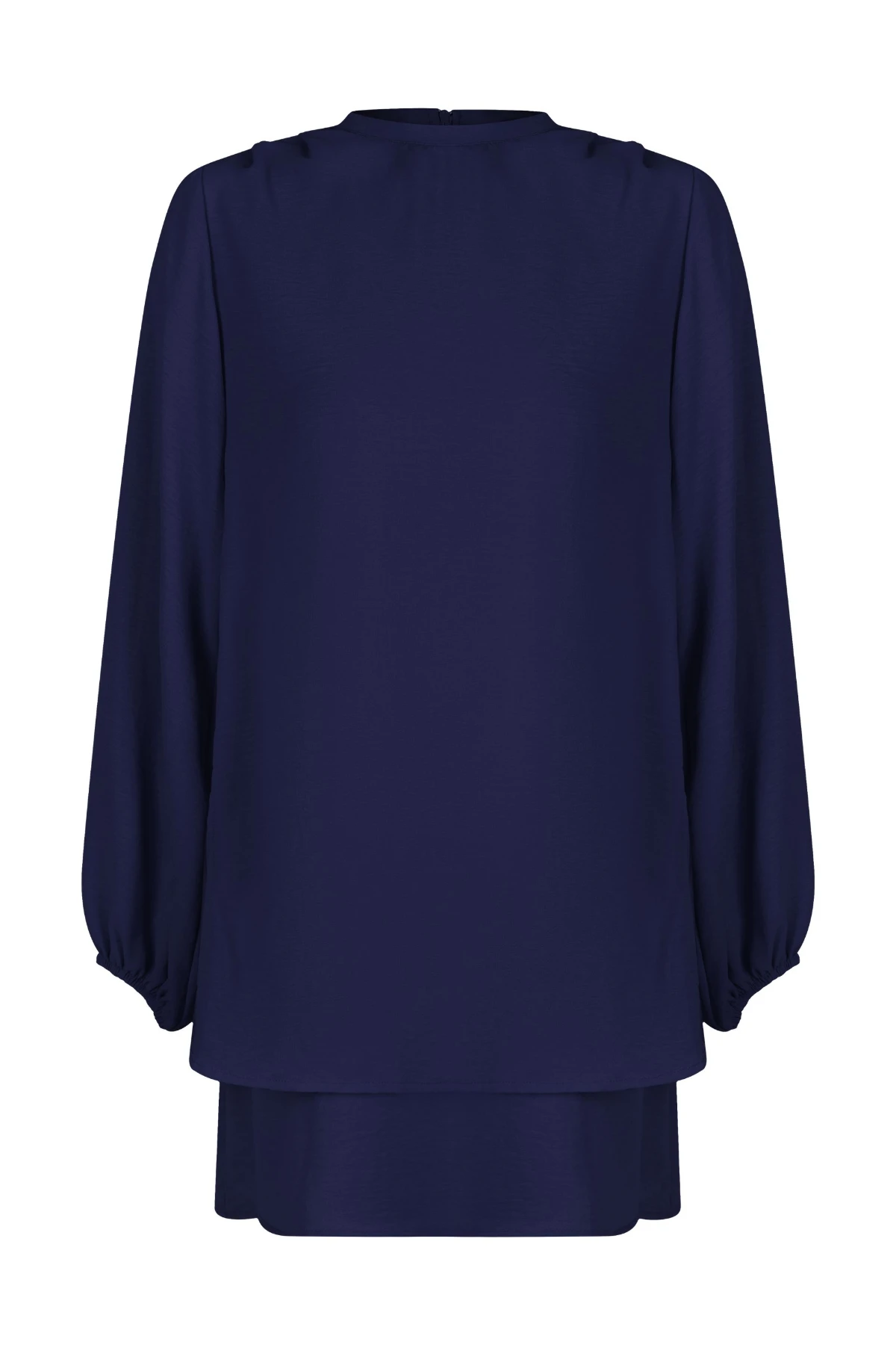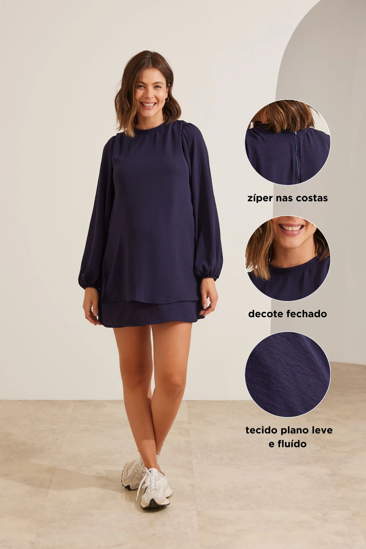 Vestido curto, manga longa soltinha com elástico embutido nos punhos para melhor ajuste, produzido em tecido plano, leve e fluído. A sobreposição tem decote fechado com zíper nas costas, possui fenda nas laterais que garante uma facilidade para amamentar, pois conta com forro interno e abertura fácil. Possui drapeado nos ombros, proporcionando um ótimo caimento ao corpo, acompanhando o crescimento da barriga durante toda a gestação.