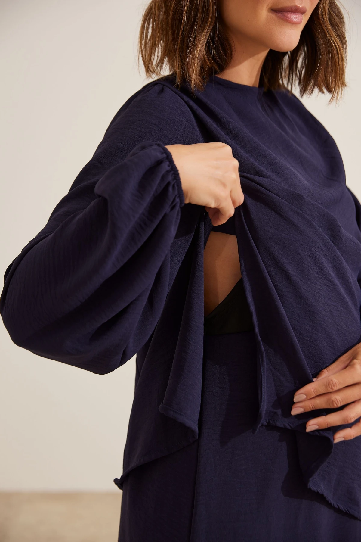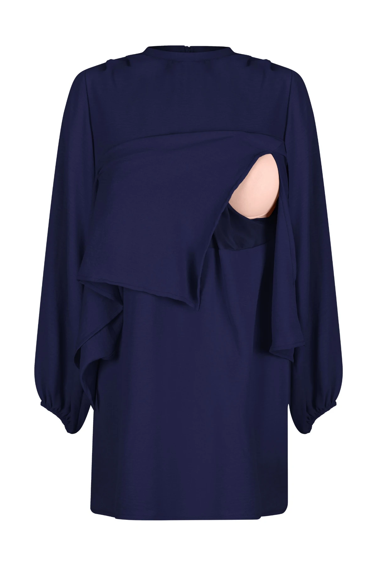 Vestido clássico em tecido plano, leve e fluído com corte ideal para amamentar e usar toda a gestação. Drapeado nos ombros e mangas longas, possui elástico no punho para melhor regulagem. Seu decote fechado com zíper nas costas, fenda lateral e decote interno para amamentação.
