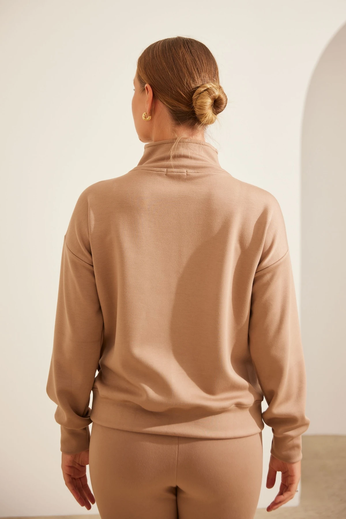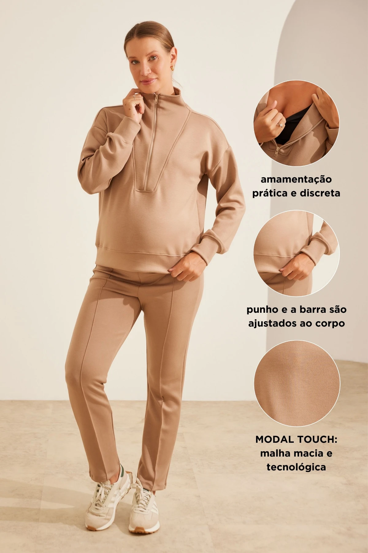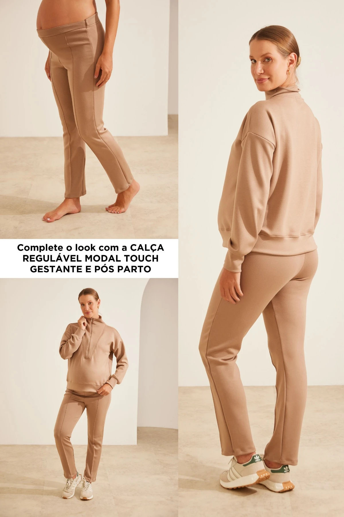 Blusa em malha que simula o toque macio do modal. O zíper na parte frontal tem a medida ideal para uma amamentação prática. A gola pode ser usada dobrada ou alta até o pescoço. A peça tem muita elasticidade e corte ideal para acompanhar toda a gestação.