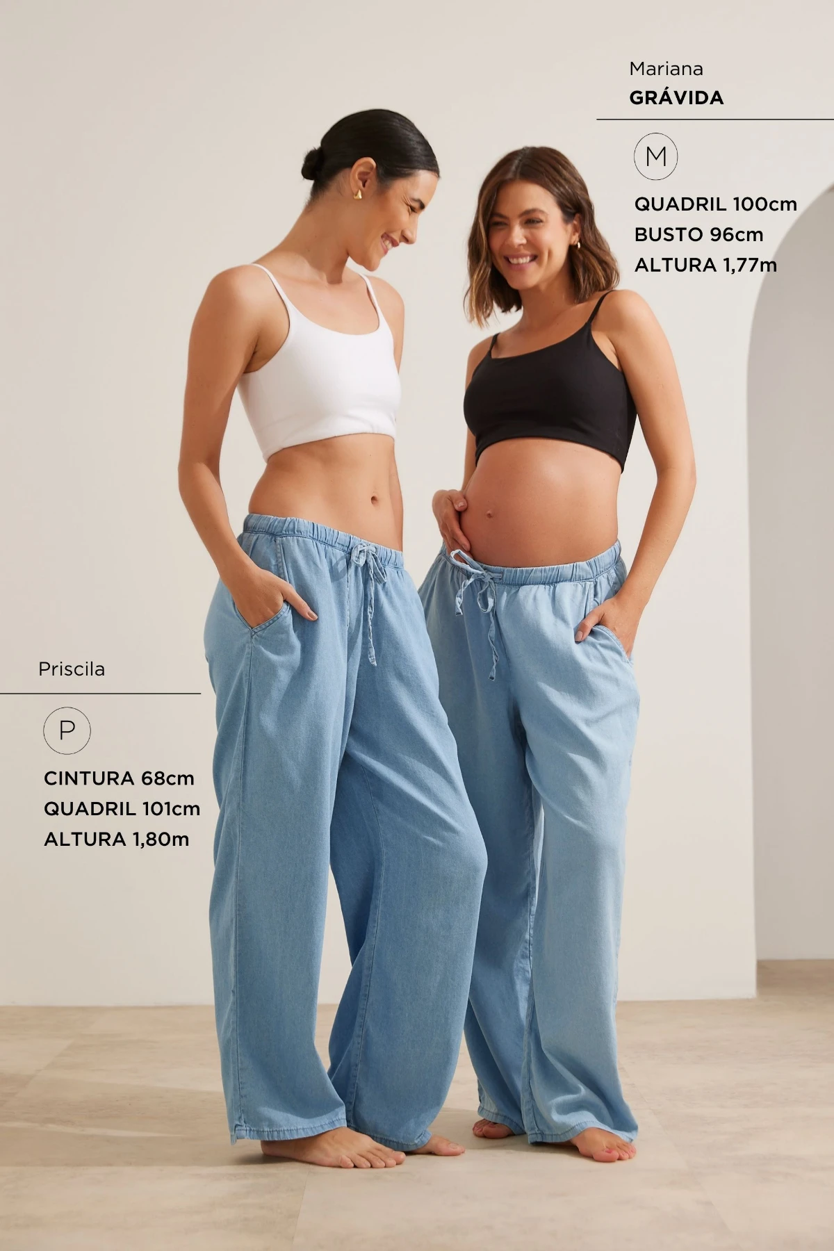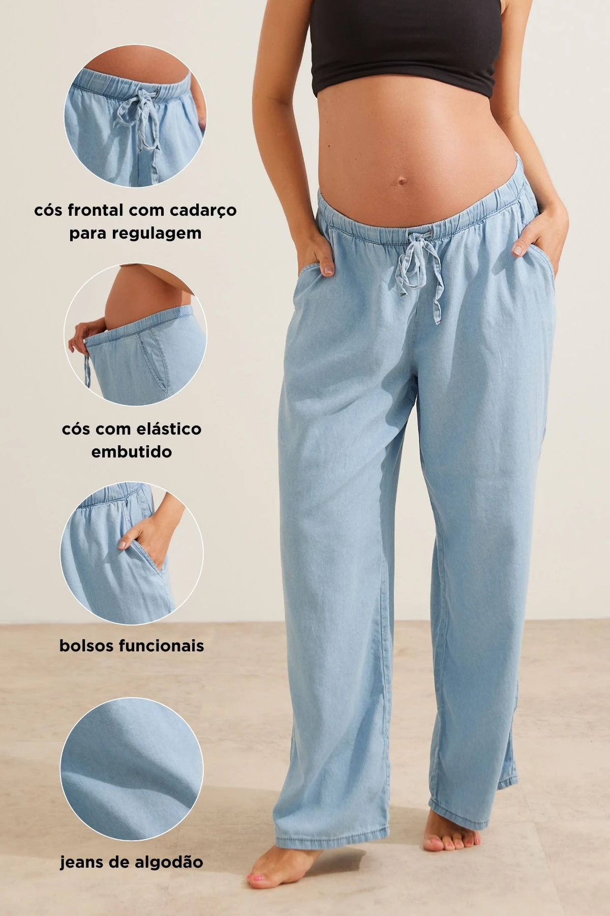 Calça jeans de algodão com toque macio. Corte reto e solto, oferece caimento fluído e confortavél, cós com elástico e cordão do próprio tecido, se adapta ao crescimento da barriga, e garante um ajuste personalizado para todas as fases. Ideal para quem não gosta de calças de gestante.