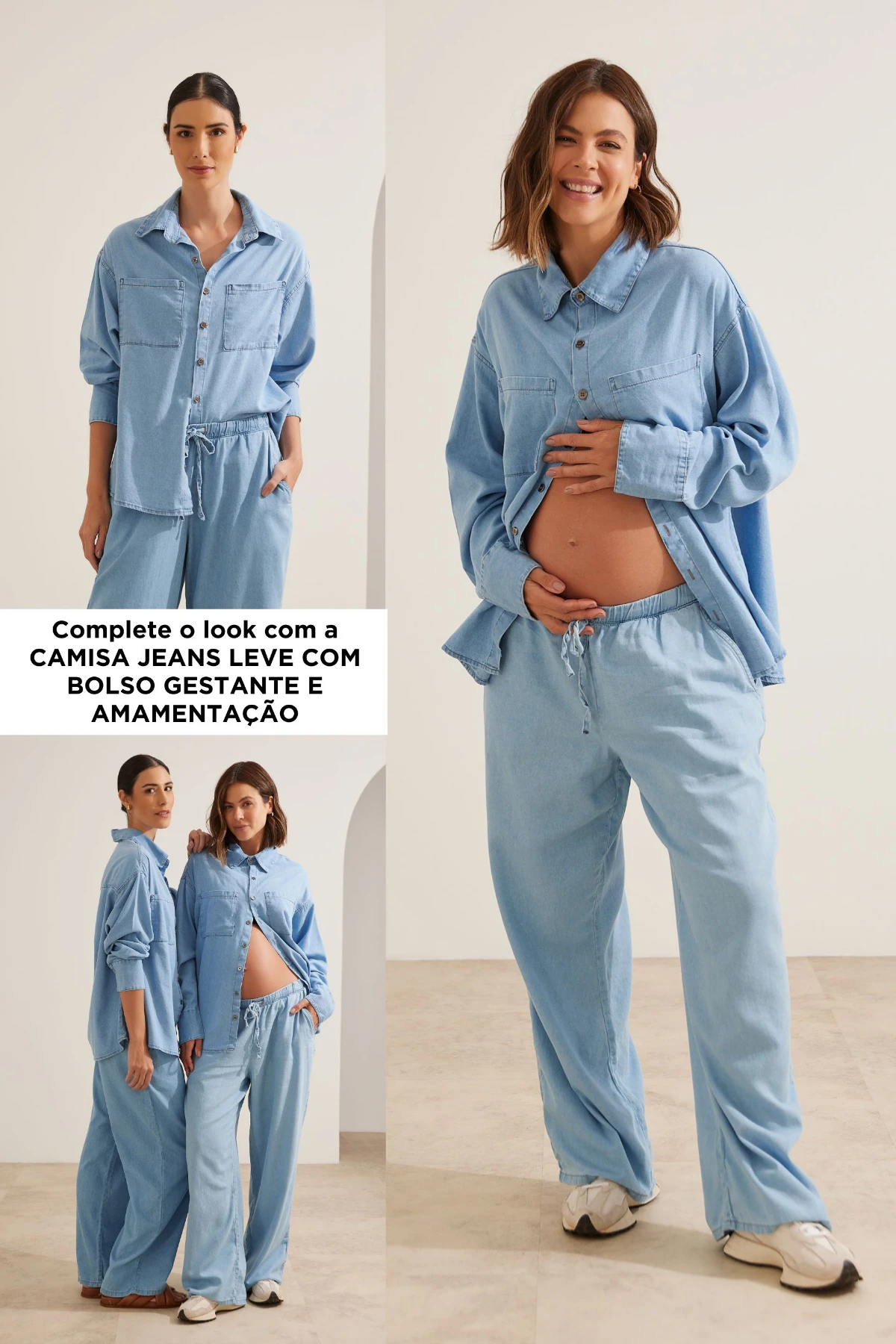 Calça confeccionada em jeans de algodão, com toque macio. A modelagem reta e solta tem caimento leve e confortável, o cós com elástico embutido se ajusta suavemente ao crescimento da barriga, enquanto o cordão feito do mesmo tecido permite uma regulagem personalizada.