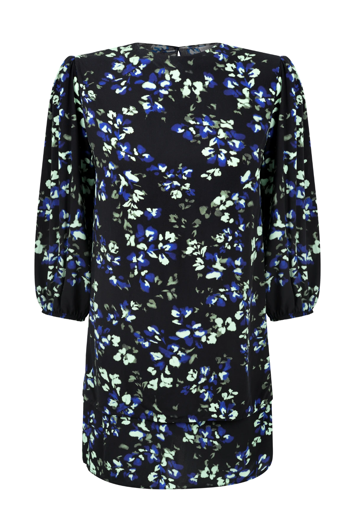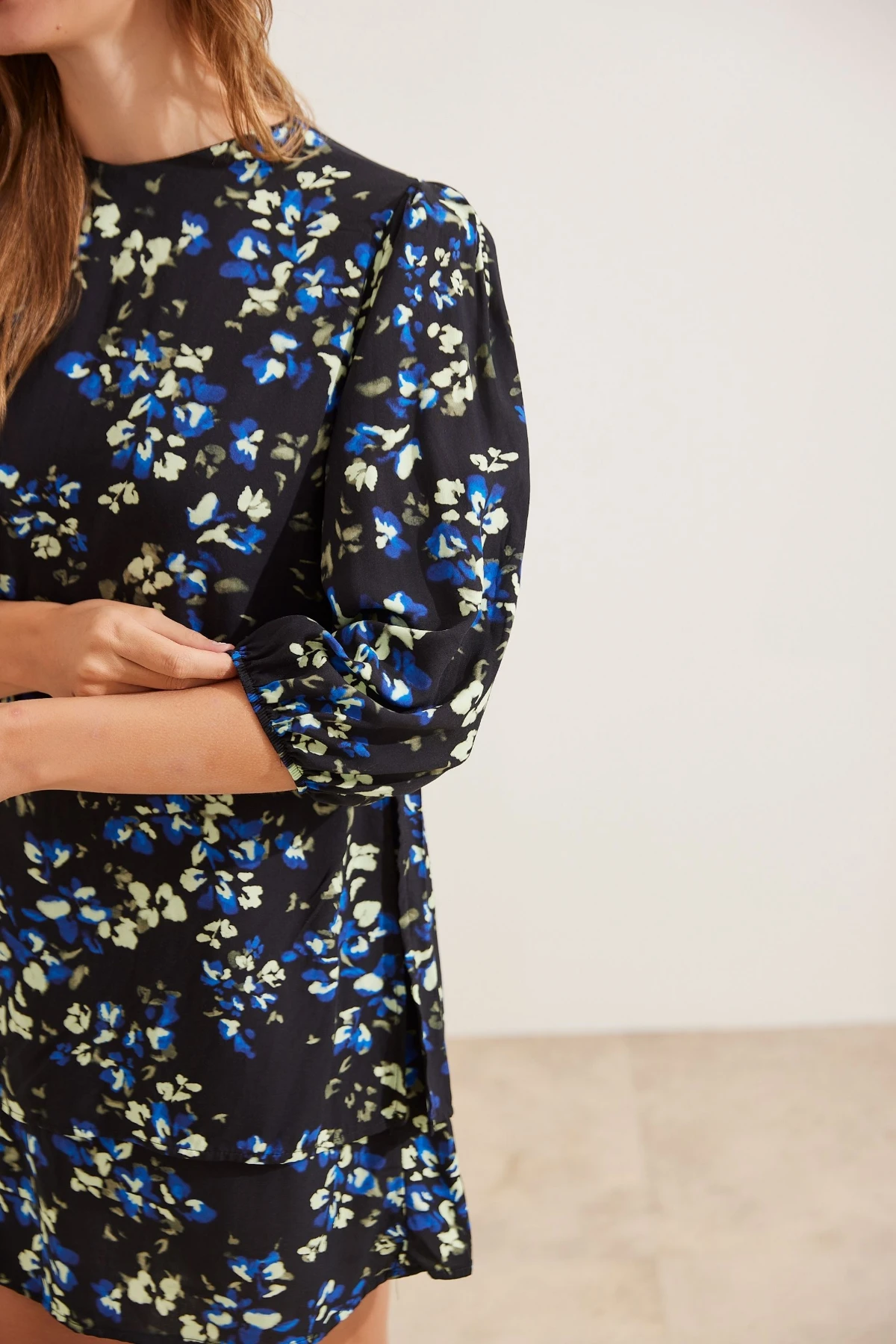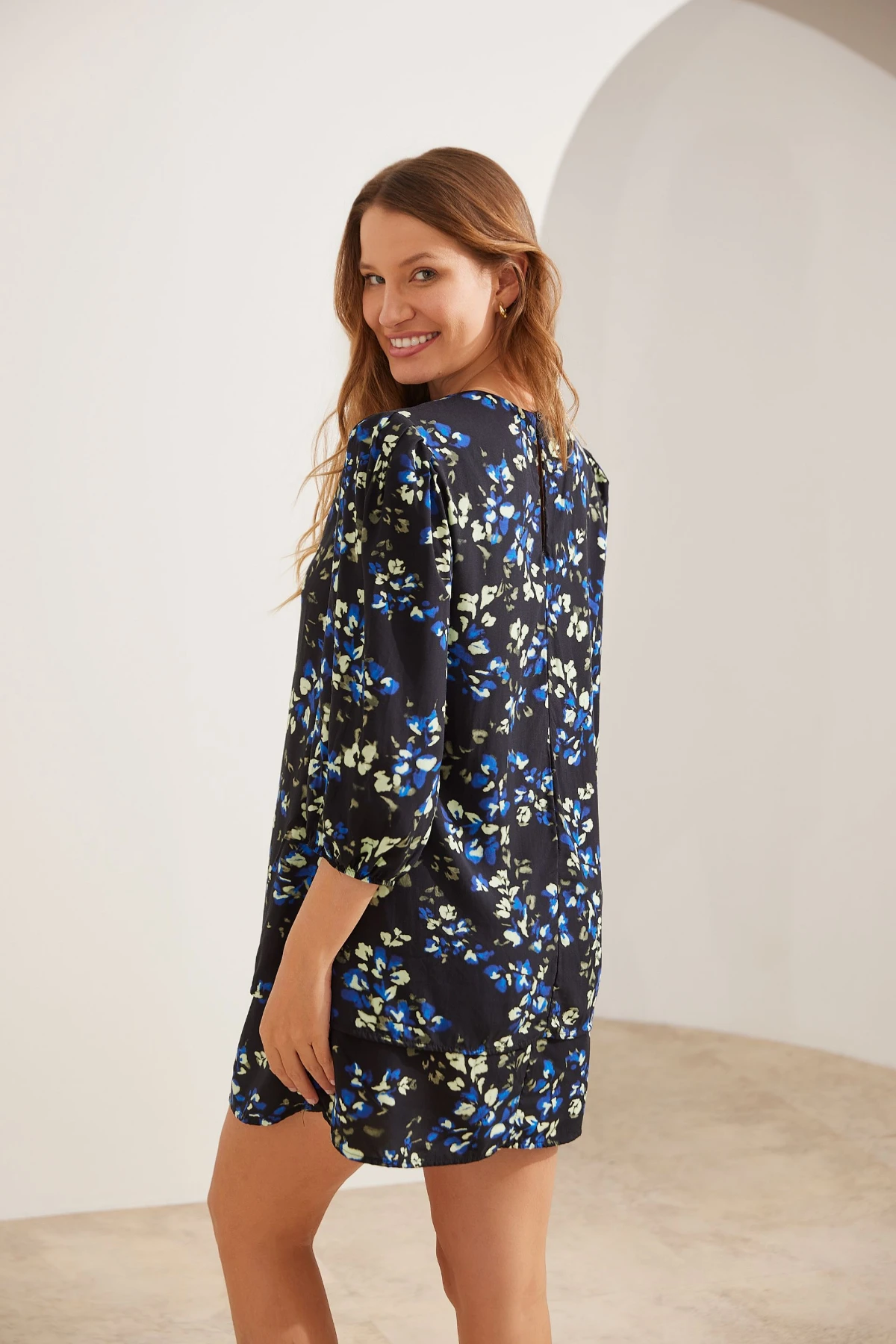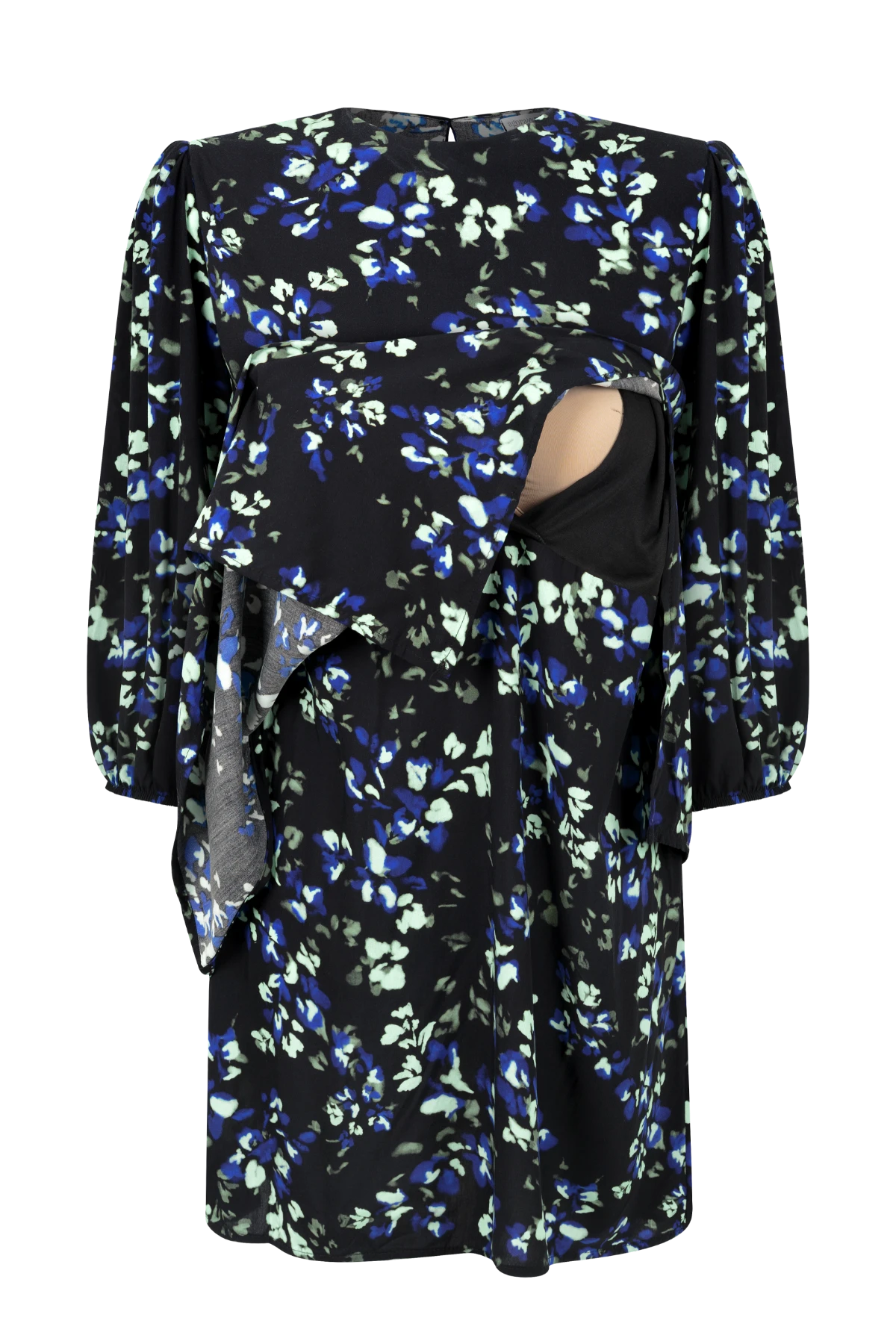 Vestido curto, produzido em tecido plano de viscose, leve e fluído. A sobreposição tem decote fechado com um botão nas costas, possui fenda nas laterais da camada superior que garante facilidade e privacidade para amamentar, pois conta com forro interno e abertura fácil. Mangas no comprimento 3/4 com elástico e drapeado para melhor caimento e ajuste ao corpo.