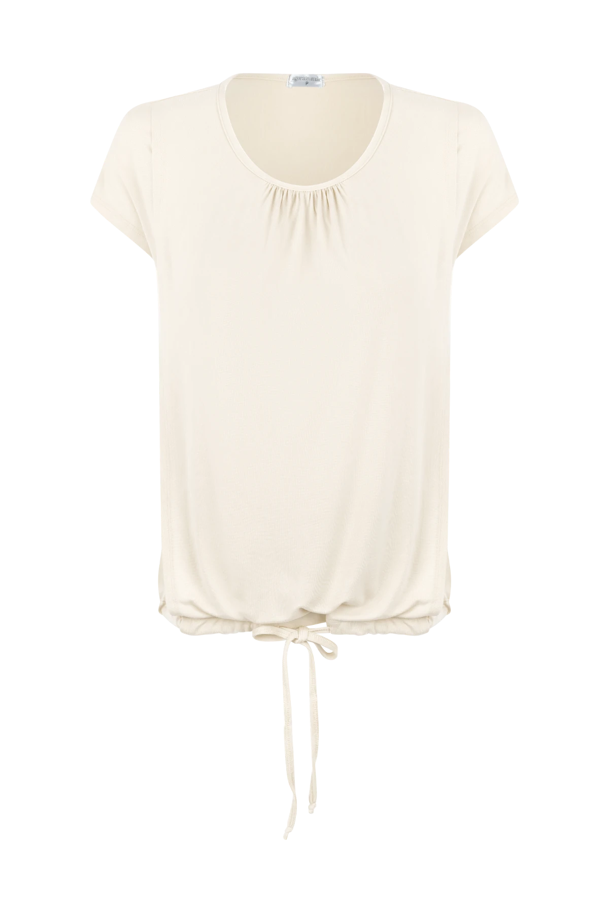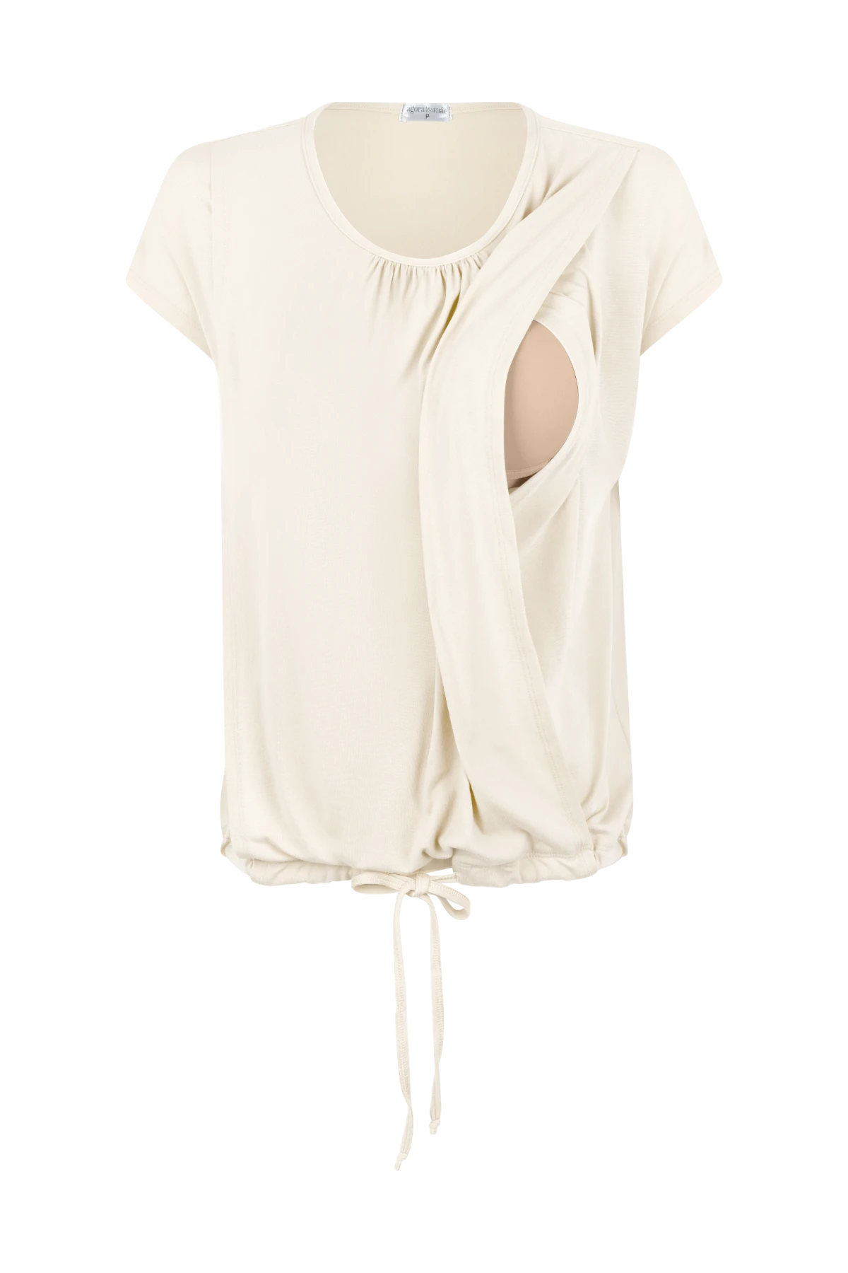 Blusa com recorte interno discreto para amamentação e cordão ajustável na barra para regular o caimento conforme a gestação.