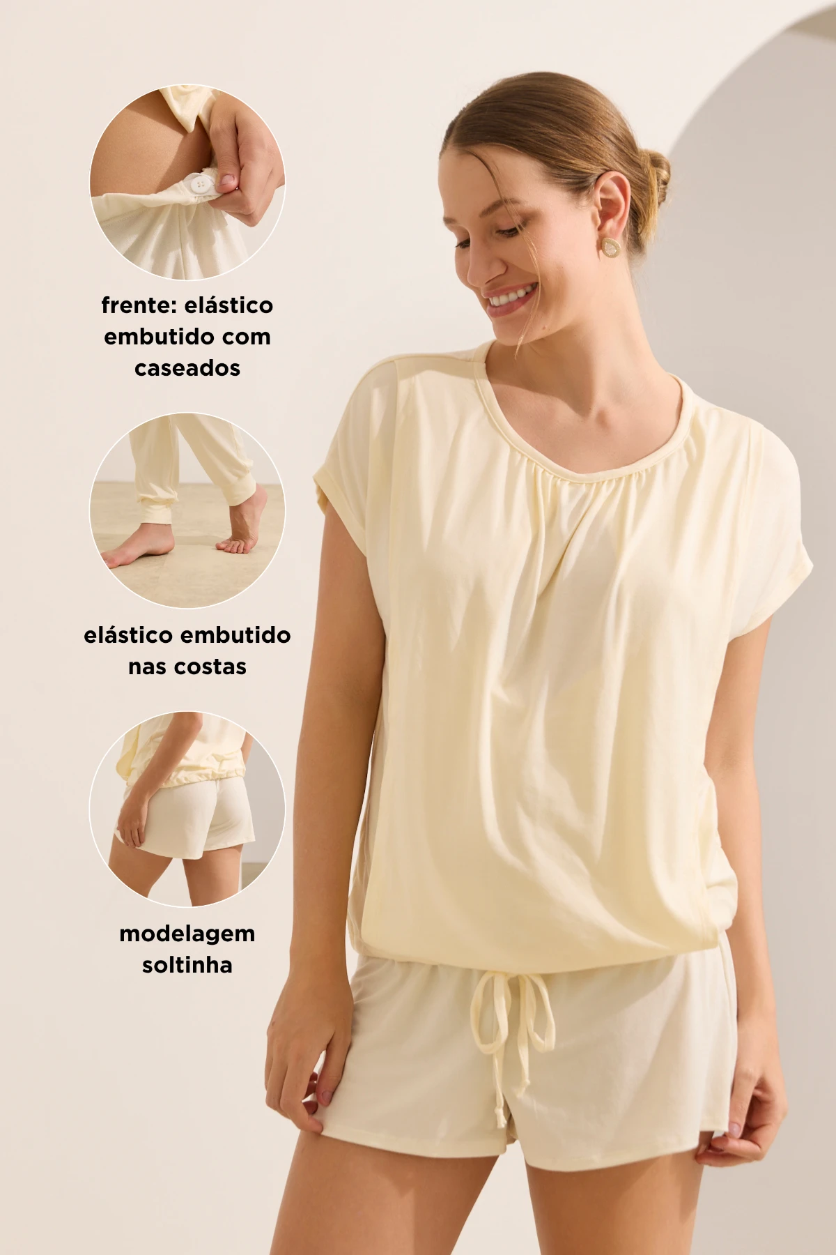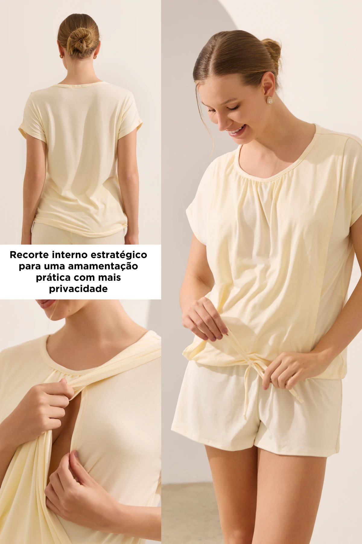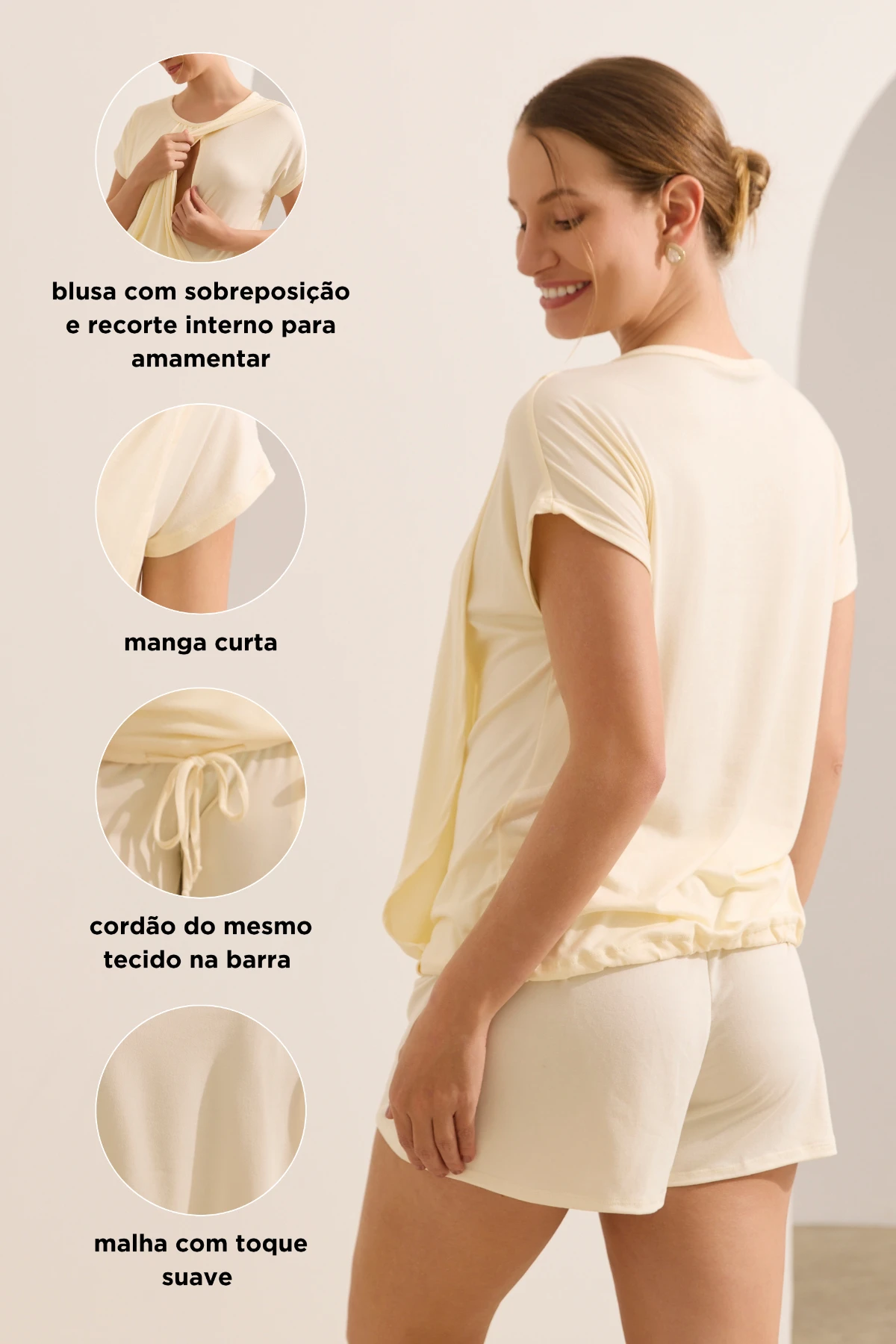 A blusa possui recorte interno discreto que facilita a amamentação com privacidade, além de cordão ajustável na barra, permitindo regular o caimento conforme o crescimento da barriga. O short, com modelagem soltinha, traz um cós regulável funcional: na frente, elástico com casas para botão interno que permite ampliar ou reduzir a circunferência; nas costas, elástico fixo que garante encaixe natural sem apertar.