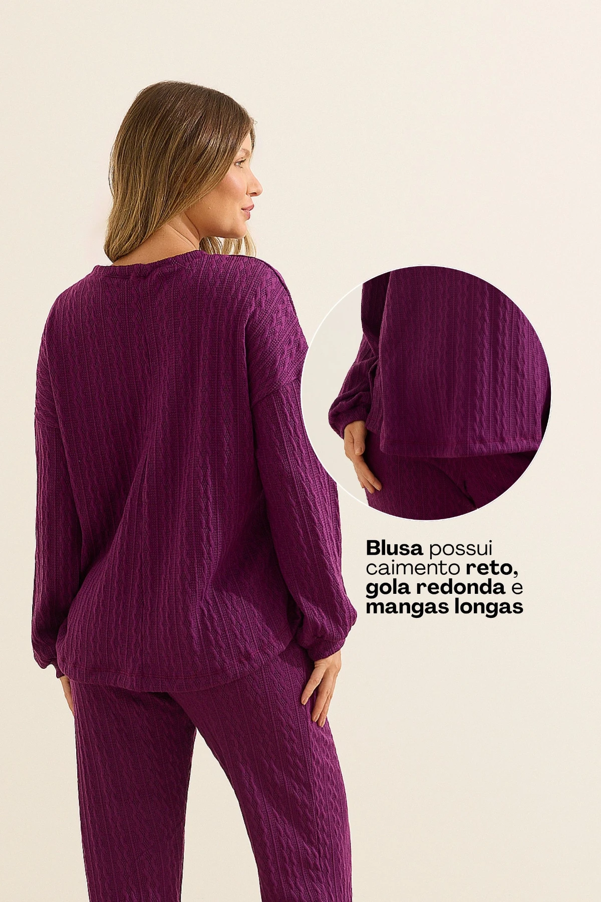 A blusa possui caimento reto, gola redonda e mangas longas levemente bufantes. Os punhos contam com acabamento, proporcionando melhor ajuste nos braços. A modelagem permite amamentar com facilidade.