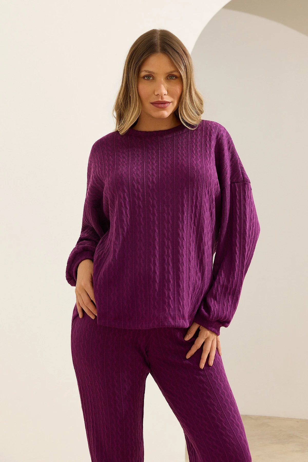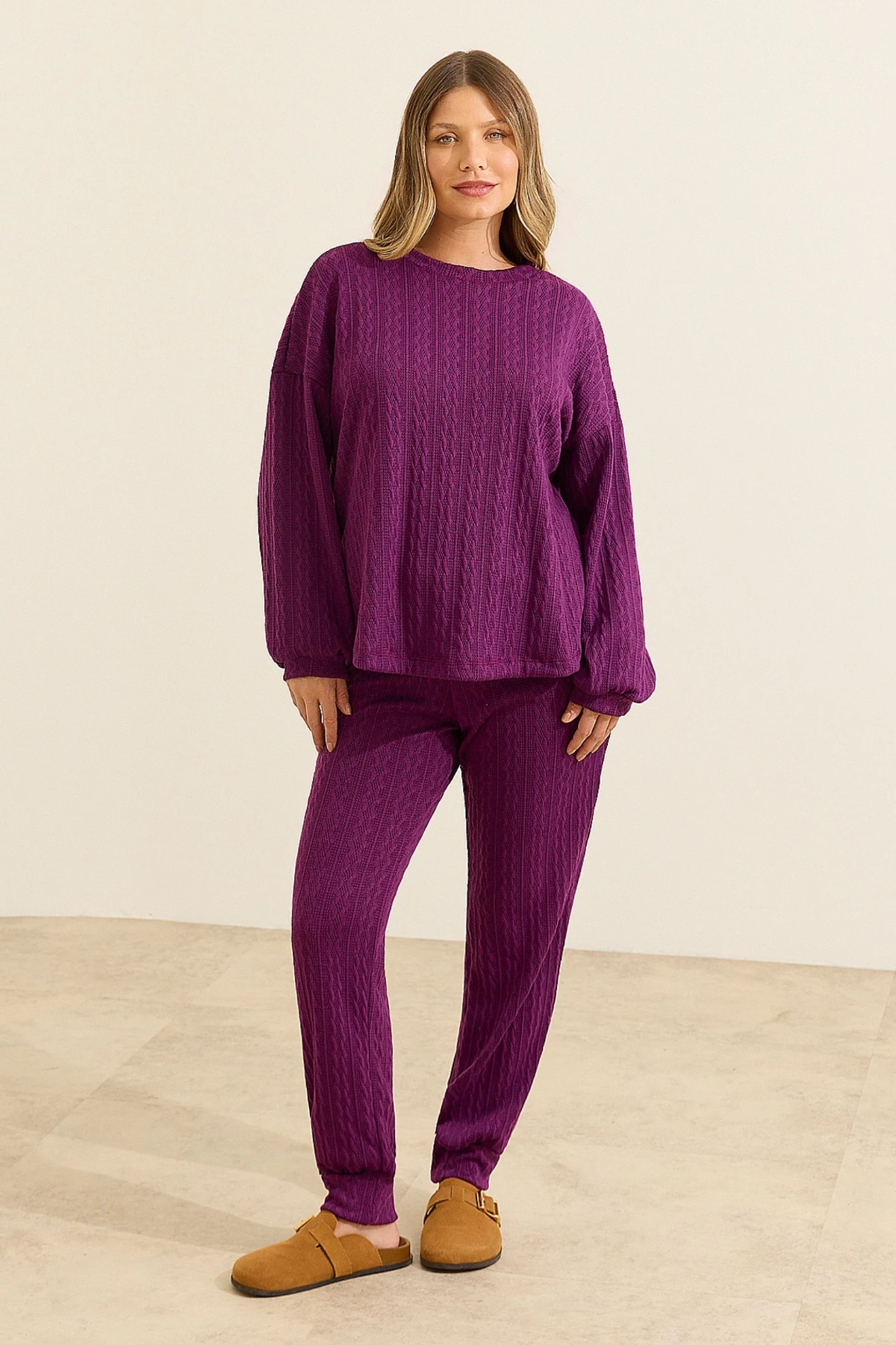 Conjunto confeccionado em tricô macio e confortável, composto por blusa e calça com modelagem pensada para o dia a dia.