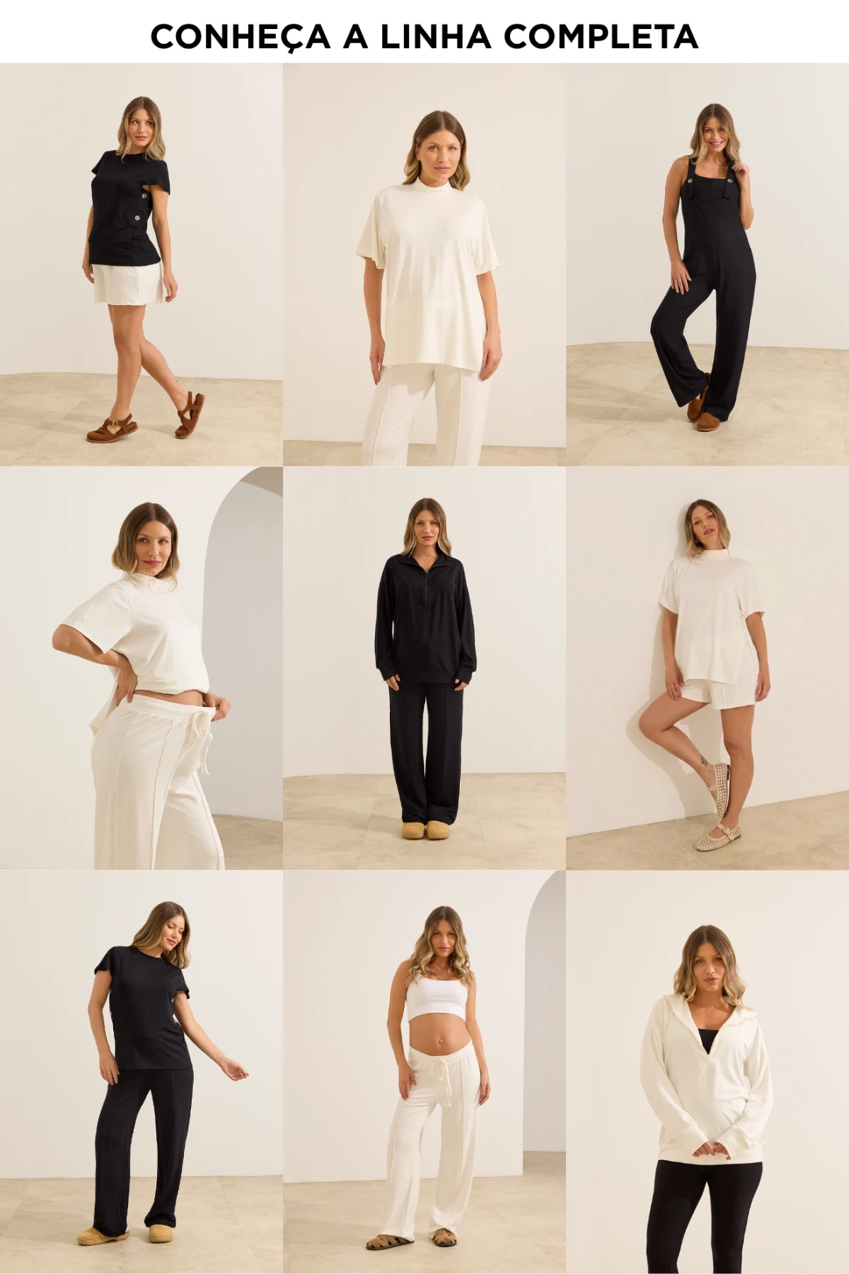 O cós com elástico embutido na cintura e cordão para regulagem permite ajuste da gestação ao pós-parto.