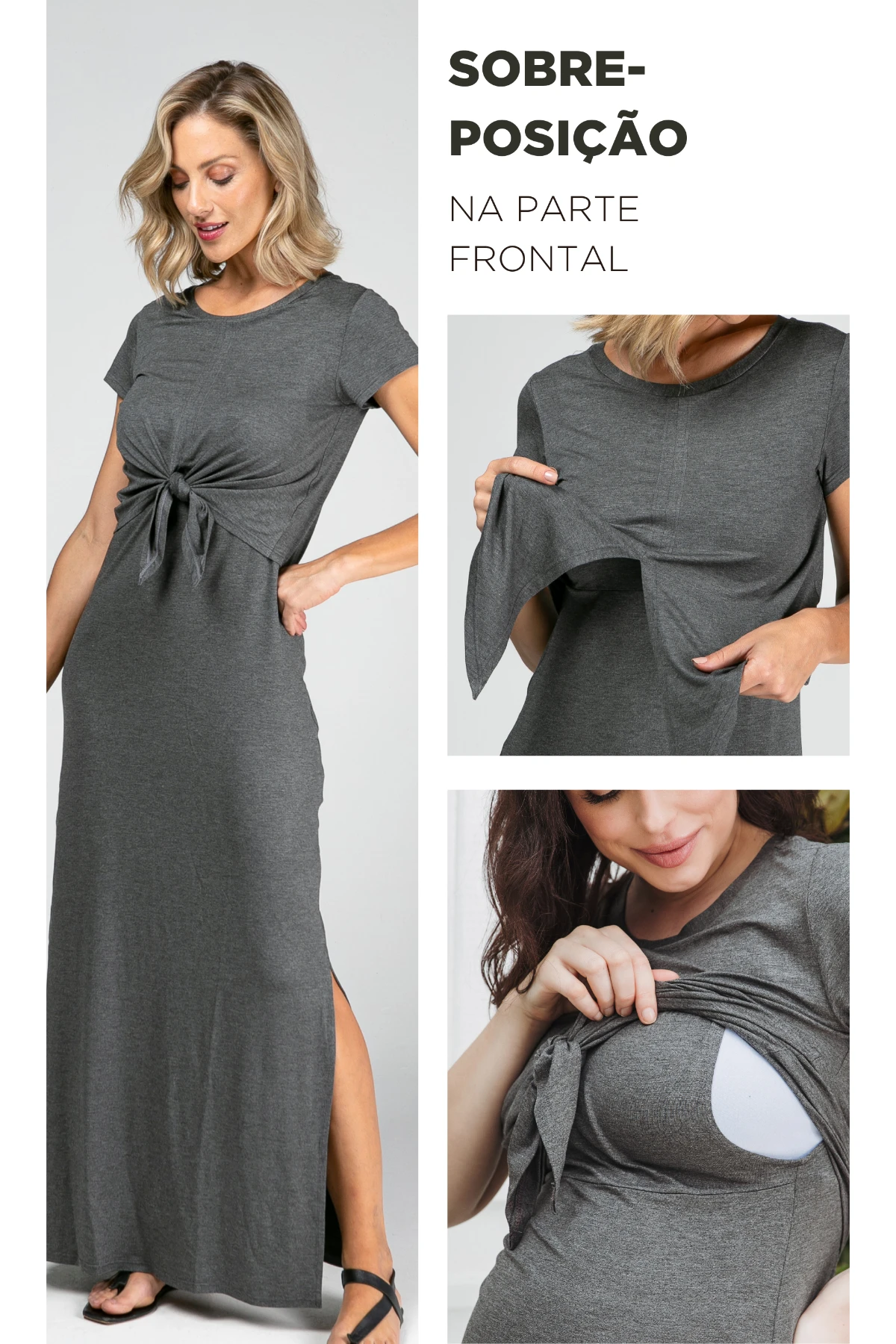Nosso Vestido Amamentação Melissa une praticidade e elegância: longo em viscolycra flexível que estica sem alargar, aberturas laterais externas para amamentar com rapidez e sobreposição com nó frontal que garante acesso discreto.