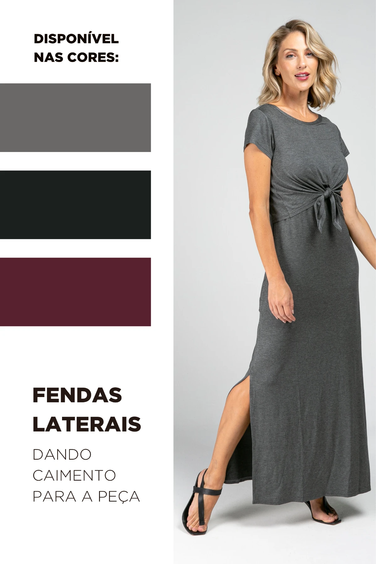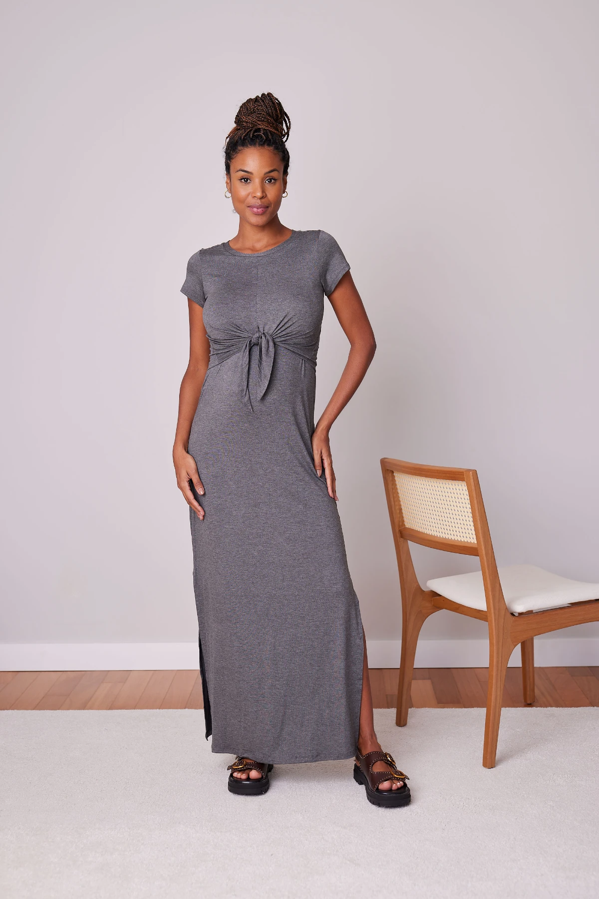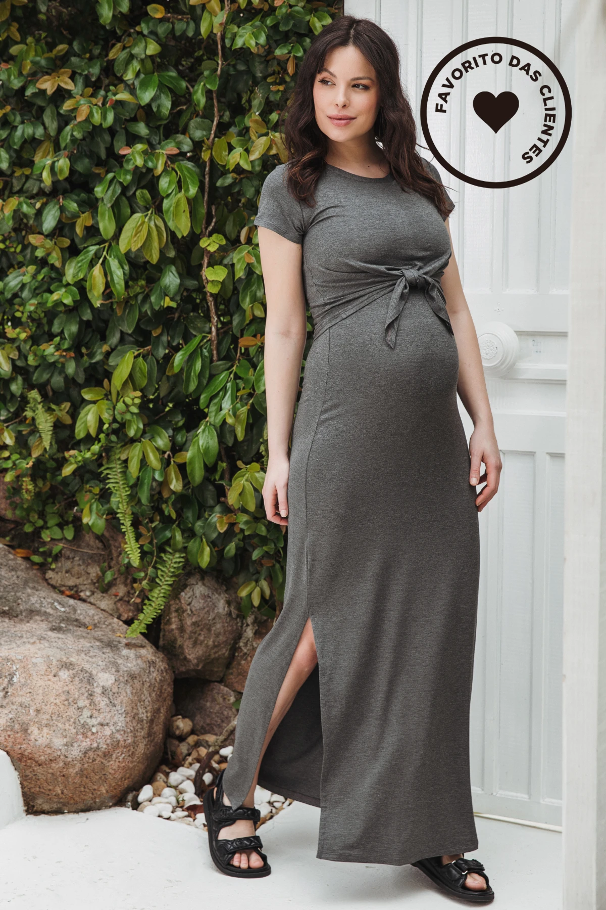 Por isso desenvolvemos o Vestido Melissa: a viscolycra escolhida oferece elasticidade controlada — estica onde o corpo pede e recupera a forma, sem alargar. O modelo longo traz aberturas laterais externas que permitem alimentar o bebê com rapidez e discrição; a sobreposição frontal com nó facilita o acesso e também pode ser usada como detalhe do look.