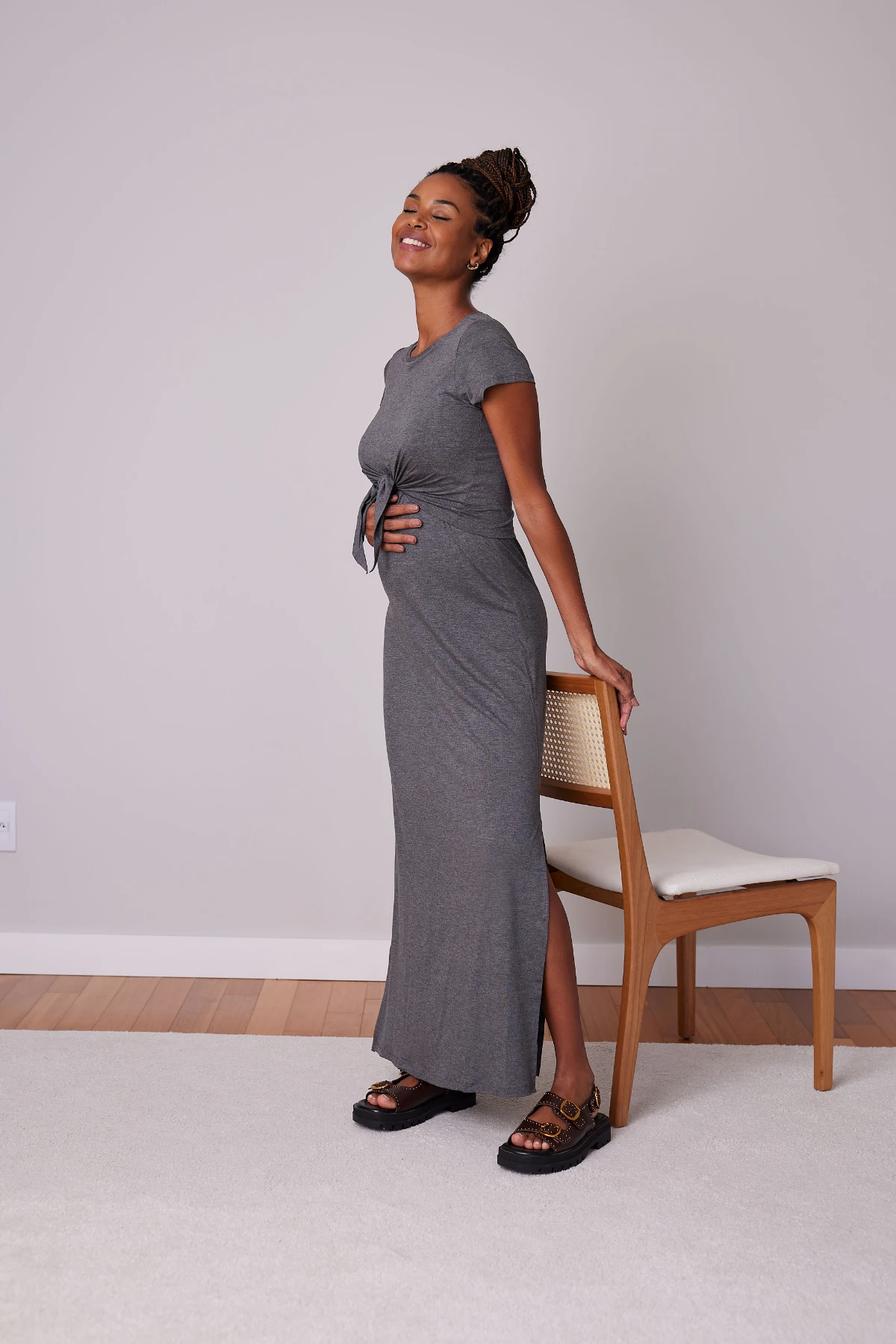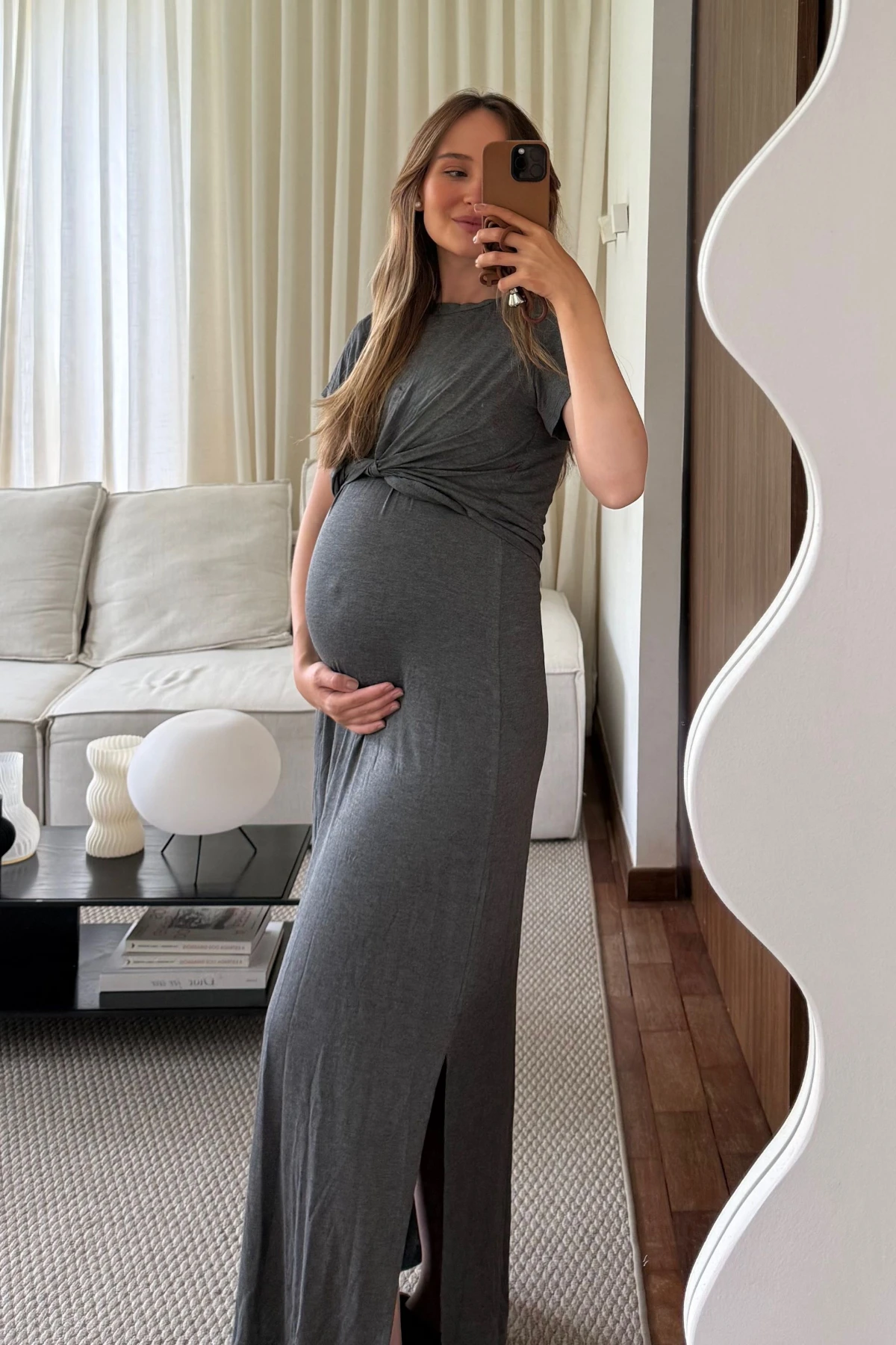 Modelagem: Longo, soltinho — acompanha a gestação sem alargar.