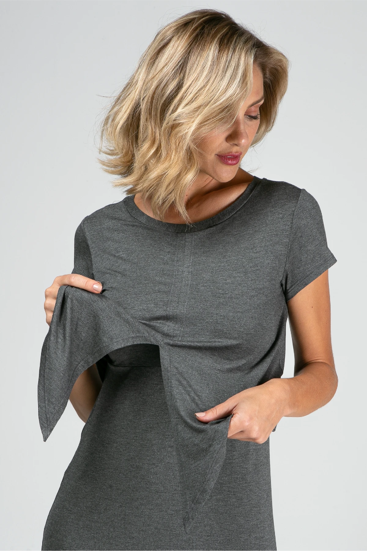 O caimento é leve e soltinho; as fendas nas laterais da barra adicionam movimento e conforto. Use na gravidez, para amamentar e no pós-parto.