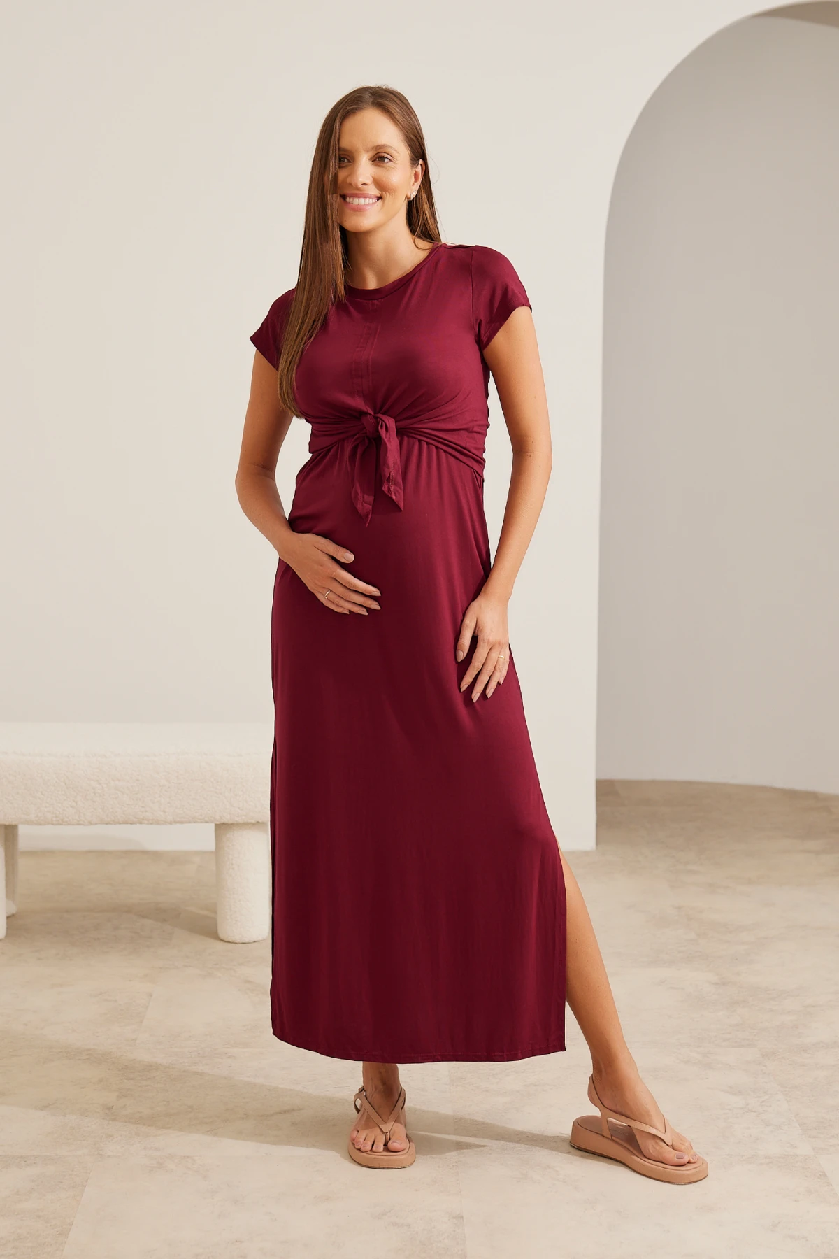 O caimento é leve e soltinho; as fendas nas laterais da barra adicionam movimento e conforto. Use na gravidez, para amamentar e no pós-parto.