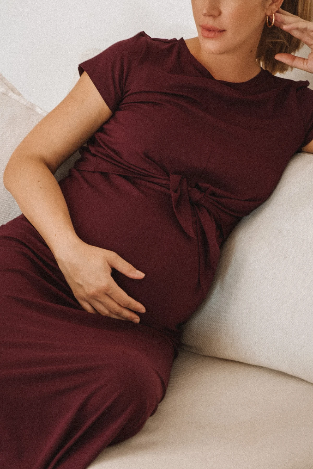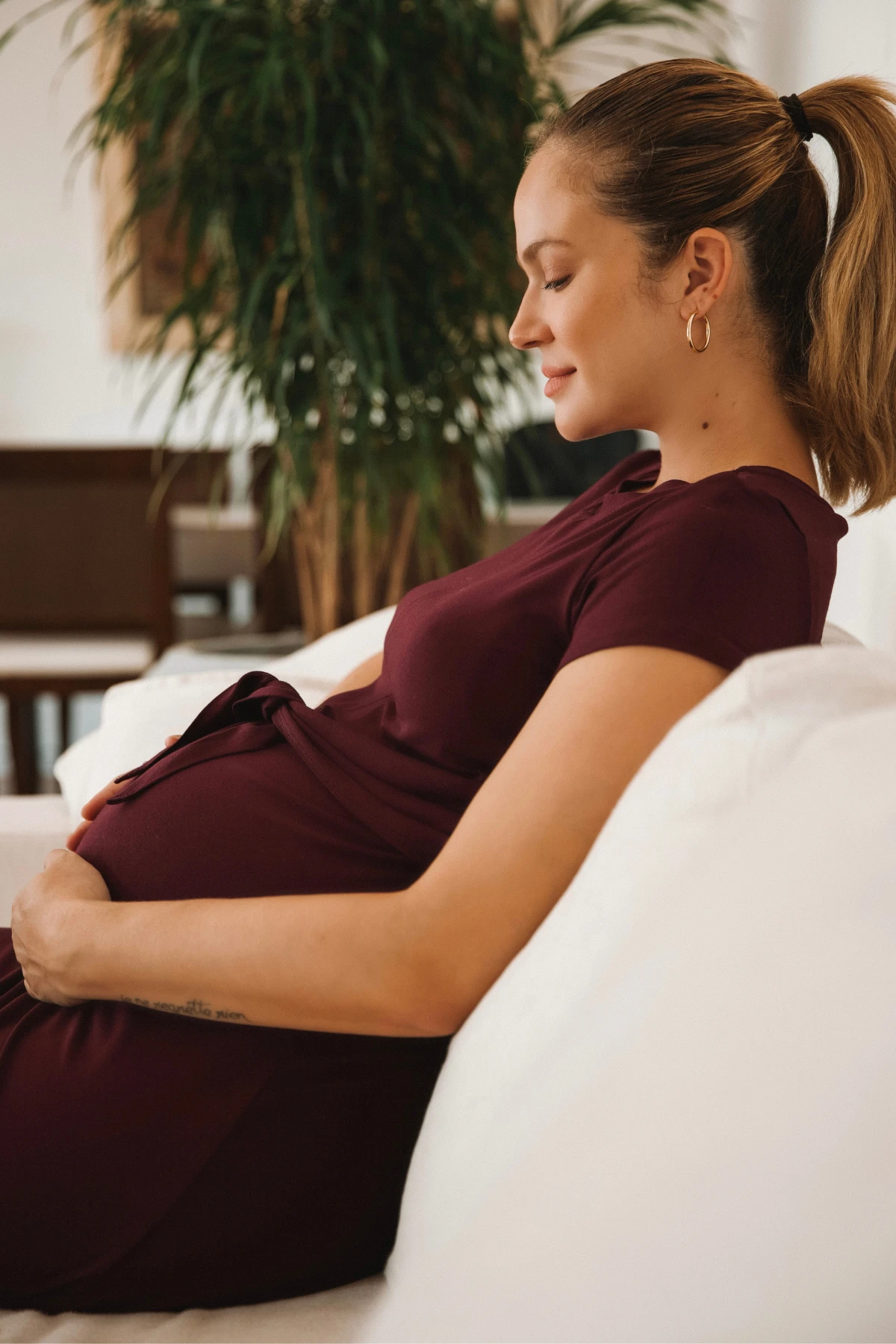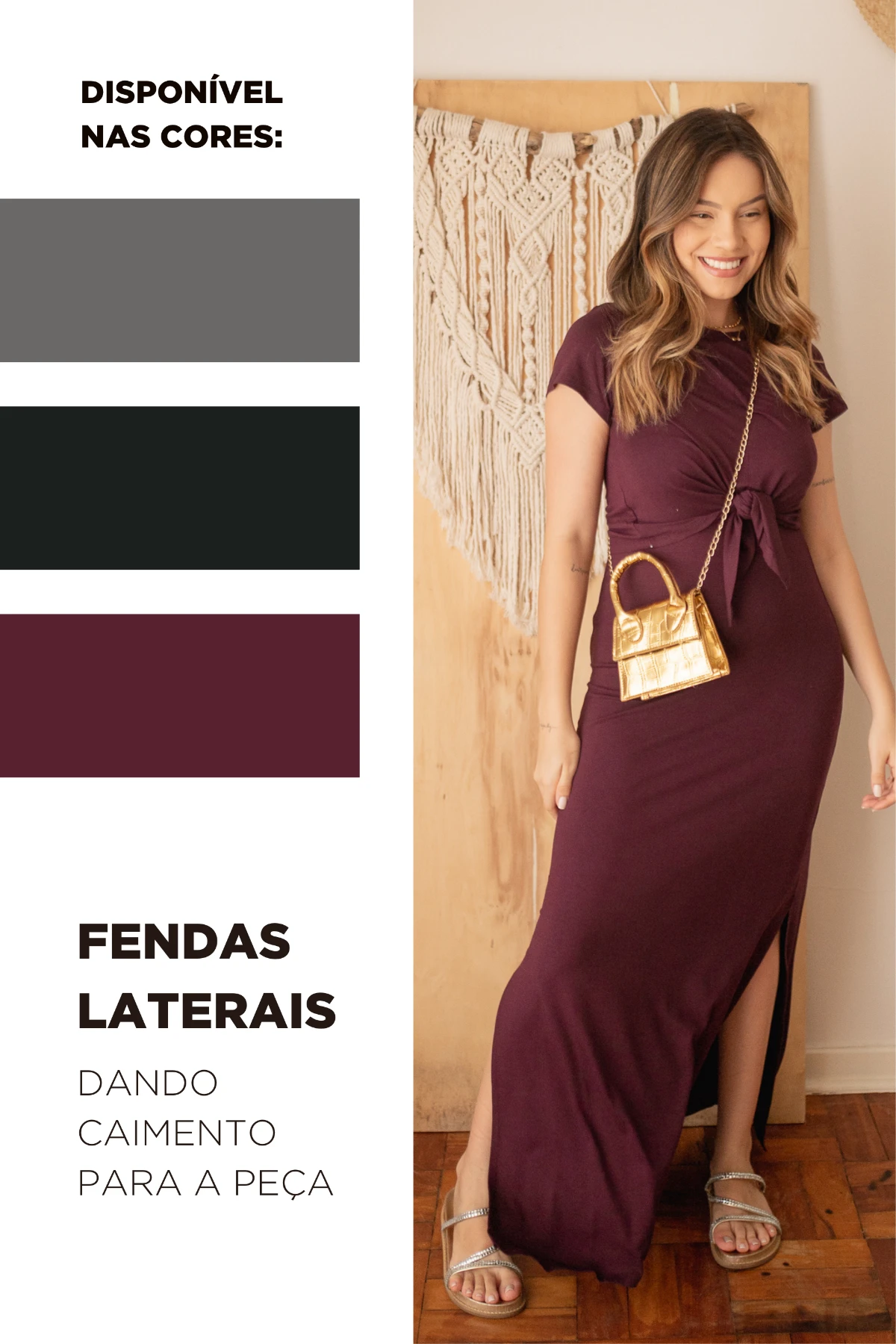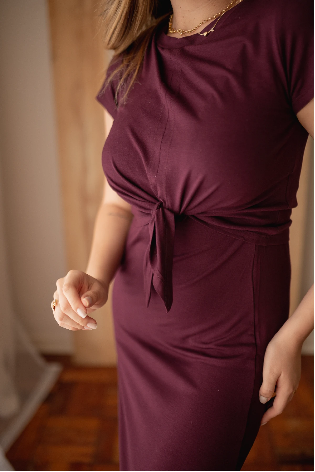 Por isso desenvolvemos o Vestido Melissa: a viscolycra escolhida oferece elasticidade controlada — estica onde o corpo pede e recupera a forma, sem alargar. O modelo longo traz aberturas laterais externas que permitem alimentar o bebê com rapidez e discrição; a sobreposição frontal com nó facilita o acesso e também pode ser usada como detalhe do look.
