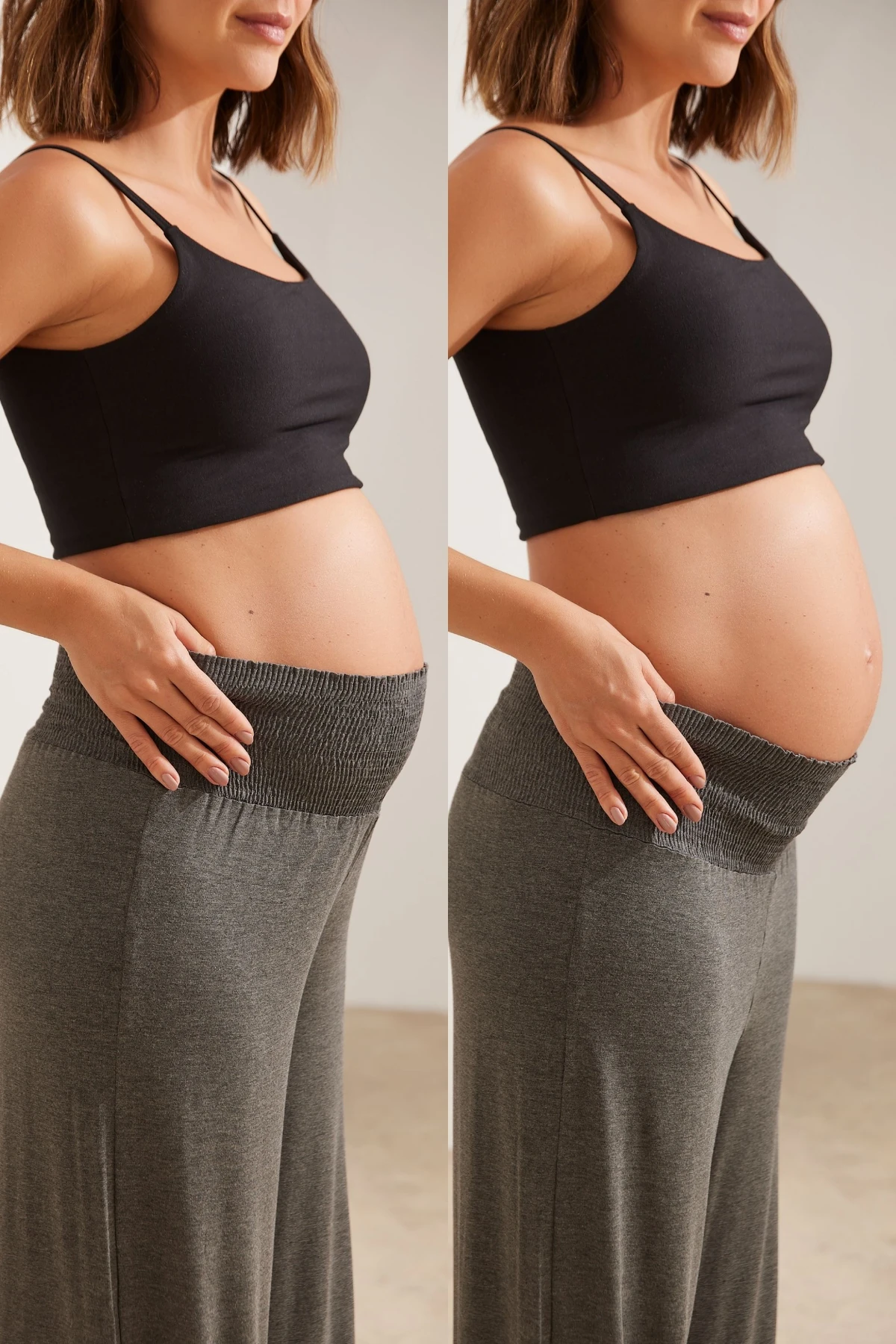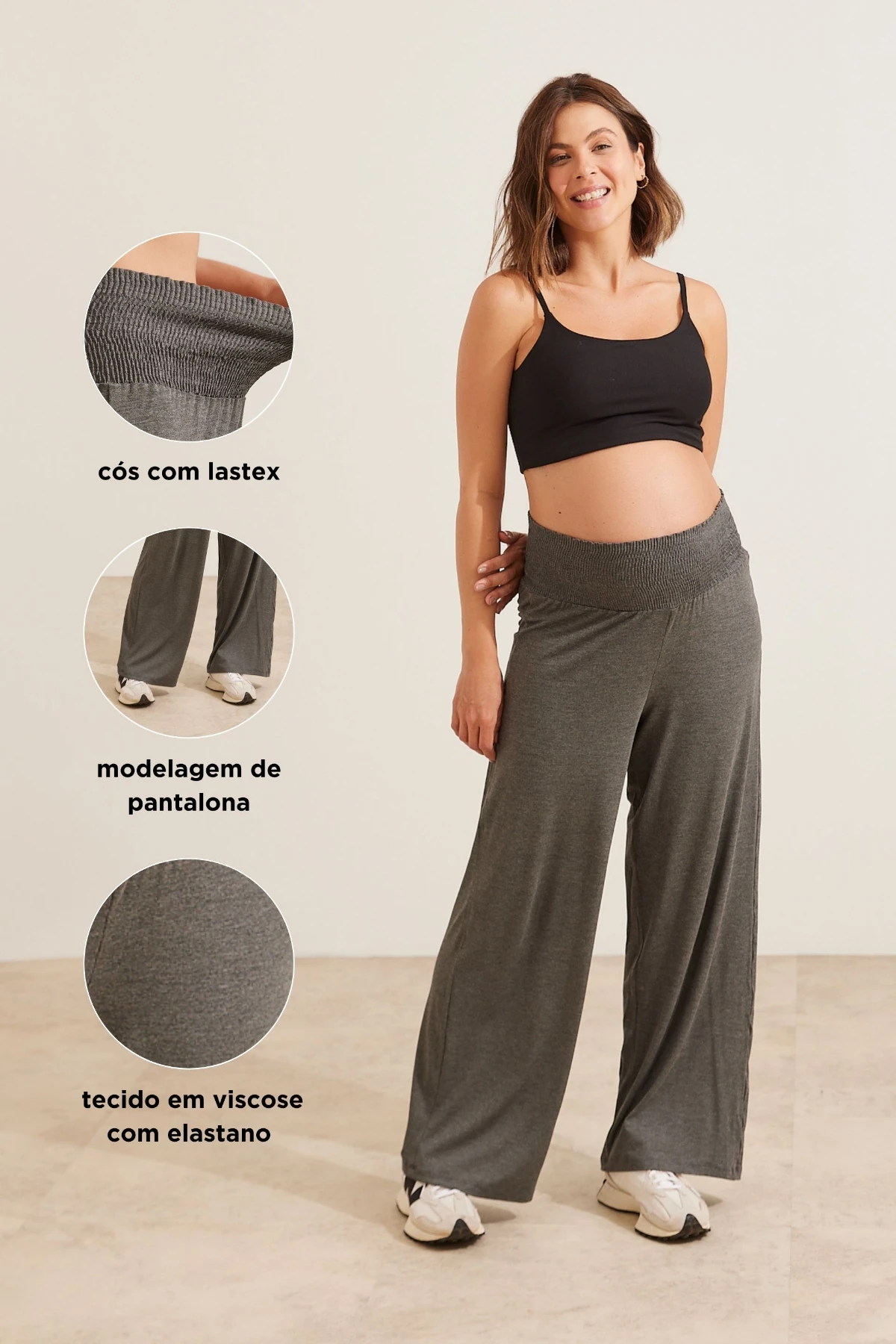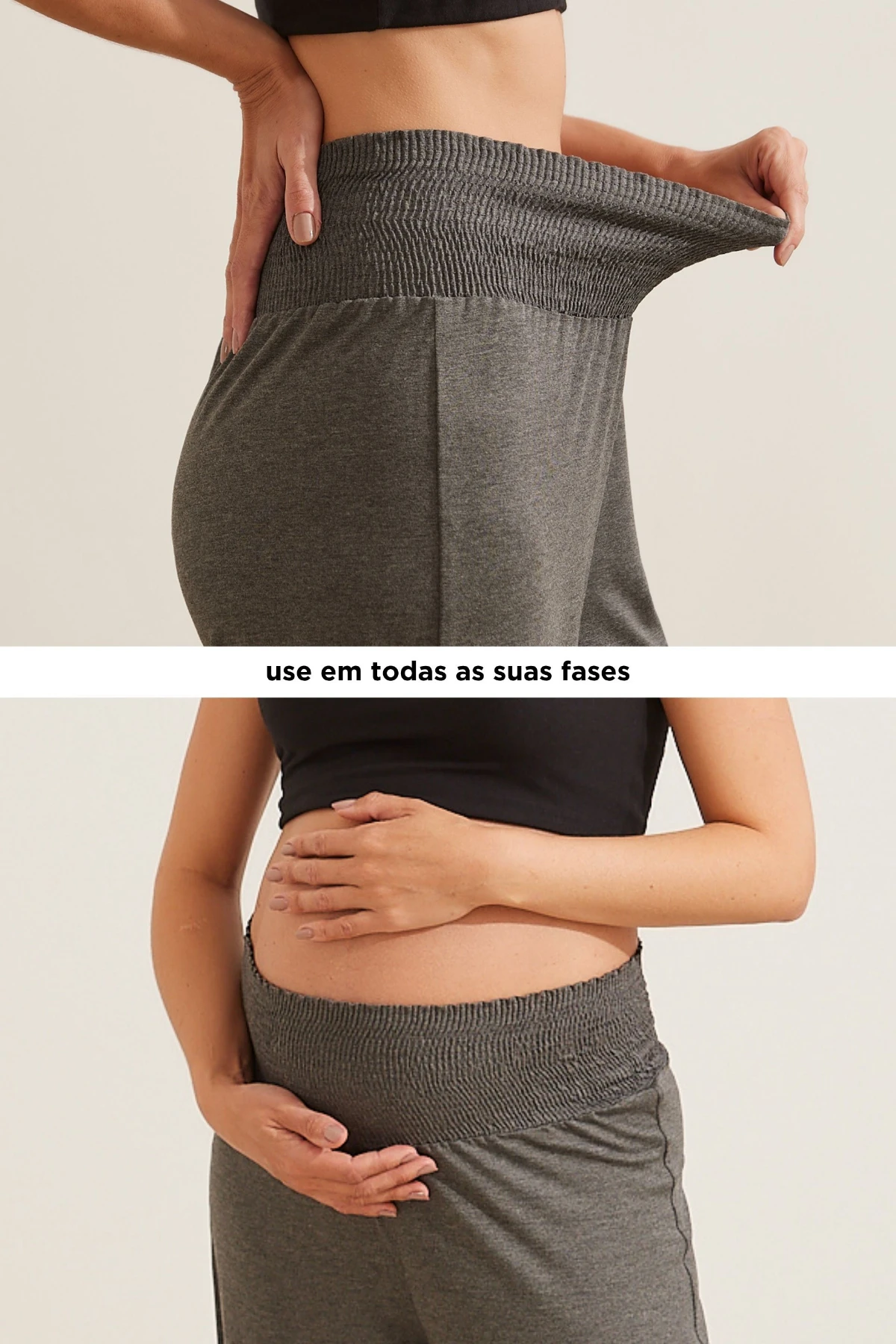 A Calça Relax para Gestante foi criada para substituir o cós que prende por um ajuste que respeita o corpo em transformação. Com modelagem pantalona ampla, cintura alta e cós anatômico em lastex de alta elasticidade, ela acompanha o crescimento da barriga sem apertar e sem marcar, do início da gestação ao pós-parto.