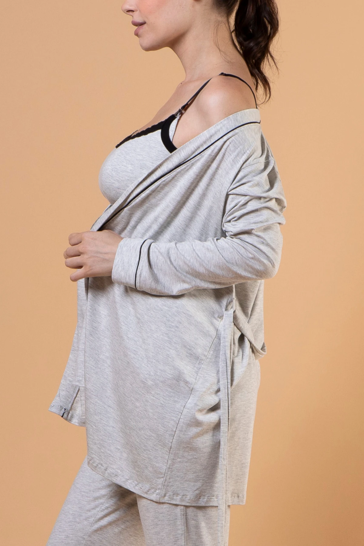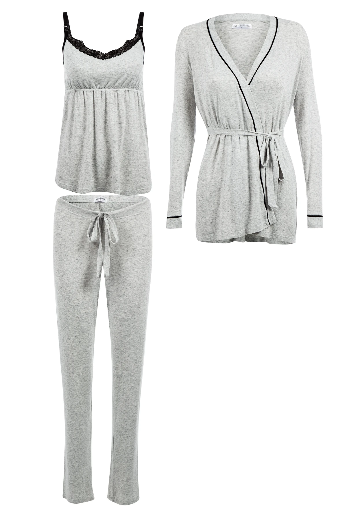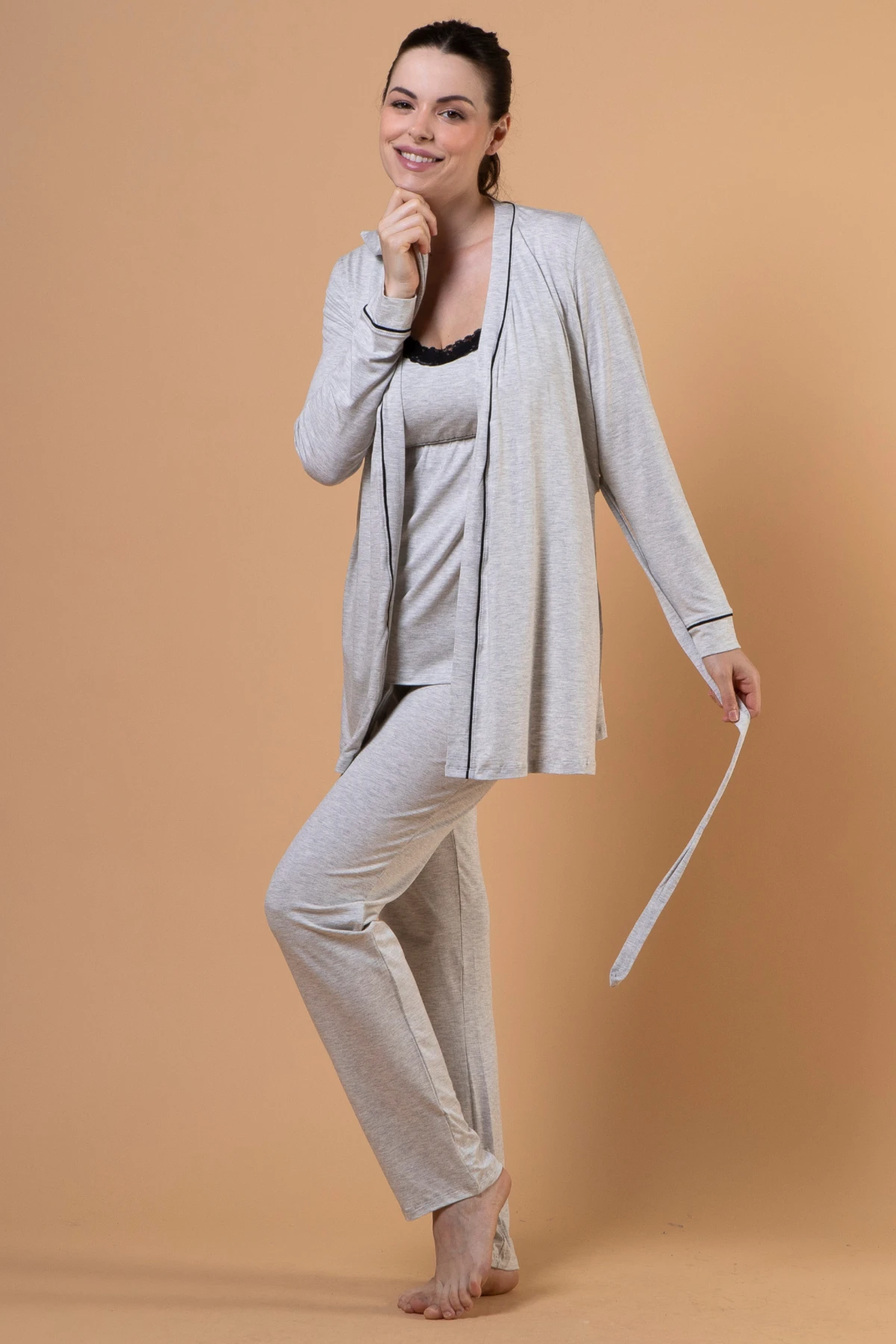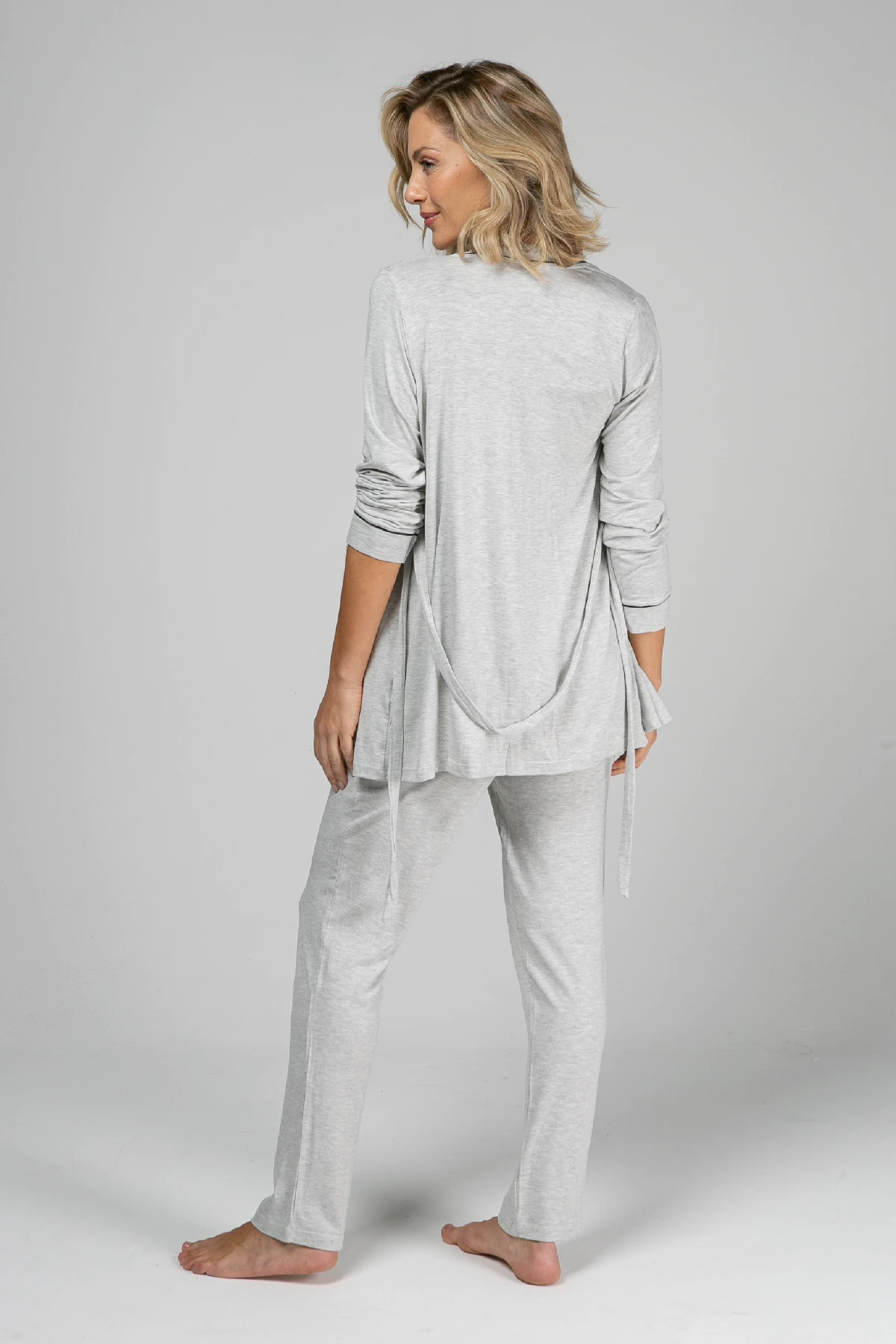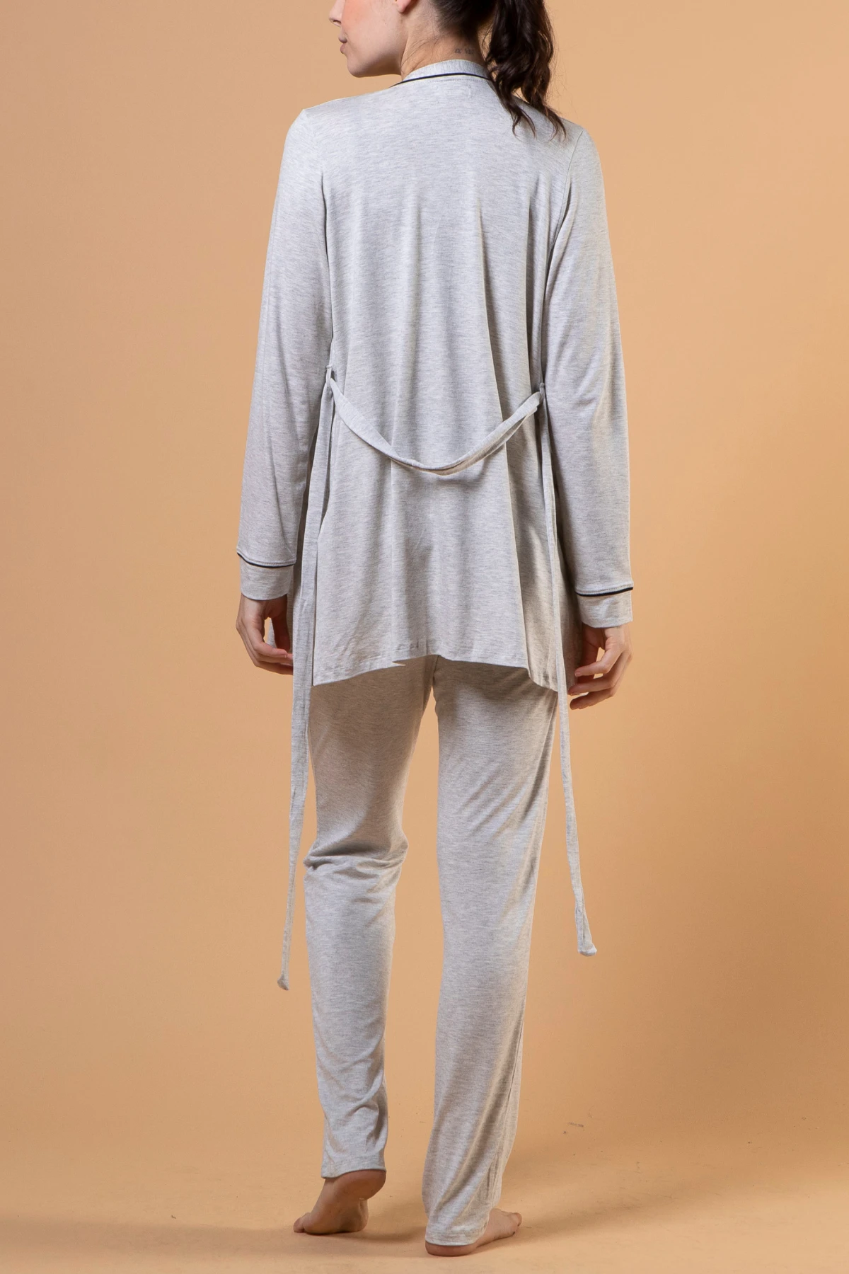 Conjunto com 3 peças: regata, calça e robe na altura do quadril.