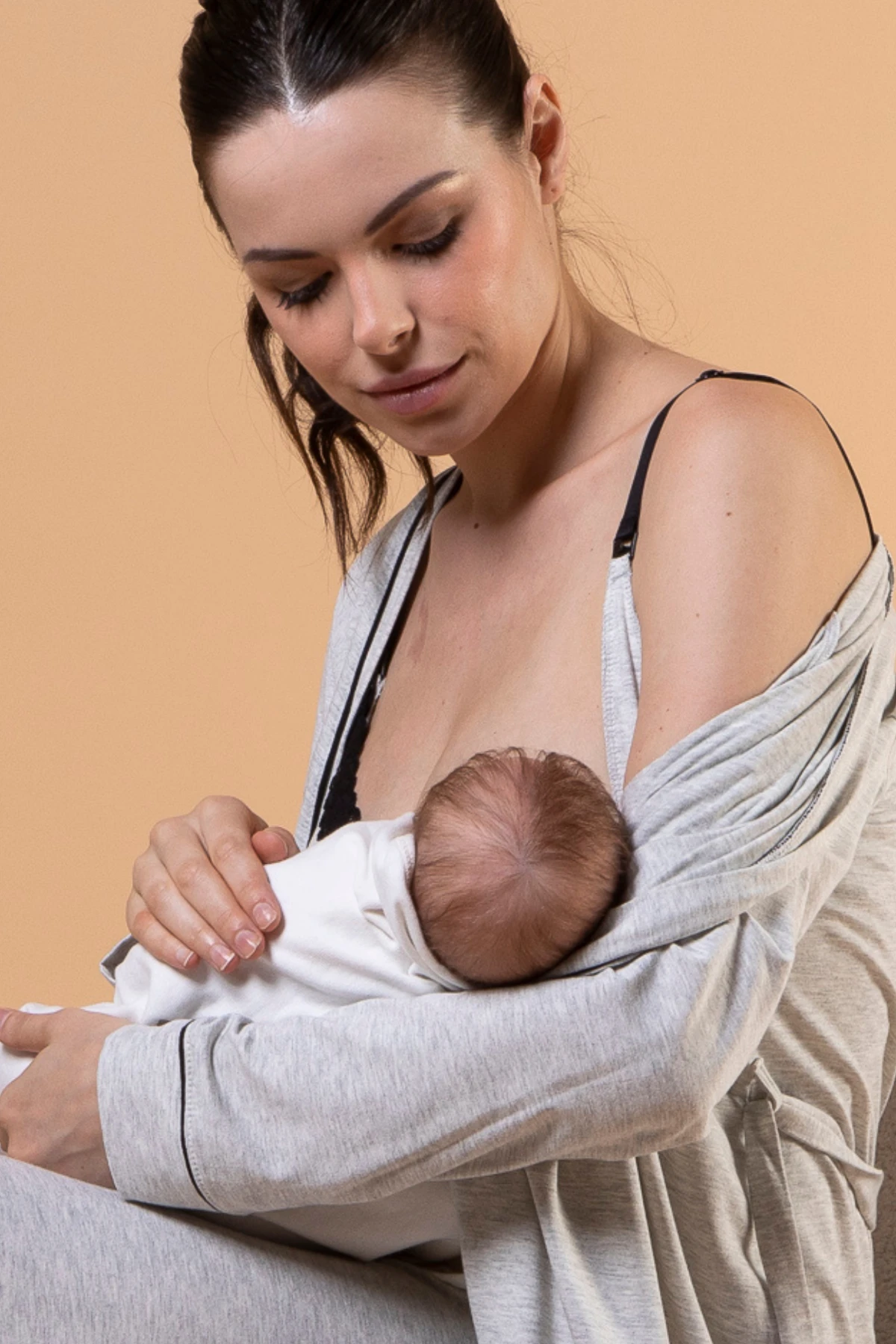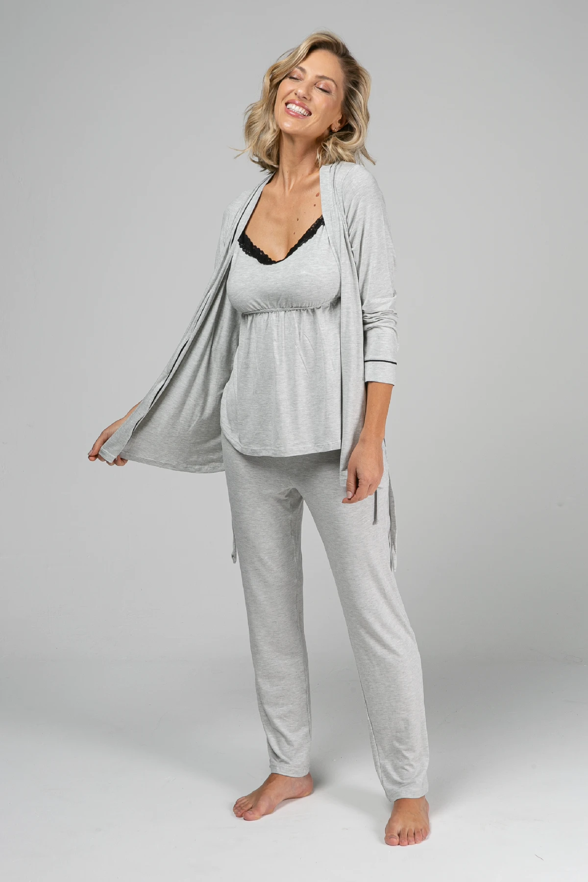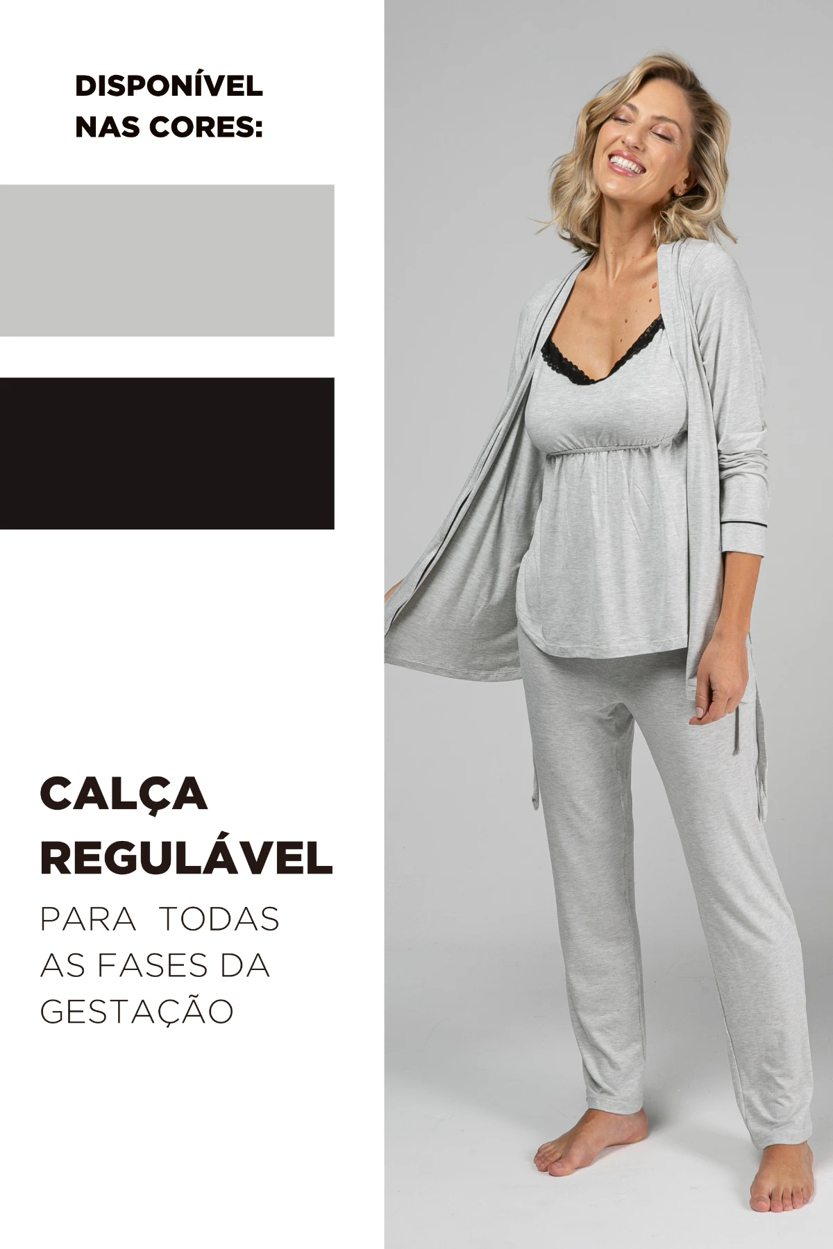 A calça regulável serve da gravidez ao pós-parto. O robe curto dá cobertura na hora das visitas. Perfeito para levar na mala da maternidade.