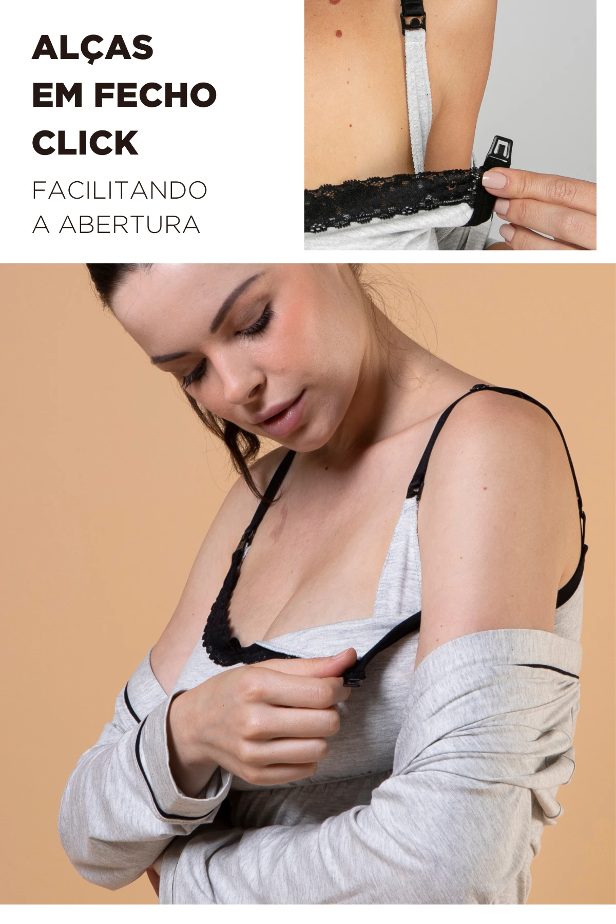 Regata: Sustentação para os seios + fecho click para amamentar com praticidade.