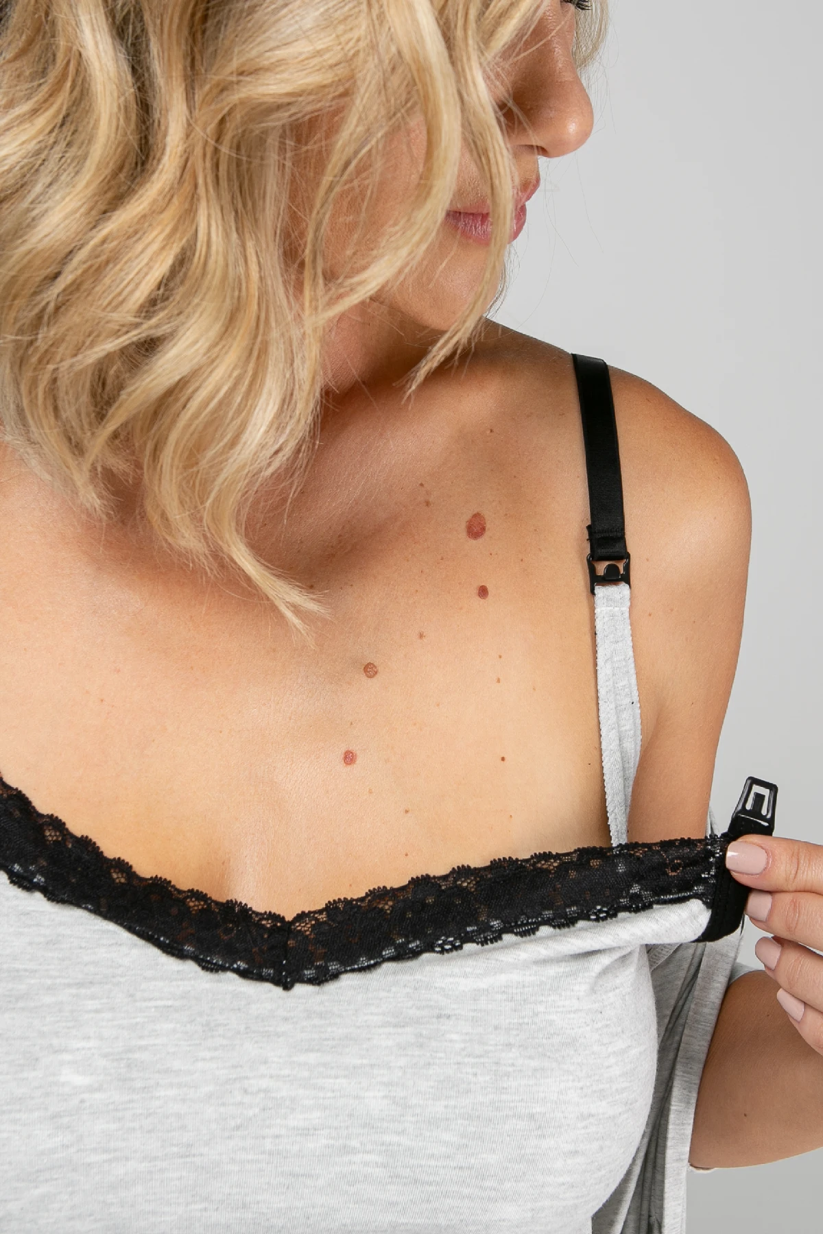 A regata traz sustentação para os seios e fecho click que permite abrir com facilidade na hora de amamentar — uma solução prática e segura. O detalhe em renda no busto deixa o visual mais delicado sem comprometer a função.