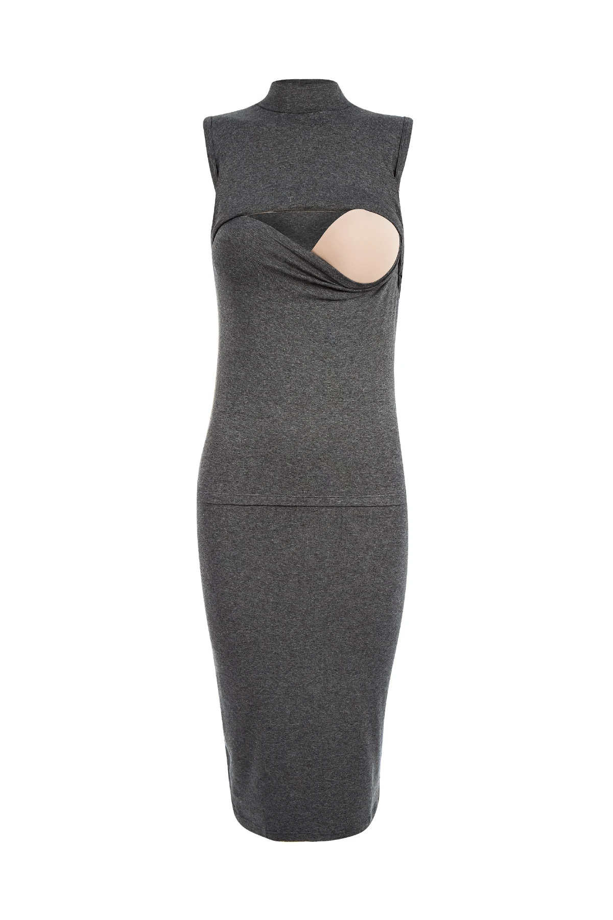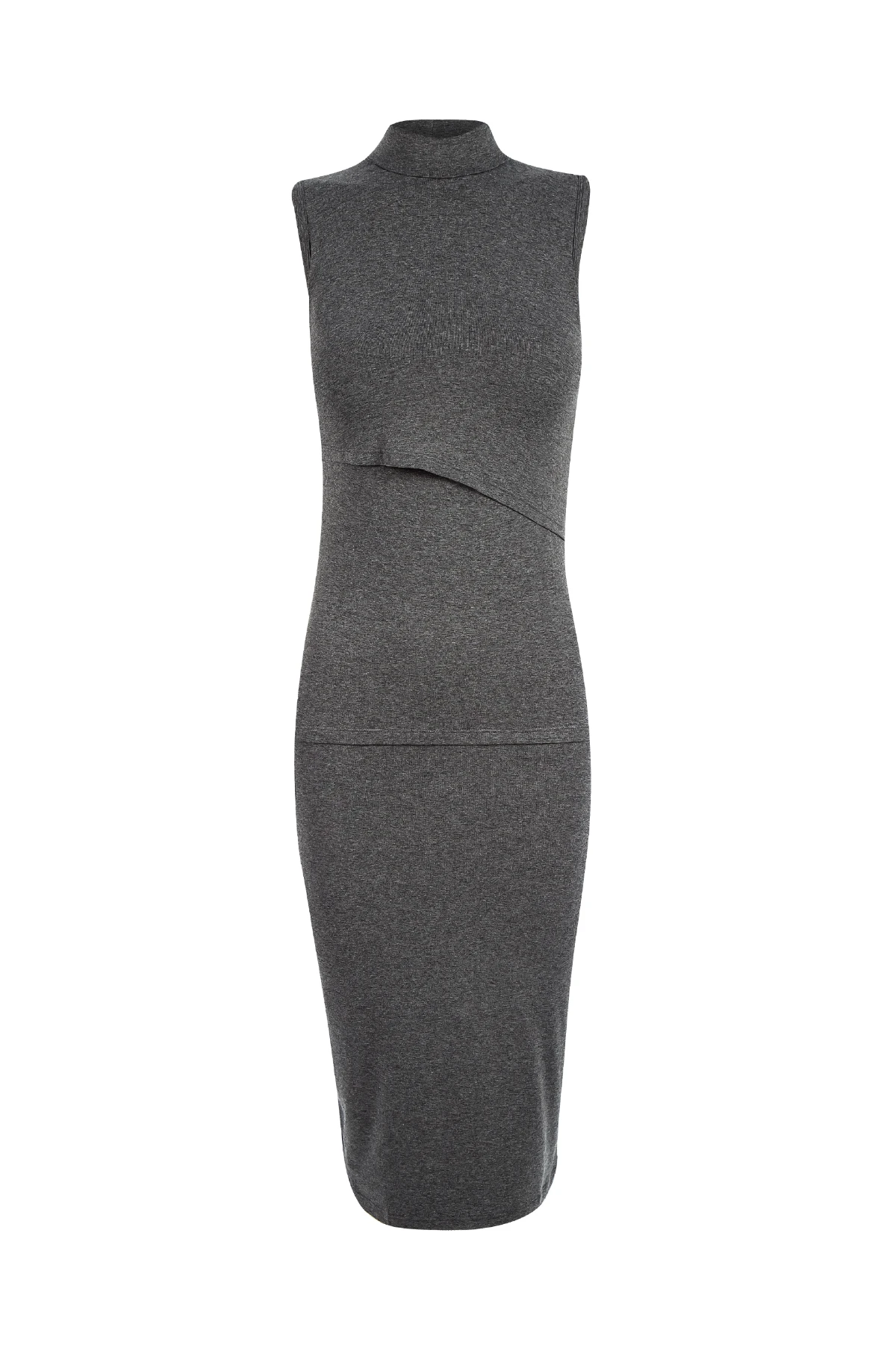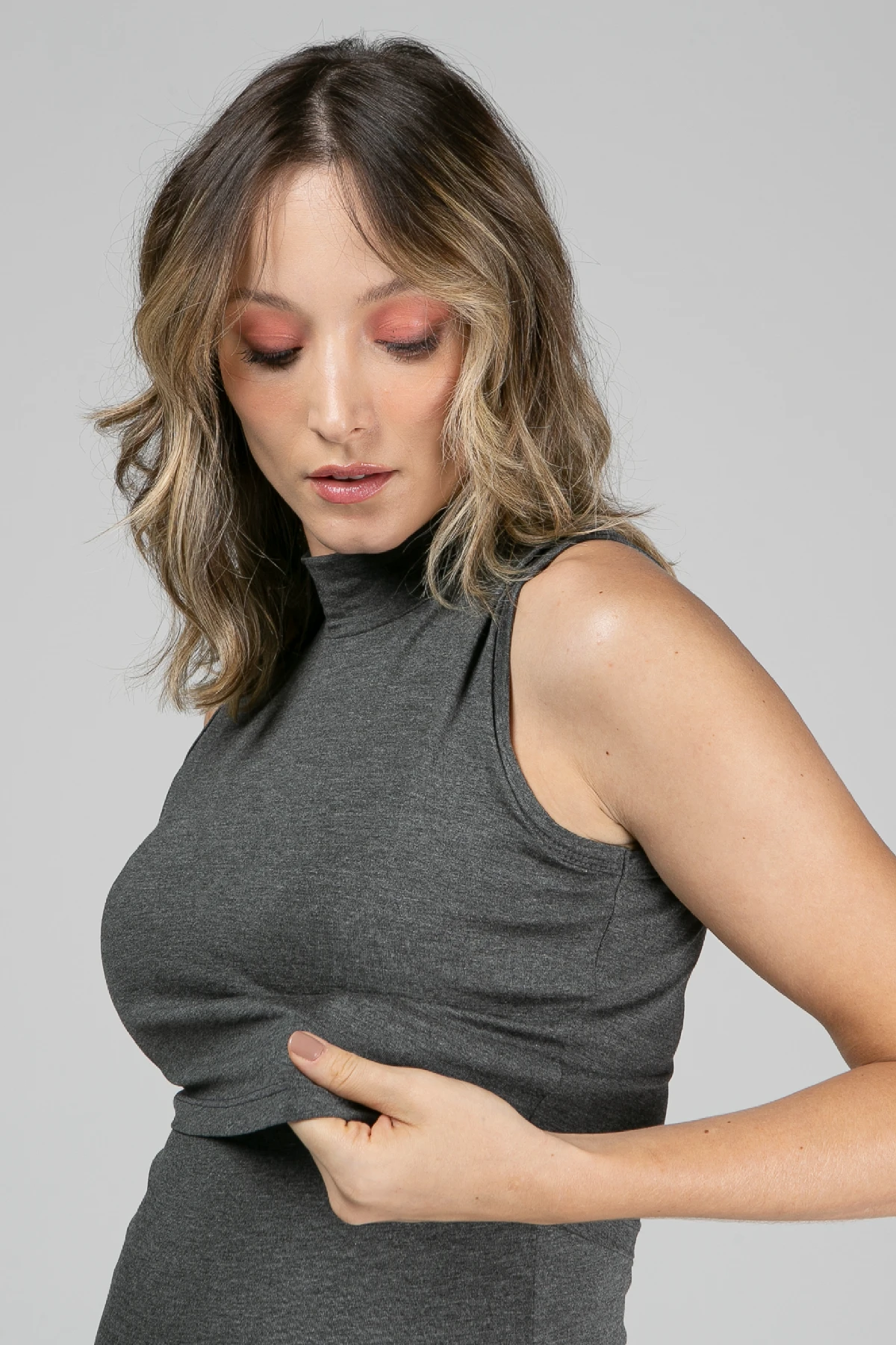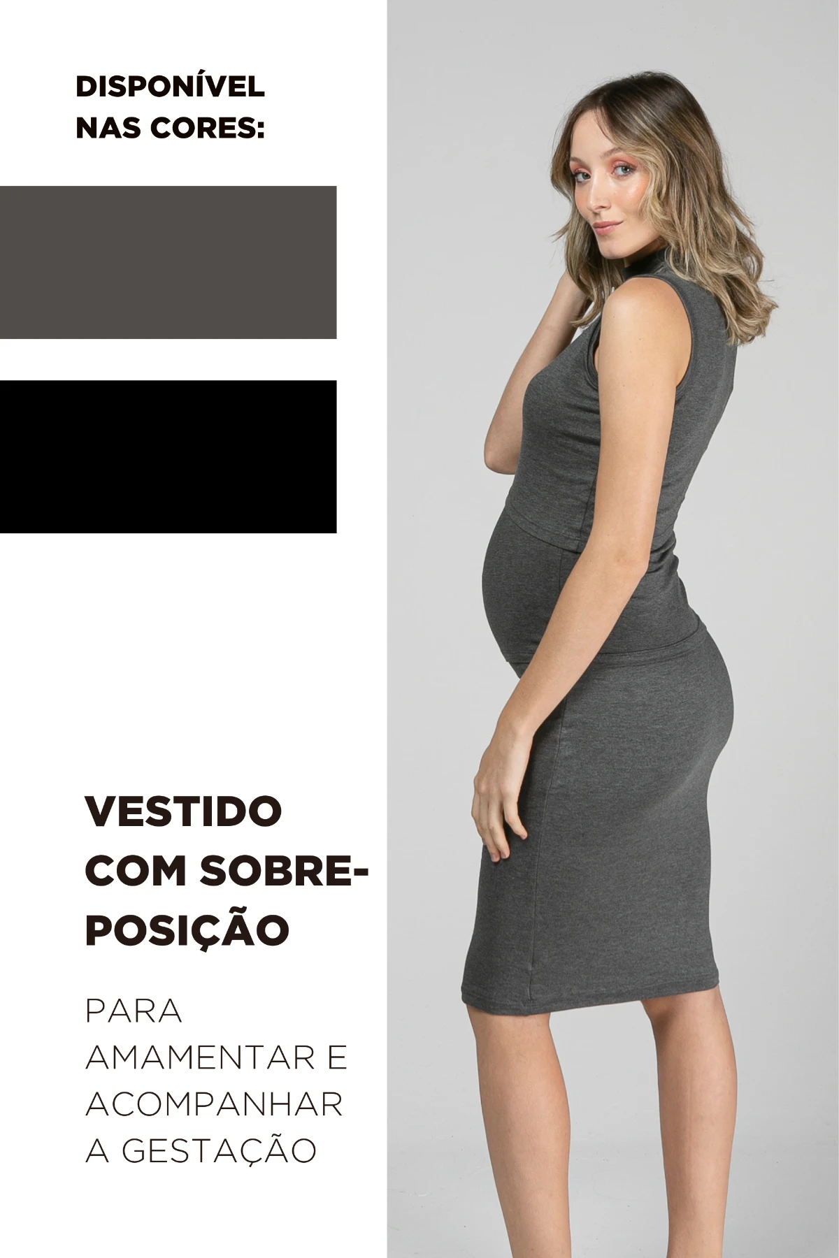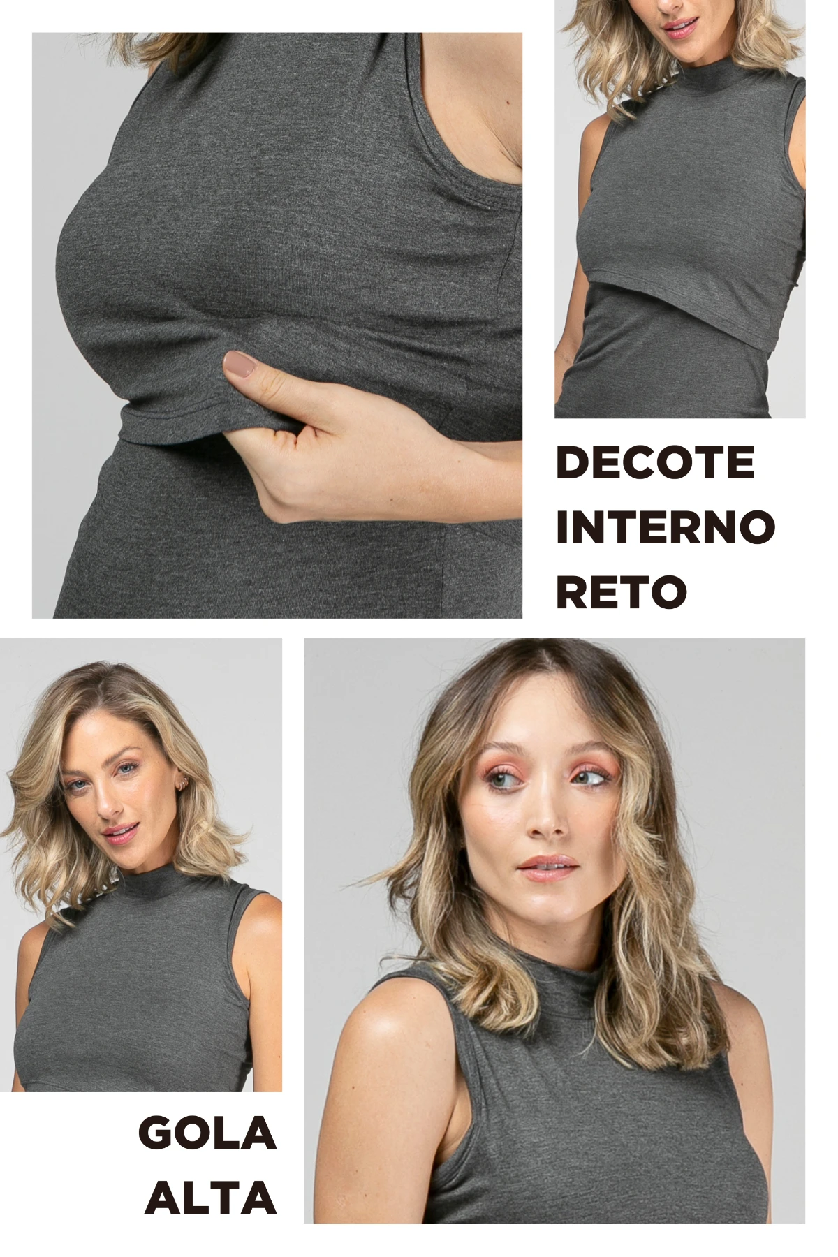 O Vestido Amamentação Carmela resolve isso com viscolycra de alta elasticidade, corte regata elegante, gola alta e comprimento midi.