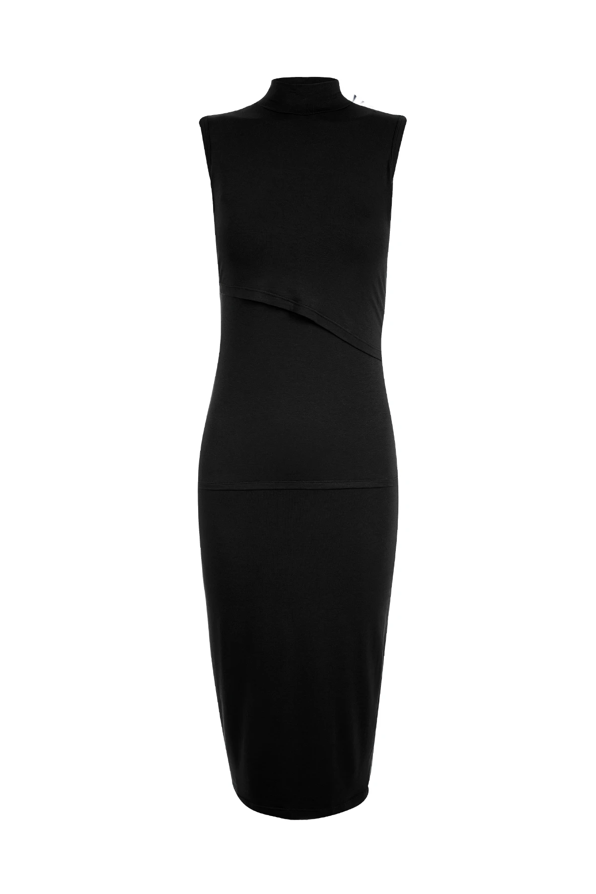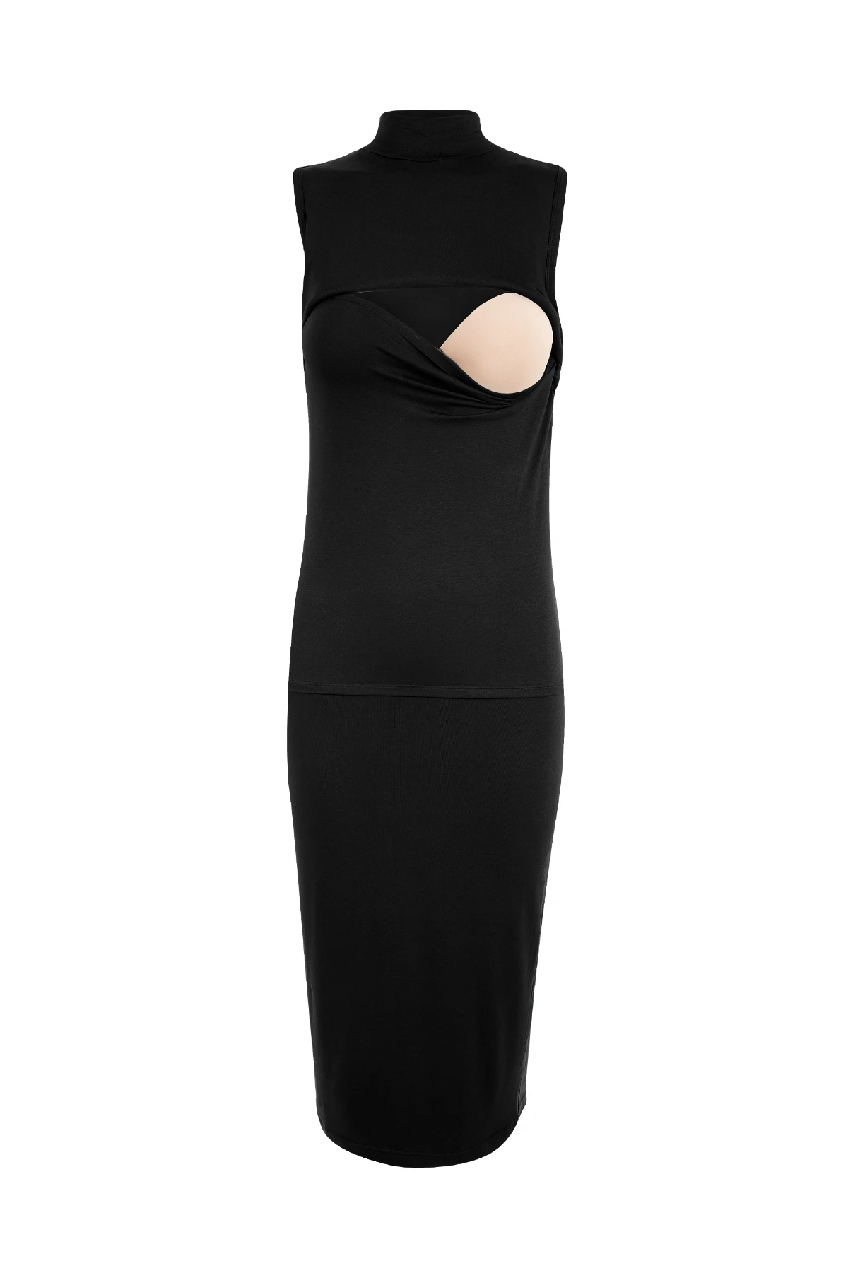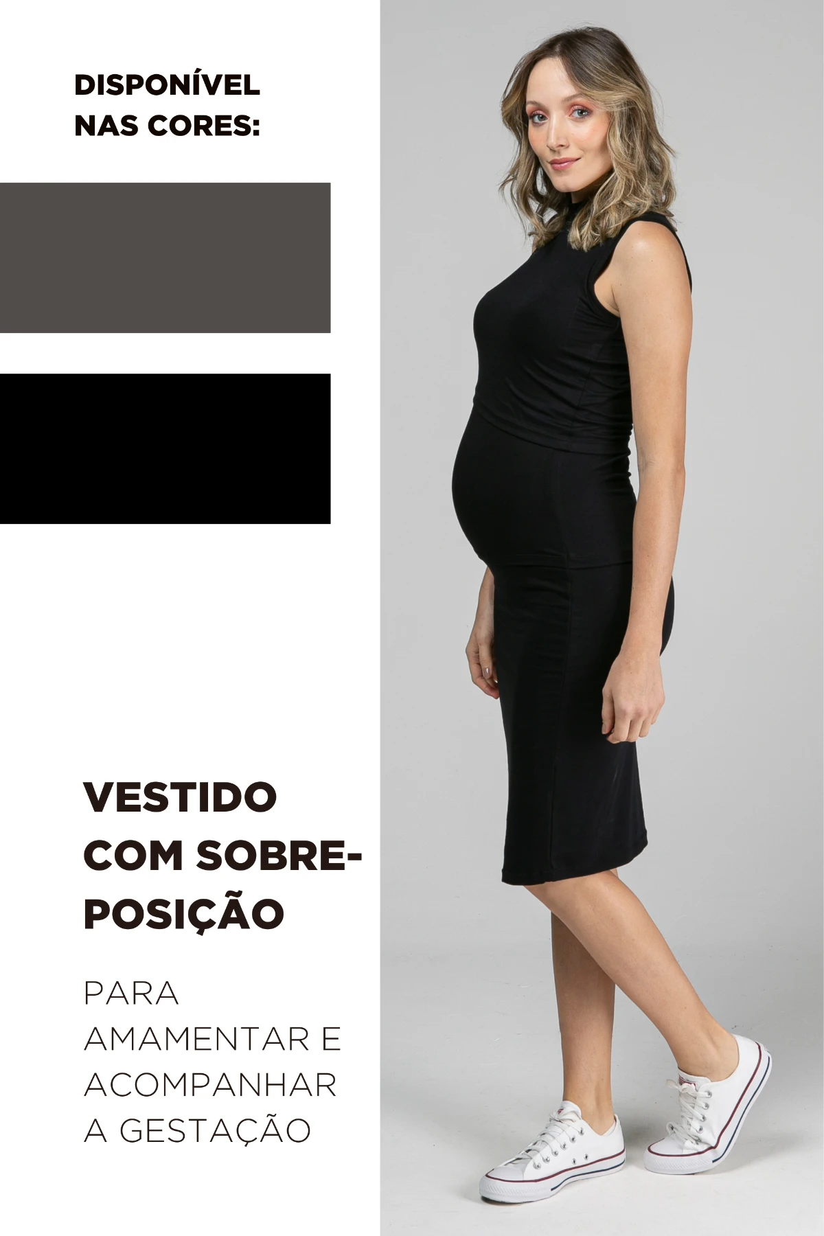 O Vestido Amamentação Carmela resolve isso com viscolycra de alta elasticidade, corte regata elegante, gola alta e comprimento midi.