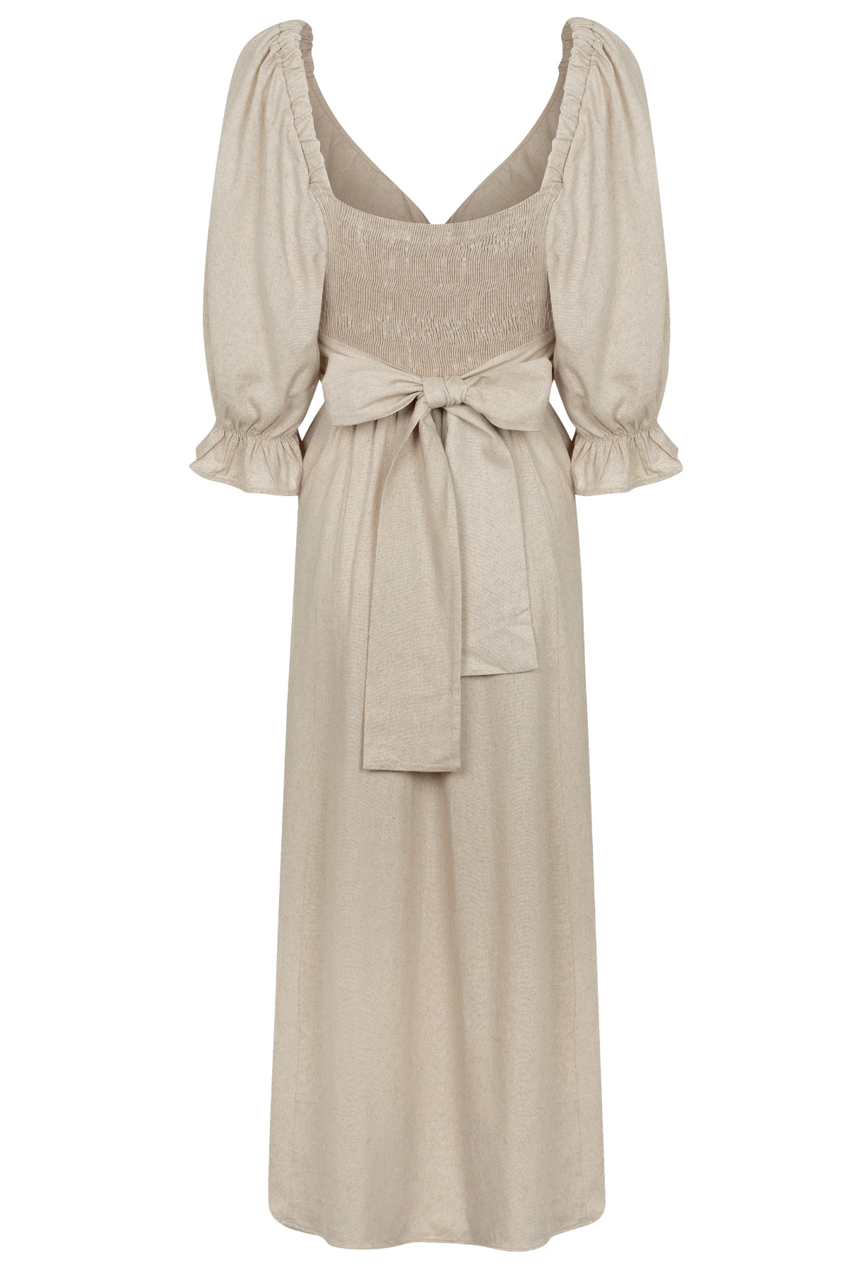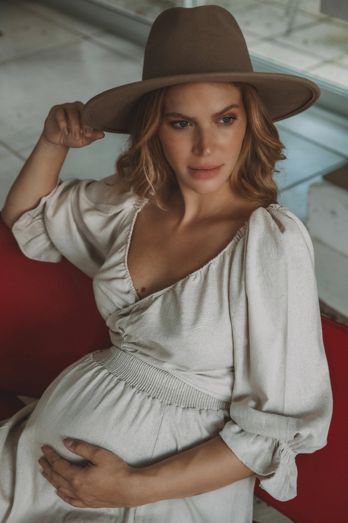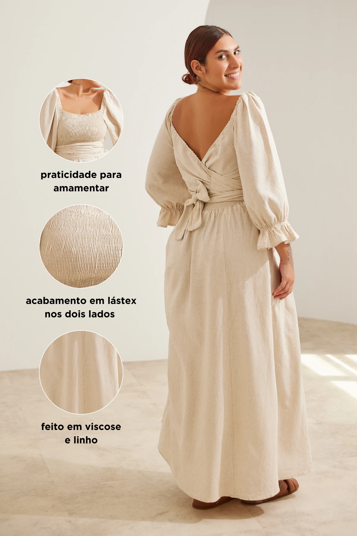 Pensando nisso, o Vestido Mil Looks foi confeccionado para multiplicar possibilidades: a construção em linho de caimento sutil aceita usar qualquer lado como frente, o decote transpassado pode ficar na frente ou atrás, e as amarrações são feitas para criar diferentes efeitos — realçar a cintura, drapear a lateral ou ajustar o decote para amamentar com discrição.