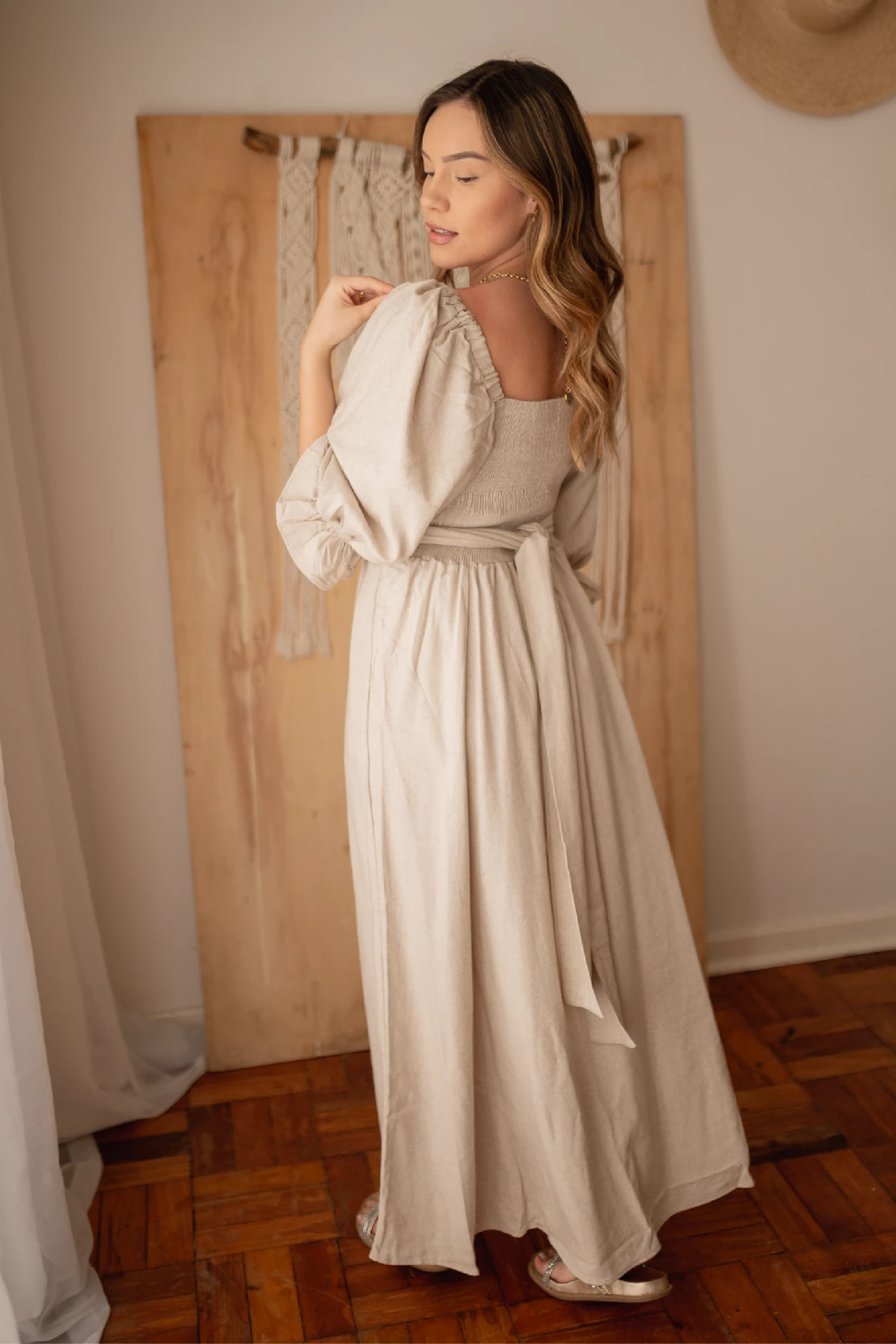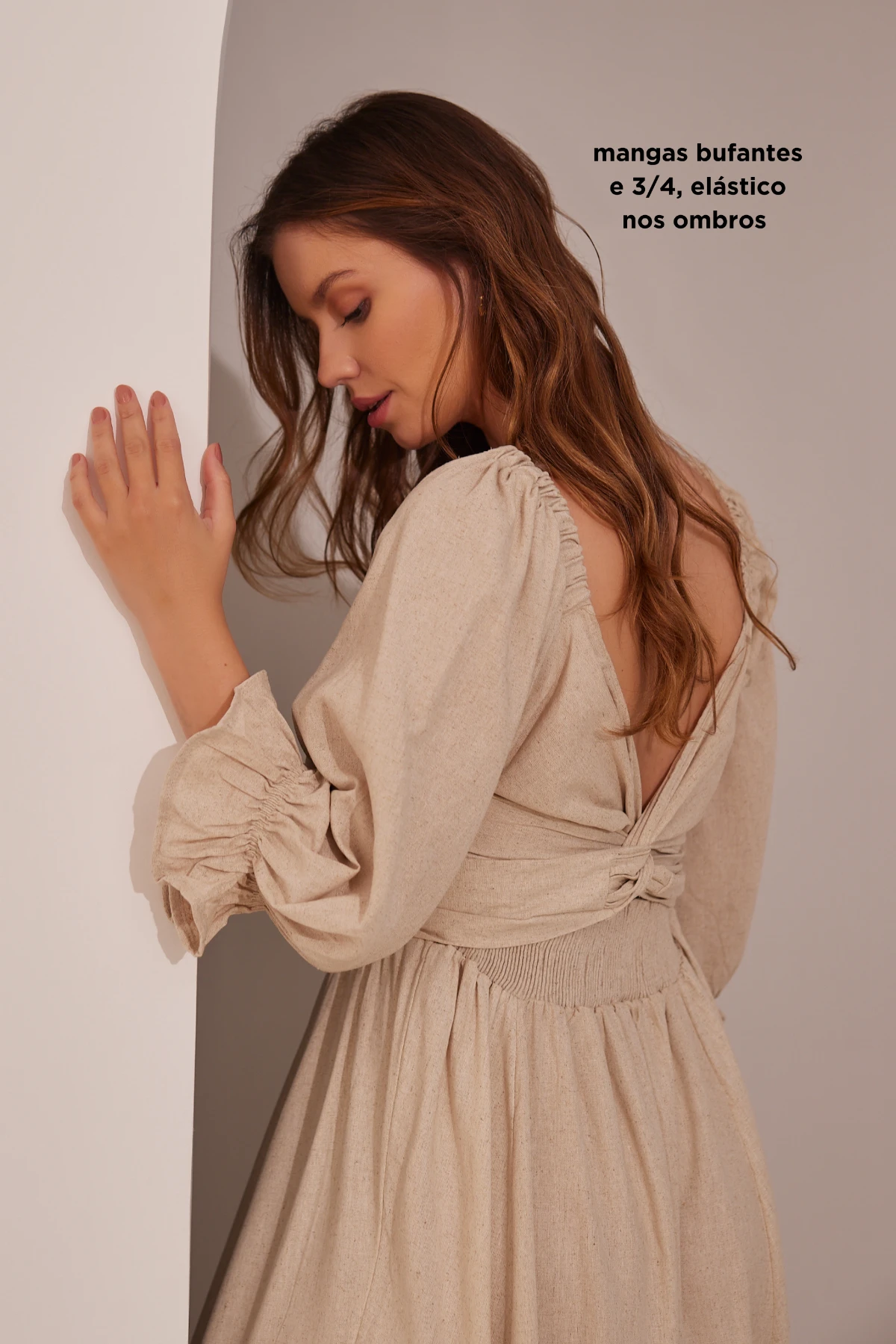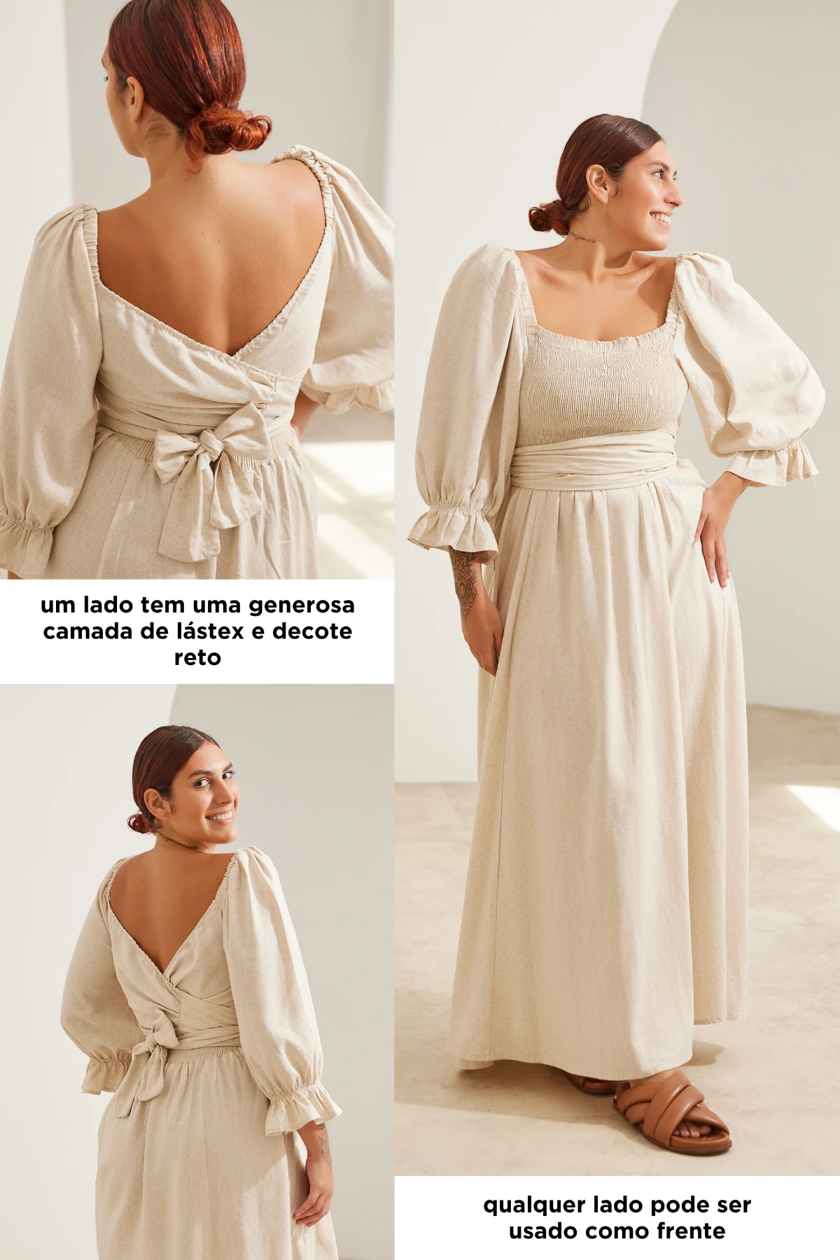 O Vestido Mil Looks resolve isso: vestido midi em linho, com mangas bufantes, decote transpassado que pode ser usado na frente ou atrás e amarrações multiuso que permitem várias formas de ajustar e drapear.