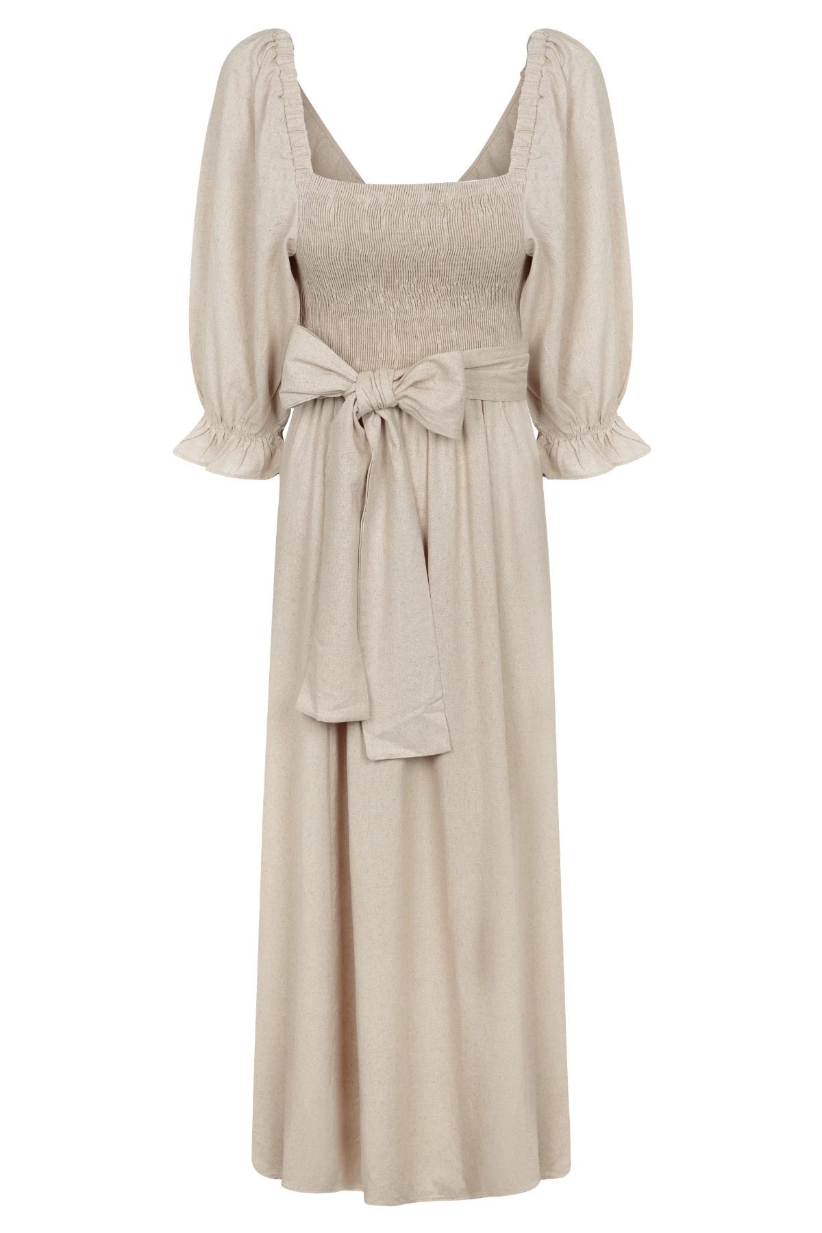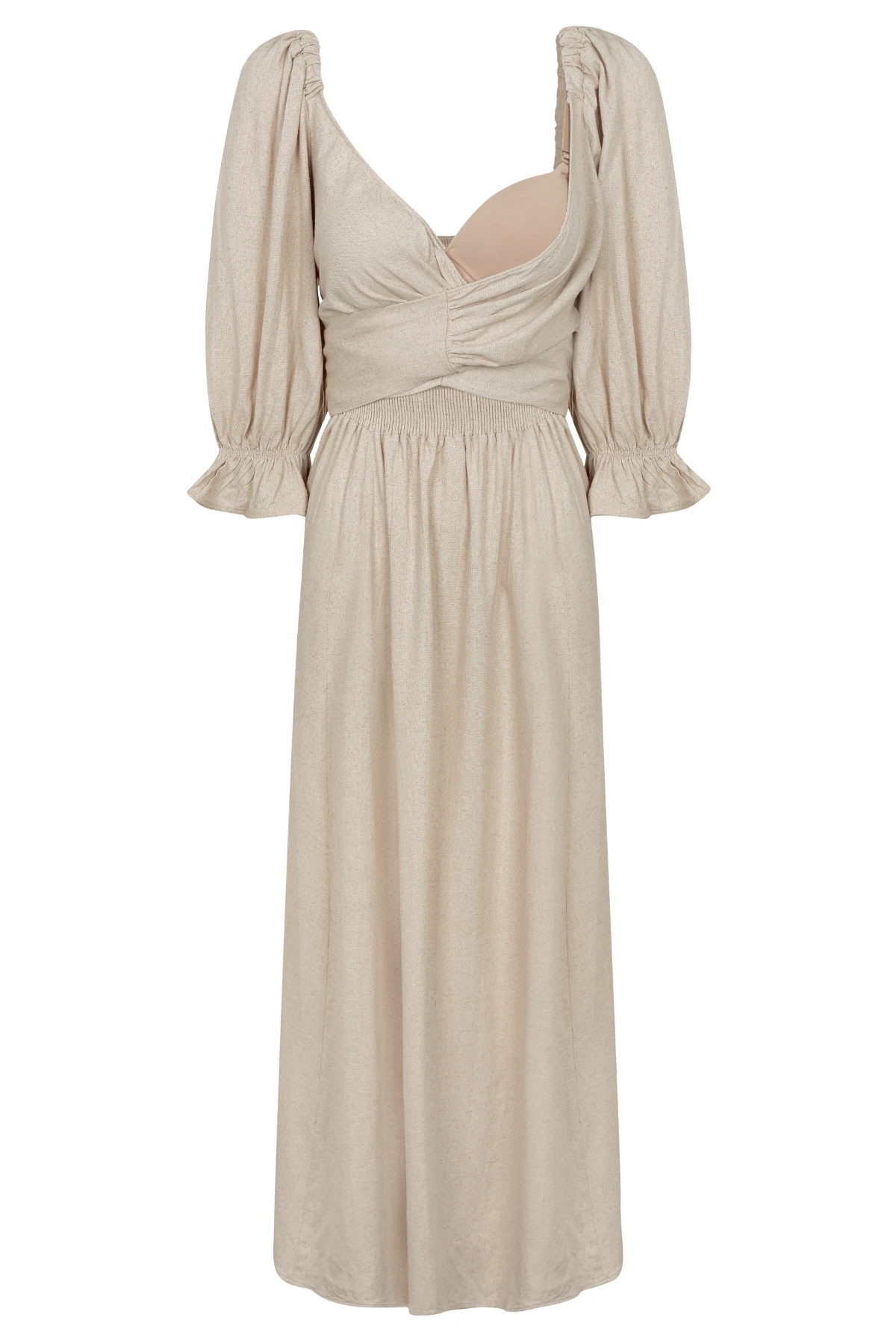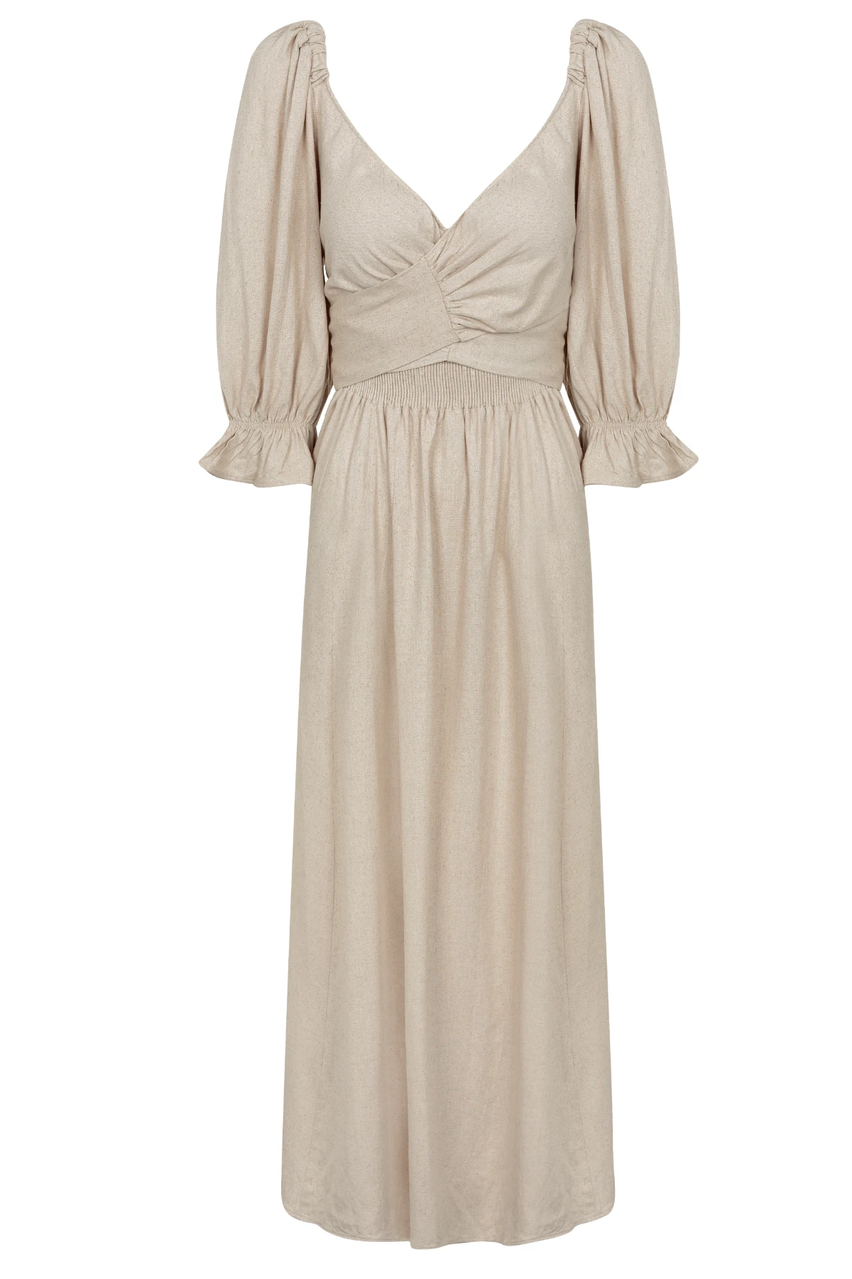 O Vestido Mil Looks resolve isso: vestido midi em linho, com mangas bufantes, decote transpassado que pode ser usado na frente ou atrás e amarrações multiuso que permitem várias formas de ajustar e drapear.