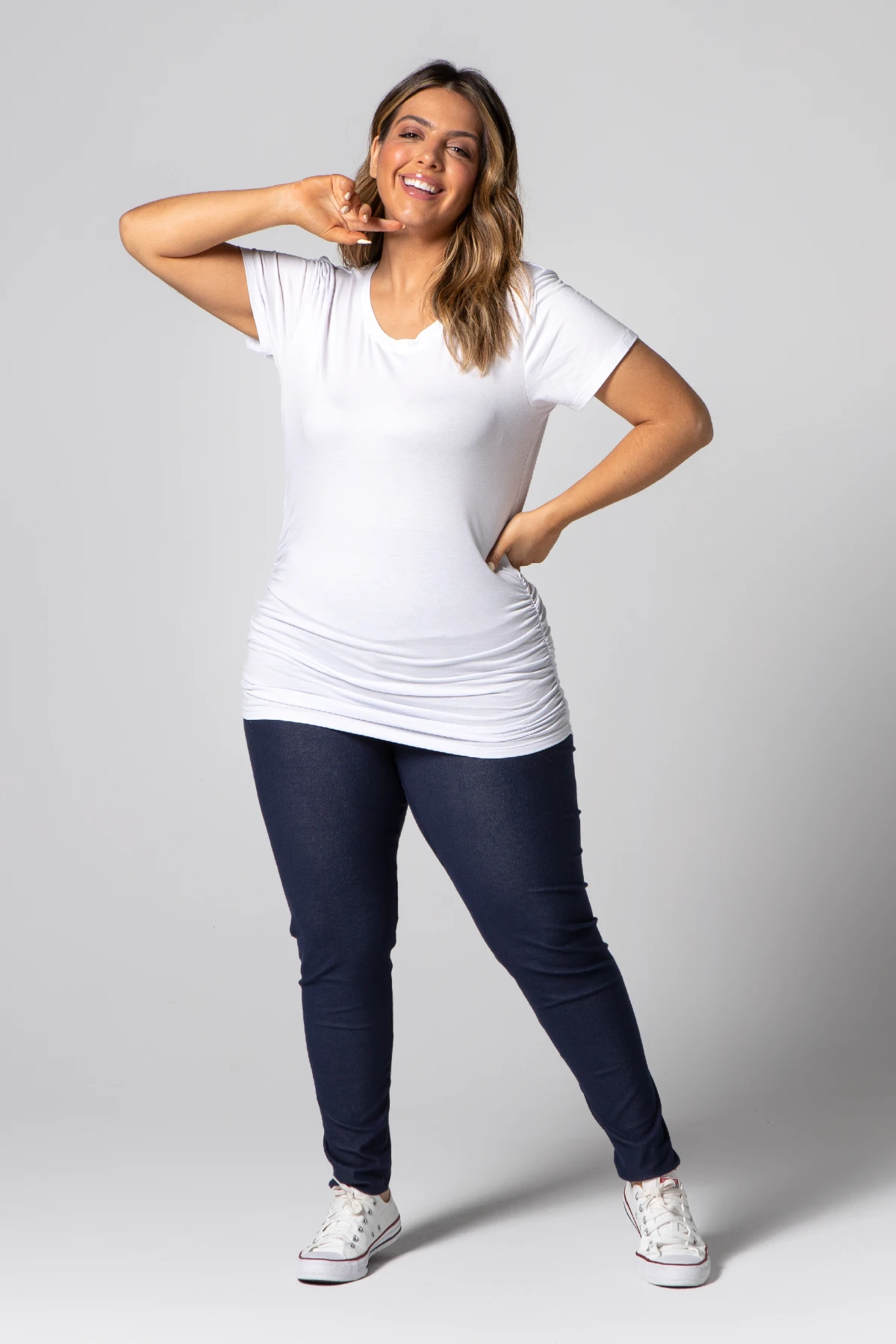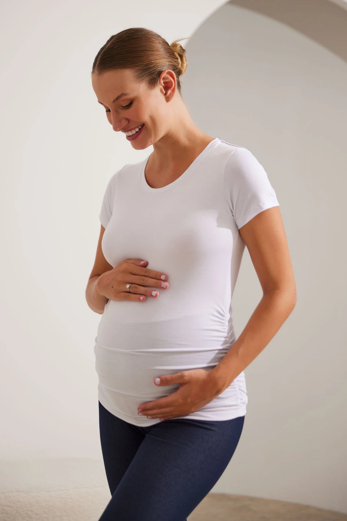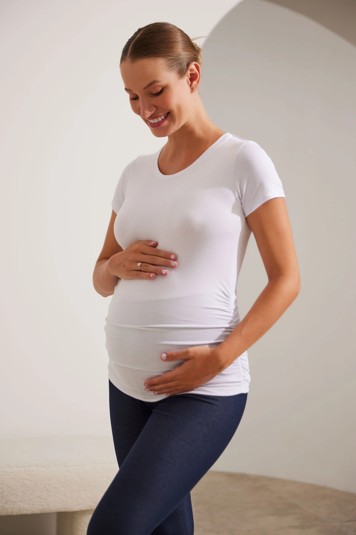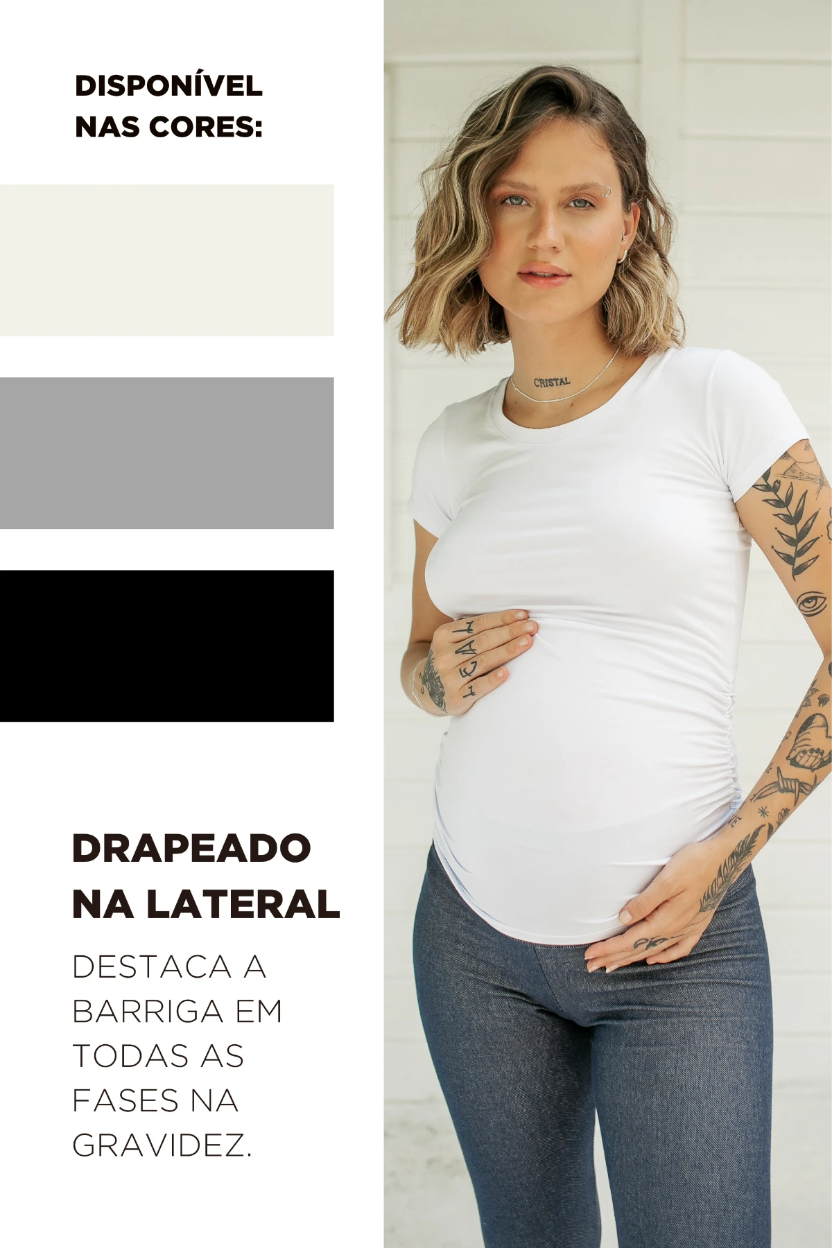 A Camiseta Gestante Estica e Vai é a resposta: confeccionada em viscolycra (viscose + elastano), tem drapeado lateral que molda a barriga e comprimento pensado para cobrir o bumbum.