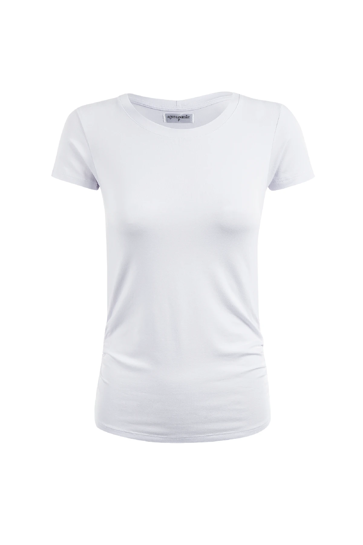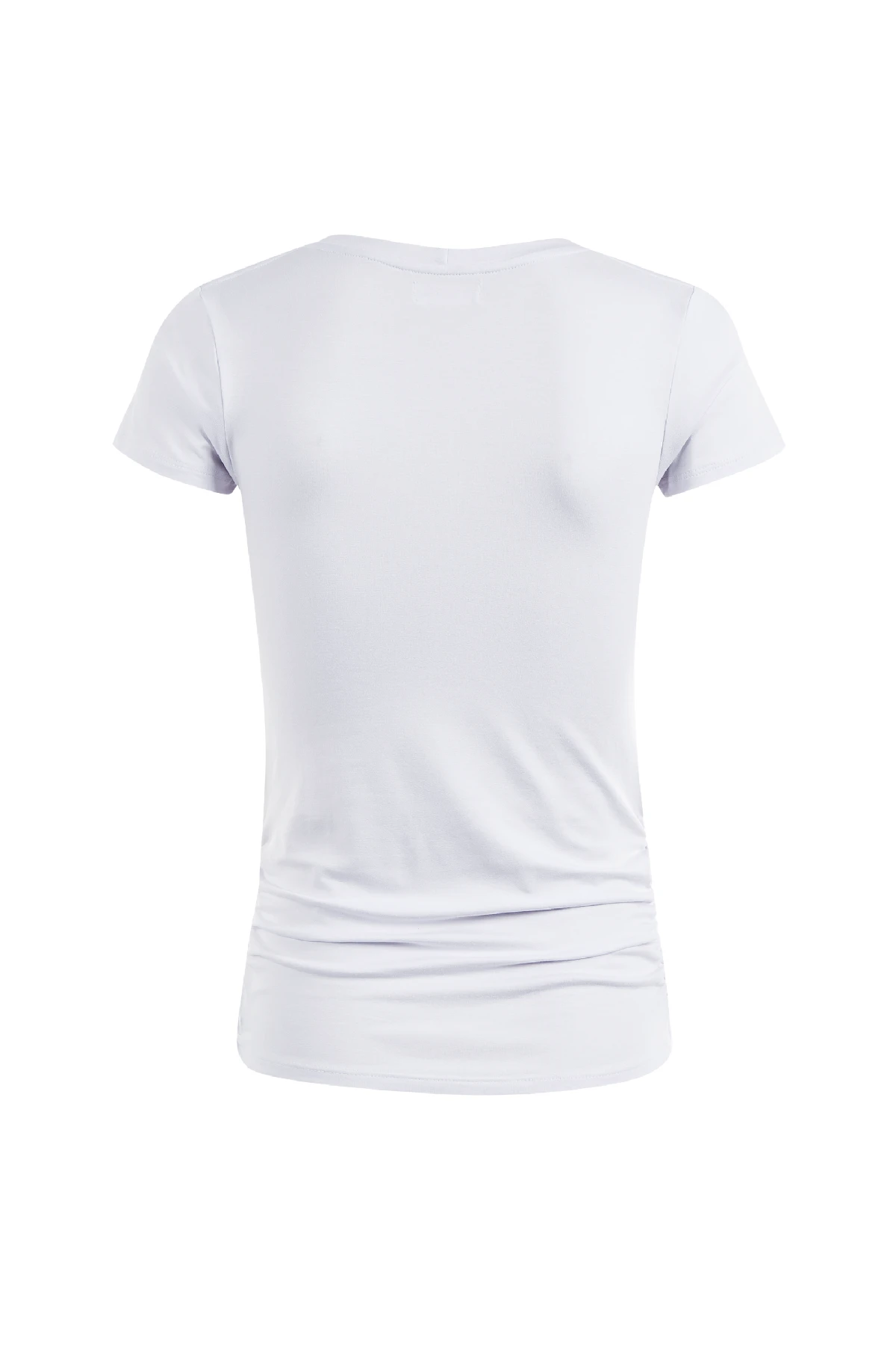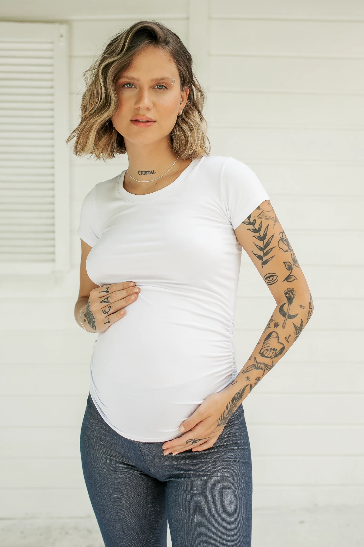 Por isso criamos a Camiseta Estica e Vai: a malha em viscolycra oferece elasticidade no ponto certo, enquanto os drapeados laterais acomodam e valorizam a barriga sem apertar.