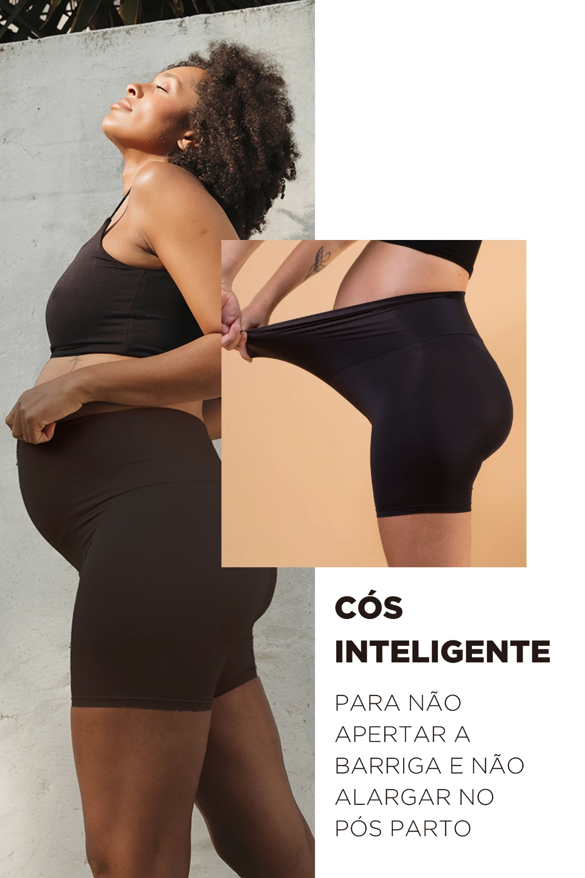 O cós anatômico não aperta a barriga e mantém o ajuste no pós-parto — discreto, prático e ideal para usar todos os dias.