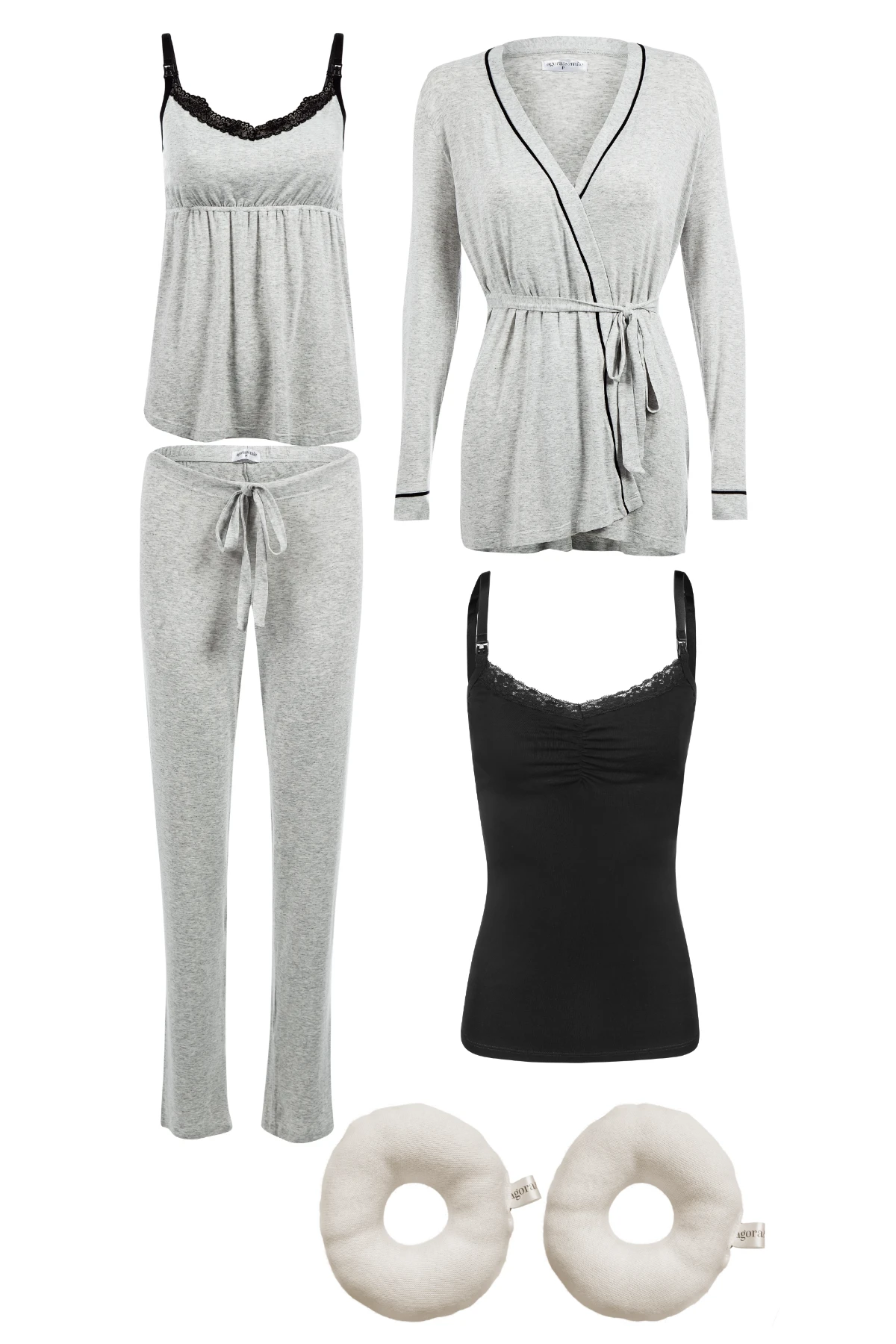 Um conjunto pensado para os primeiros dias da maternidade: pijama 3 peças (regata, calça e robe) com fecho click, regata 2 em 1 para gestação e amamentação e um par de rosquinhas de amamentação em algodão orgânico. Cada peça foi pensada para oferecer praticidade e conforto.