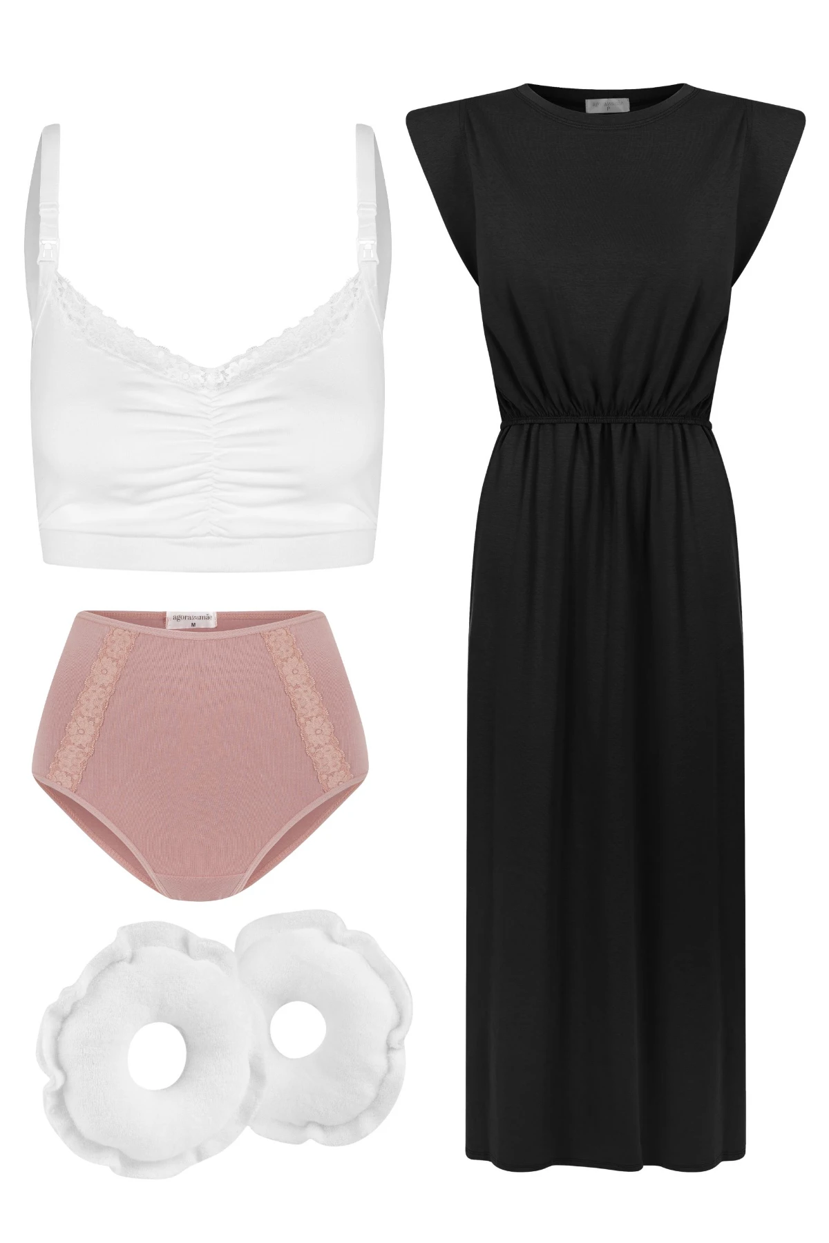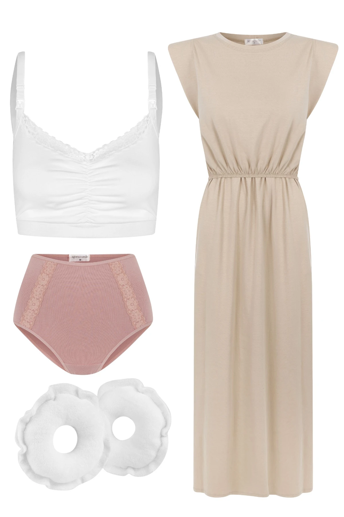Kit maternidade com 4 peças: vestido versátil para todas as fases, top e calcinha em algodão e rosquinhas protetoras para amamentação.